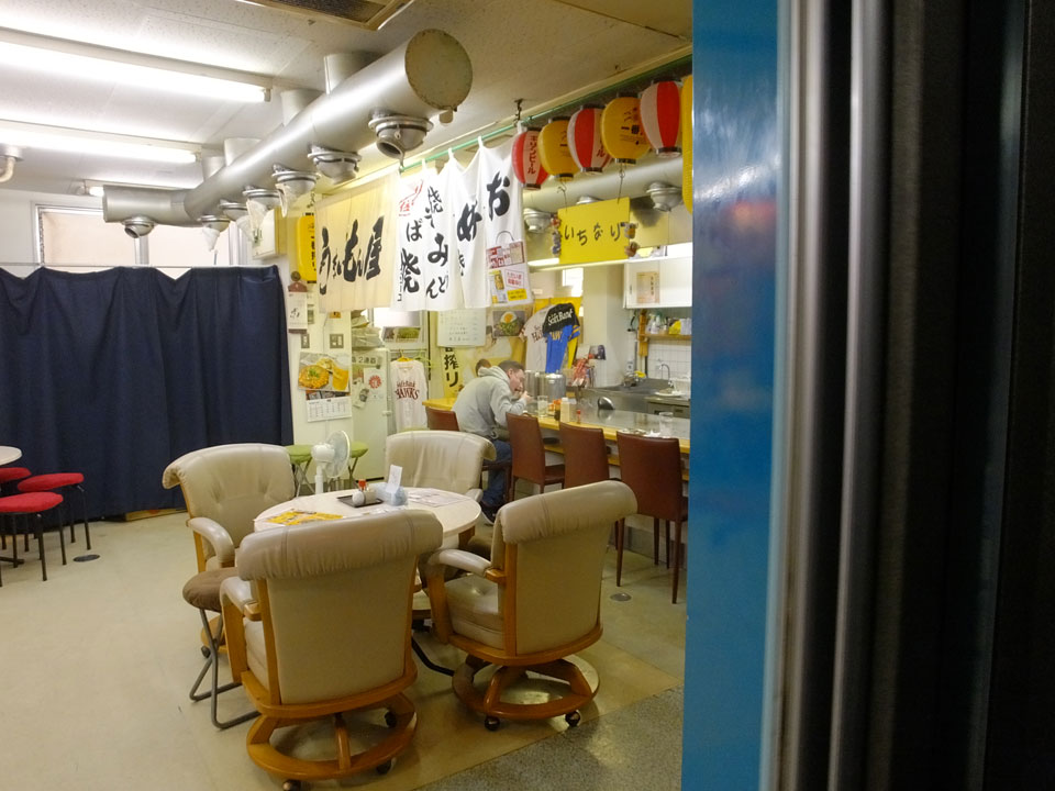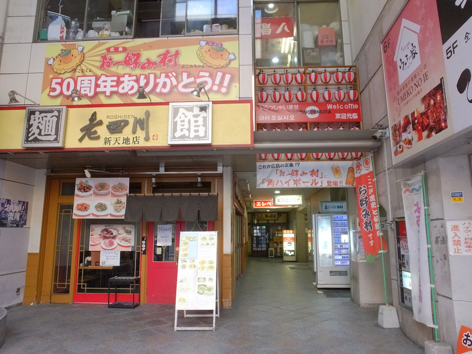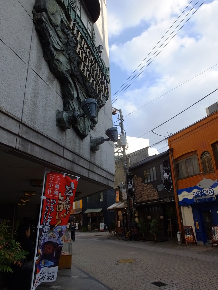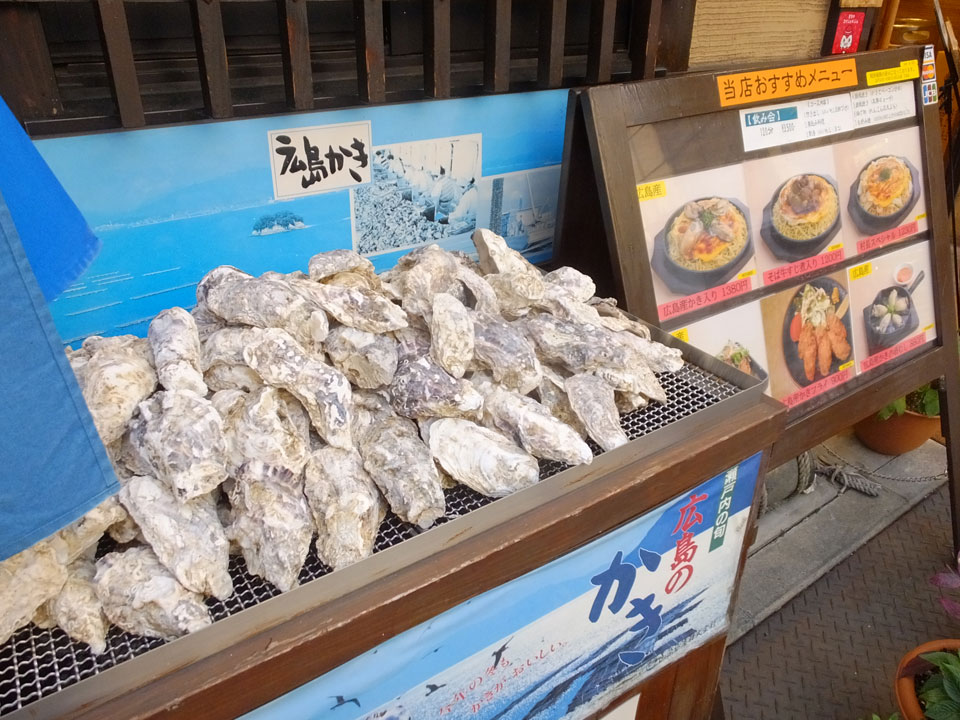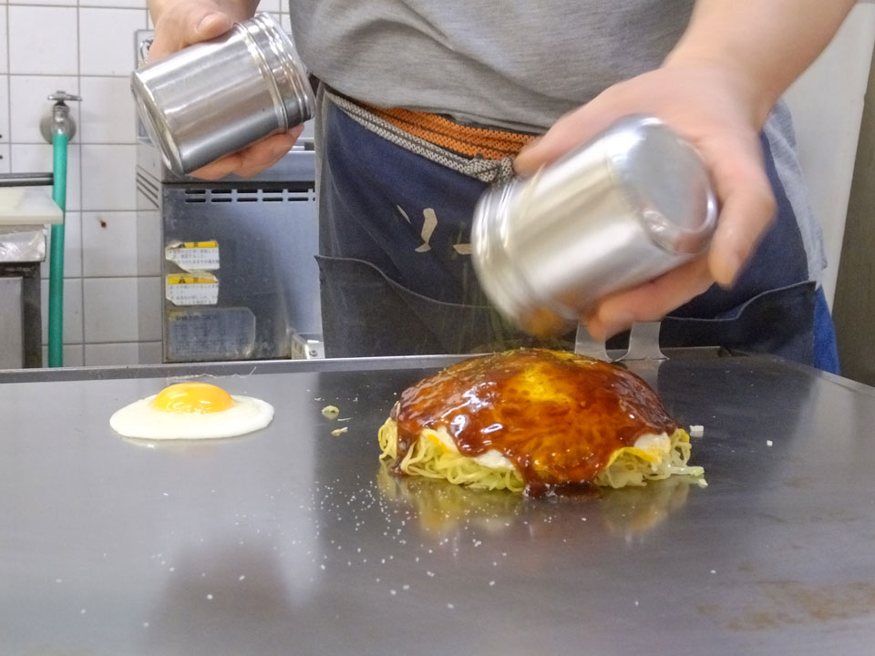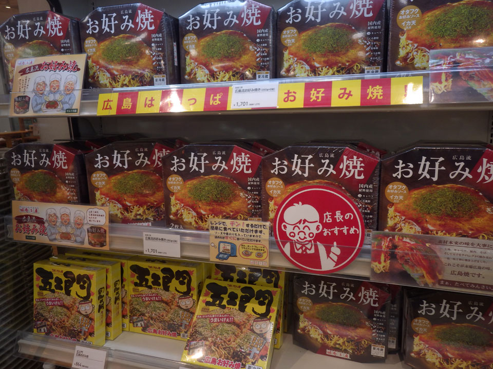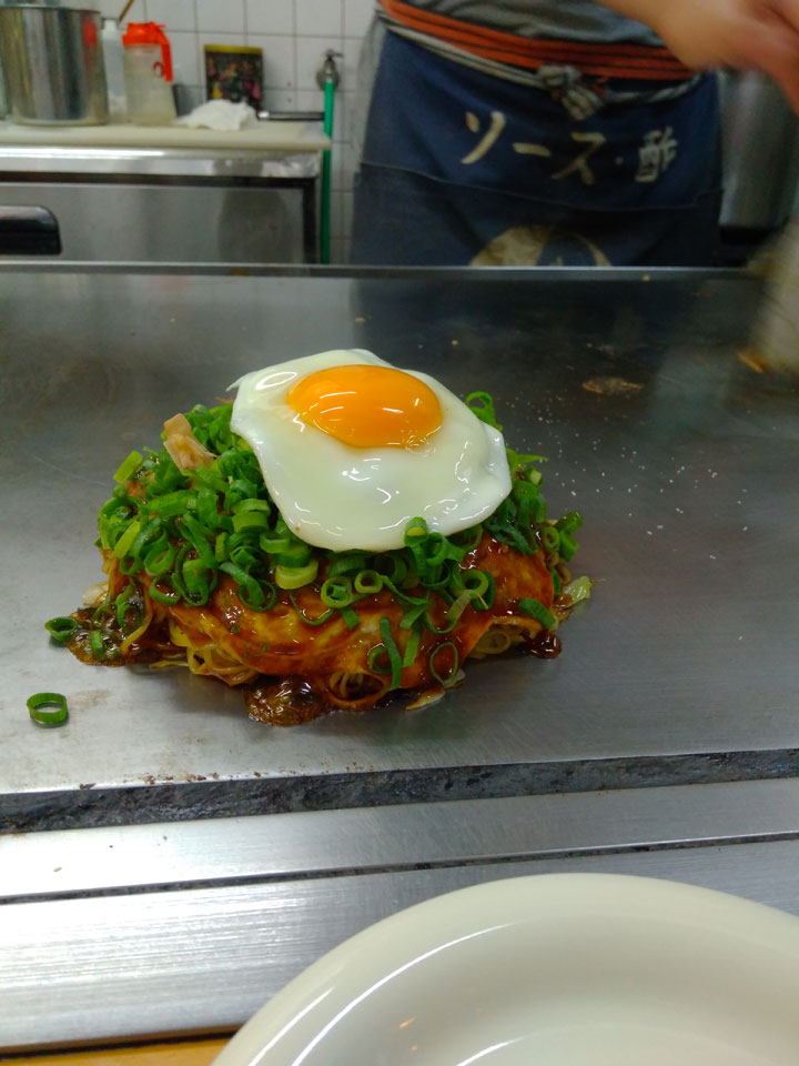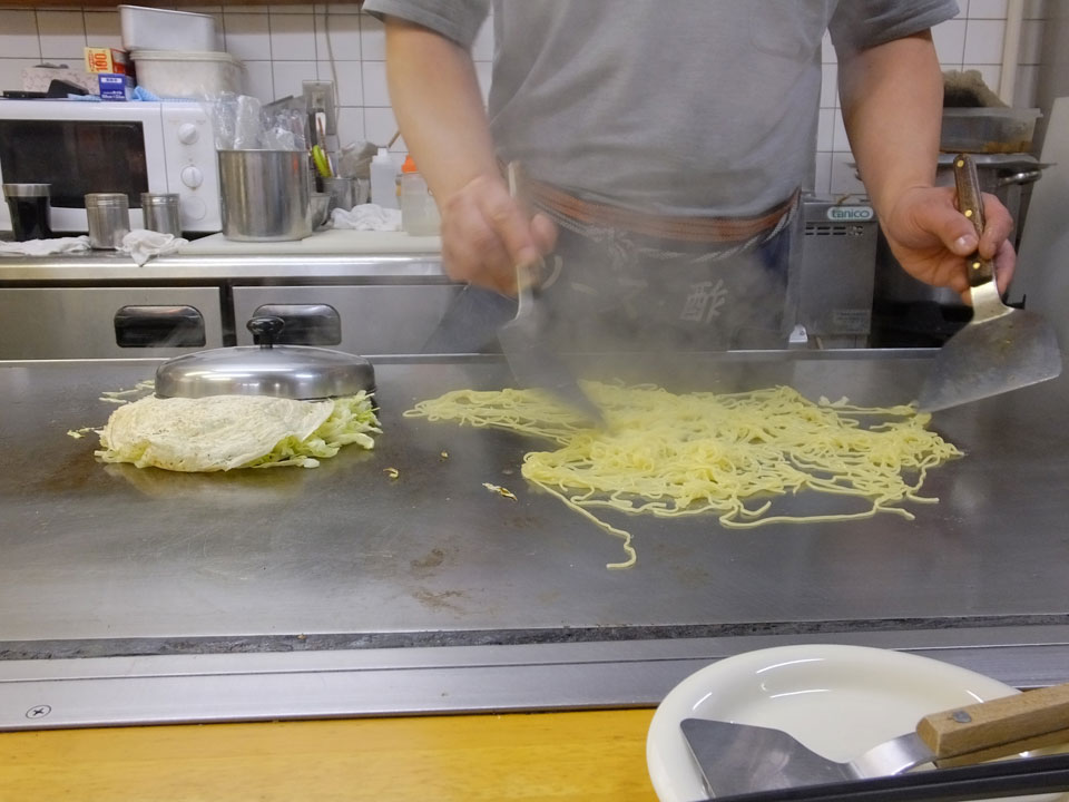 Zurück zur Okonomiyaki-Gegend wollte ich die für Hiroshima typische Version mit Nudeln probieren. In der zweiten Etage eines Hauses, bestellte ich mir sowas und schaute dem Koch zu. Man konnte da direkt vom heißen Blech essen. Es schmeckte super. Gut, dass ich das doch noch mitnehmen konnte.