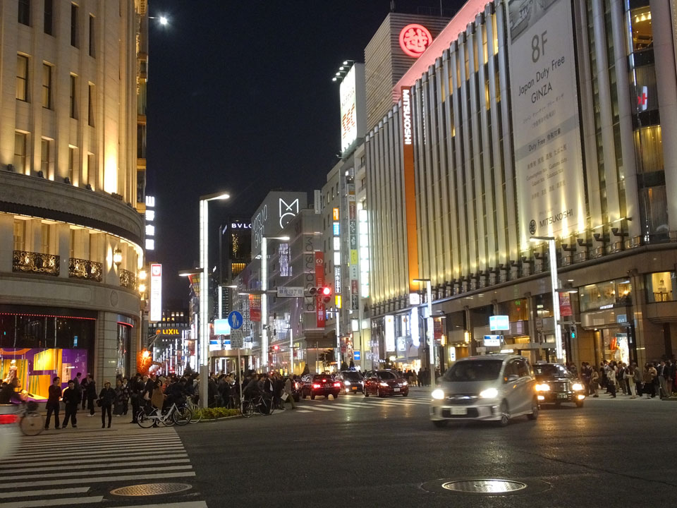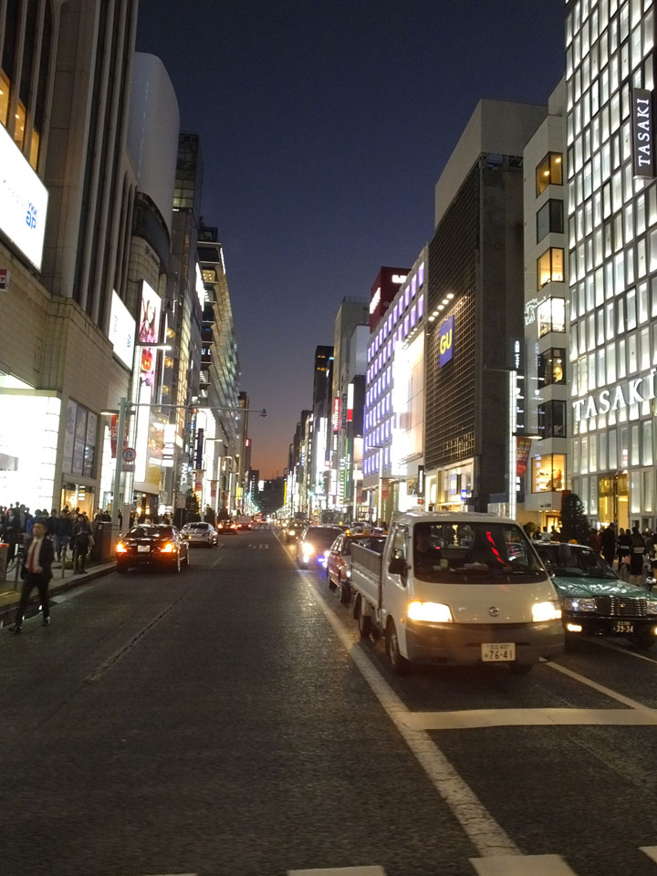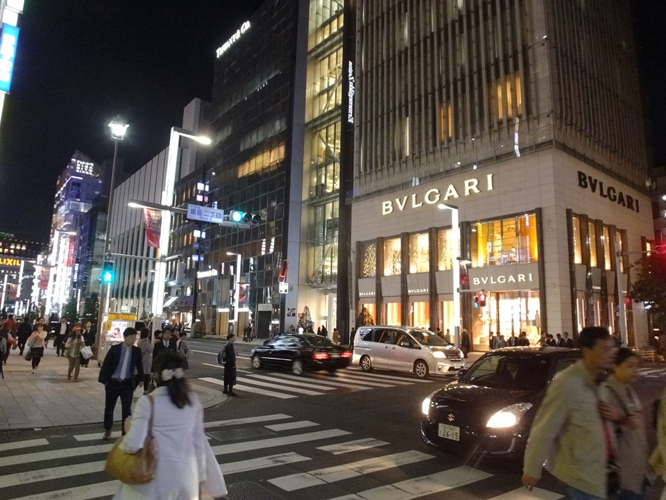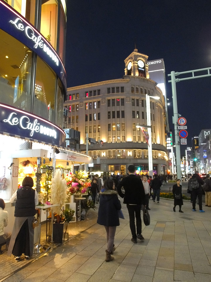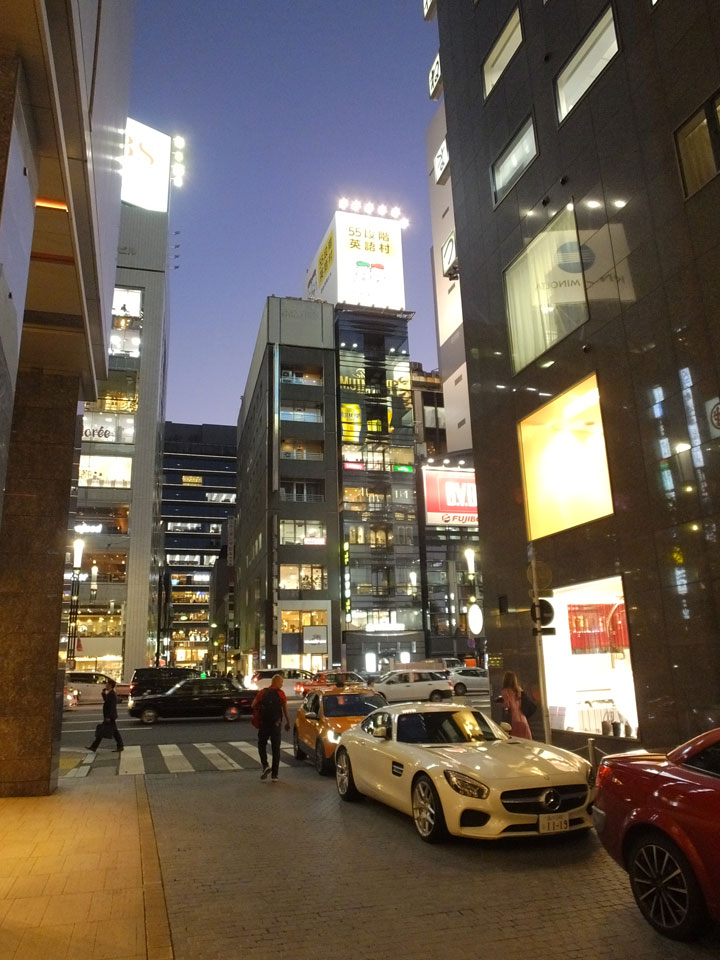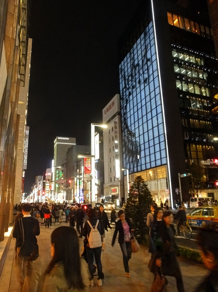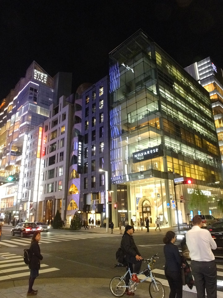 Dieser exklusive Bezirk Tokyos, glänzt und leuchtet noch immer fantastisch. Ich staunte über die unterschiedliche Atmosphäre im Vergleich zu Roppongi oder Shibuya. Alle Leute sind fein angezogen. Jetzt Abends war Berufsverkehr, die Metro war voll.