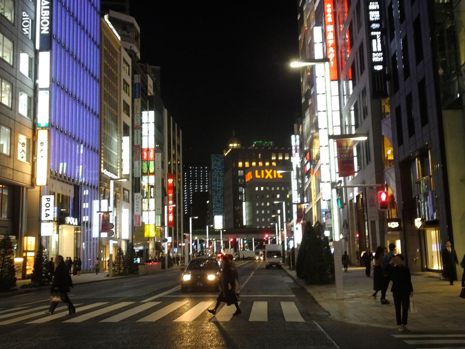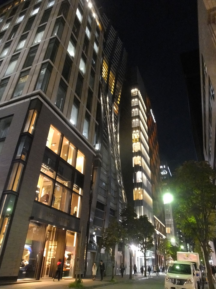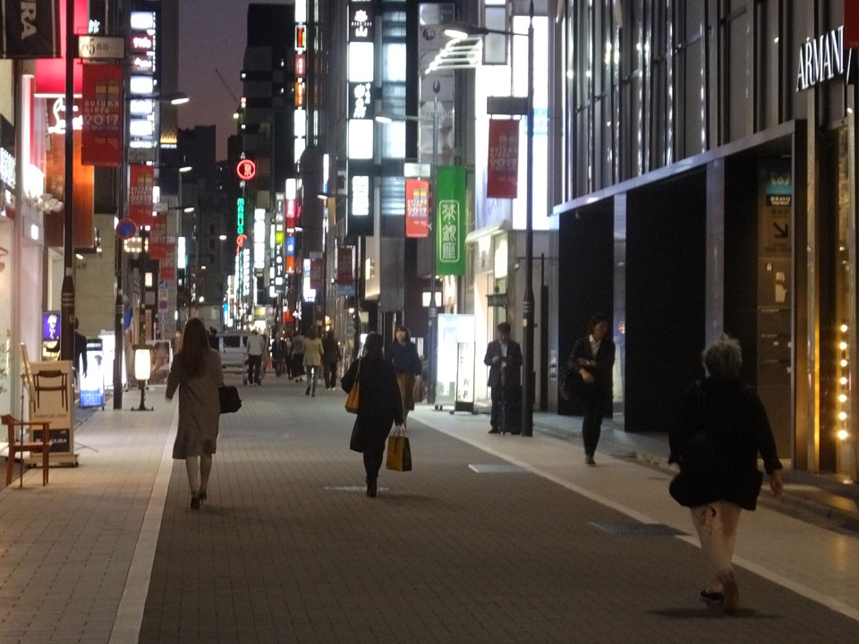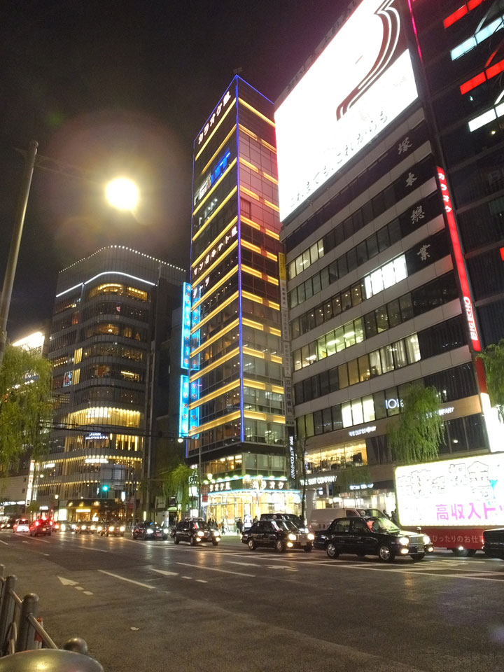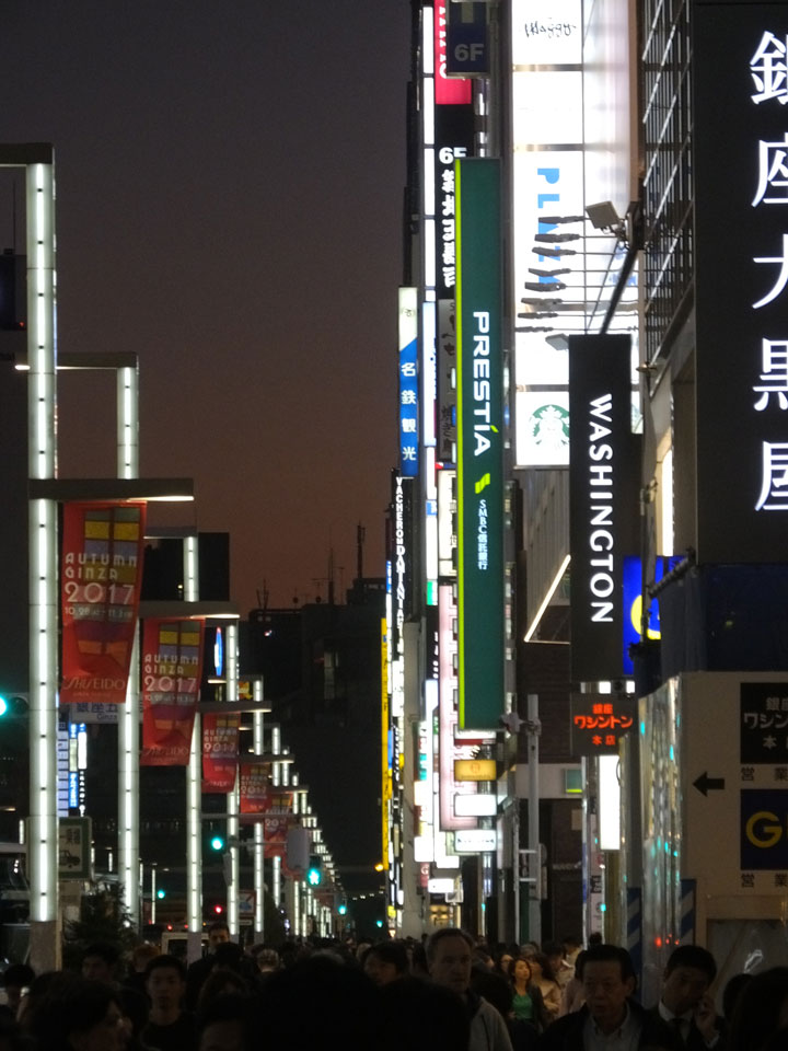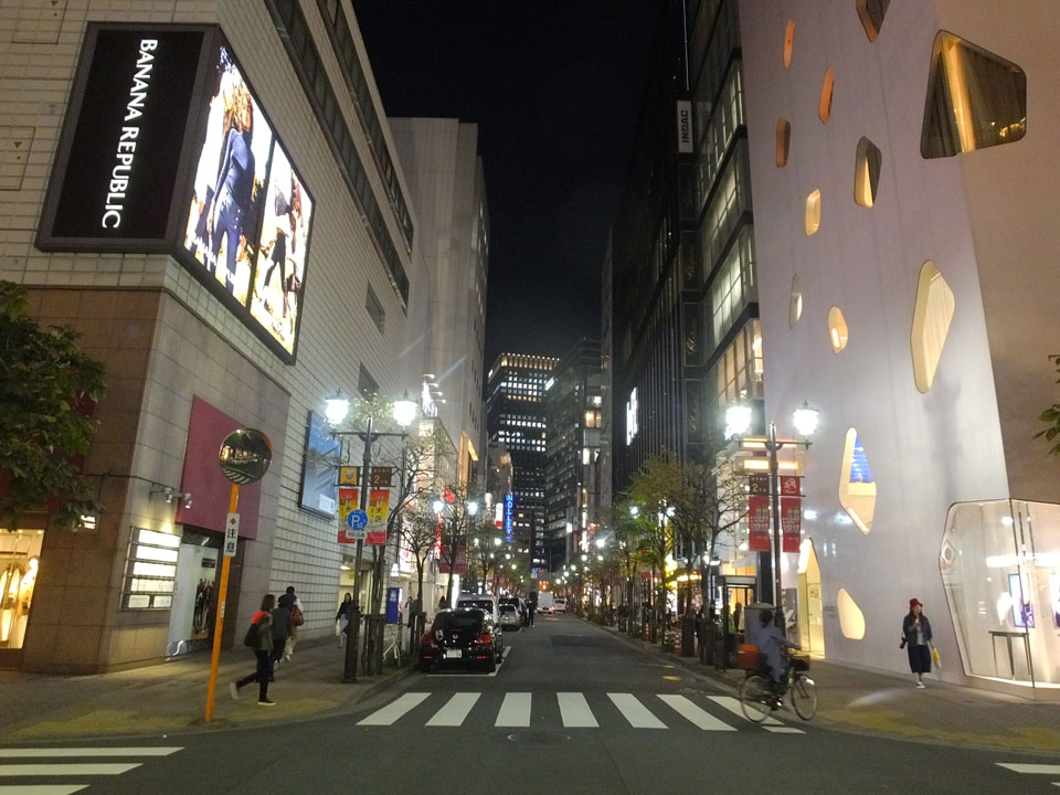 Dieser exklusive Bezirk Tokyos, glänzt und leuchtet noch immer fantastisch. Ich staunte über die unterschiedliche Atmosphäre im Vergleich zu Roppongi oder Shibuya. Alle Leute sind fein angezogen. Jetzt Abends war Berufsverkehr, die Metro war voll.