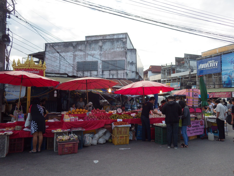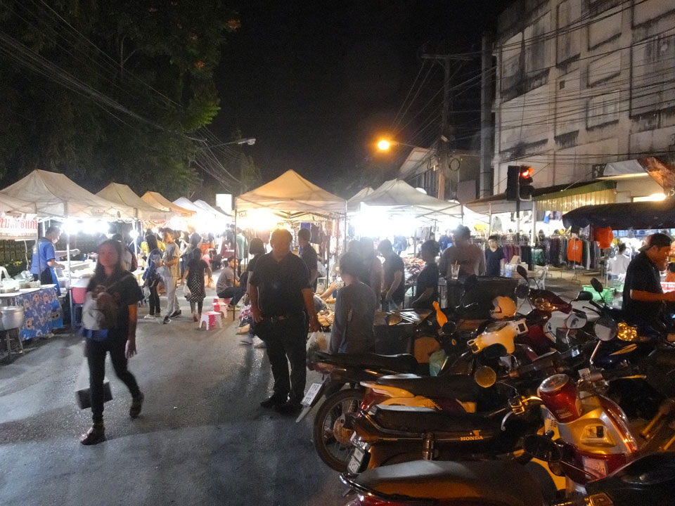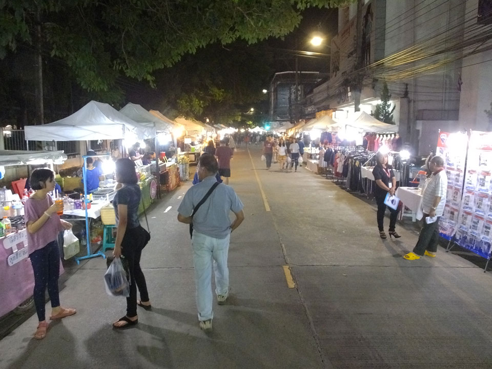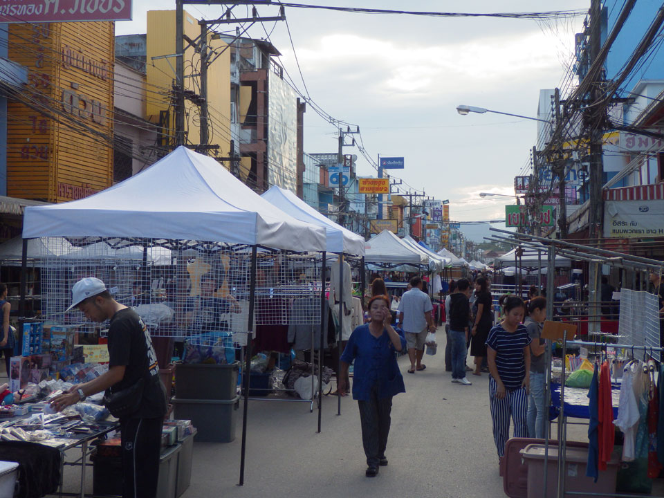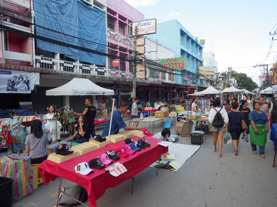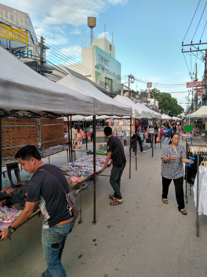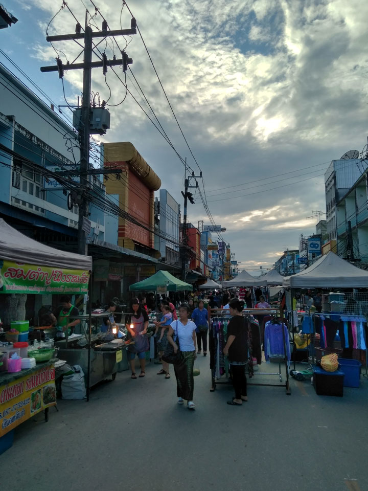 Nach ein paar Minuten chillen im Zimmer schnappte ich meine Kamera ging abends wieder raus – dieses Mal mit dem Ziel Samstags-Markt. Ich probierte da so manches Thai-Food. Alles war super, bis auf die letzte Suppe. Mich überraschte hier, wie groß der Markt doch war. Der lokale Markt braucht sich nicht hinter dem berühmteren von Chiang Mai zu verstecken. Von einem Ende zum anderen brauchte man einige Minuten zu Fuß. Ich fand nur ein T-Shirt (120 THB), ansonsten hatten viele Stände ähnliche Sachen. Von Handyhüllen, über Powerbanks, Kleinkunst, Taschen – alles Mögliche. Nach 22:00 Uhr packten die Händler ihre Sachen zusammen – um 22:30 war Schluss, wie mir die Hotelfrau vorher schon gesagt hatte.