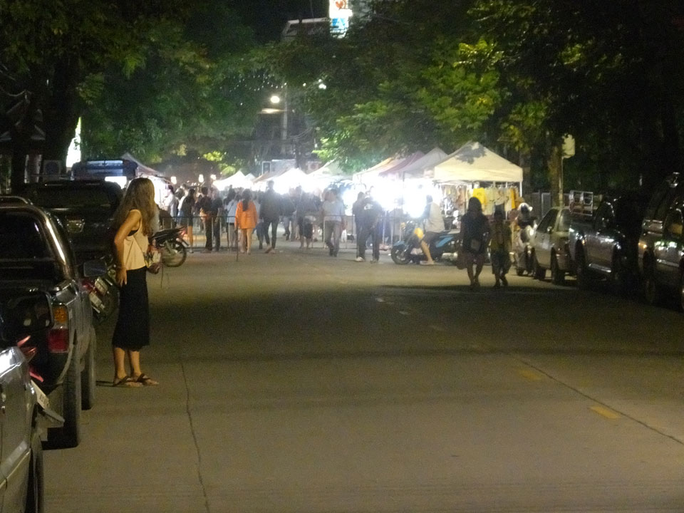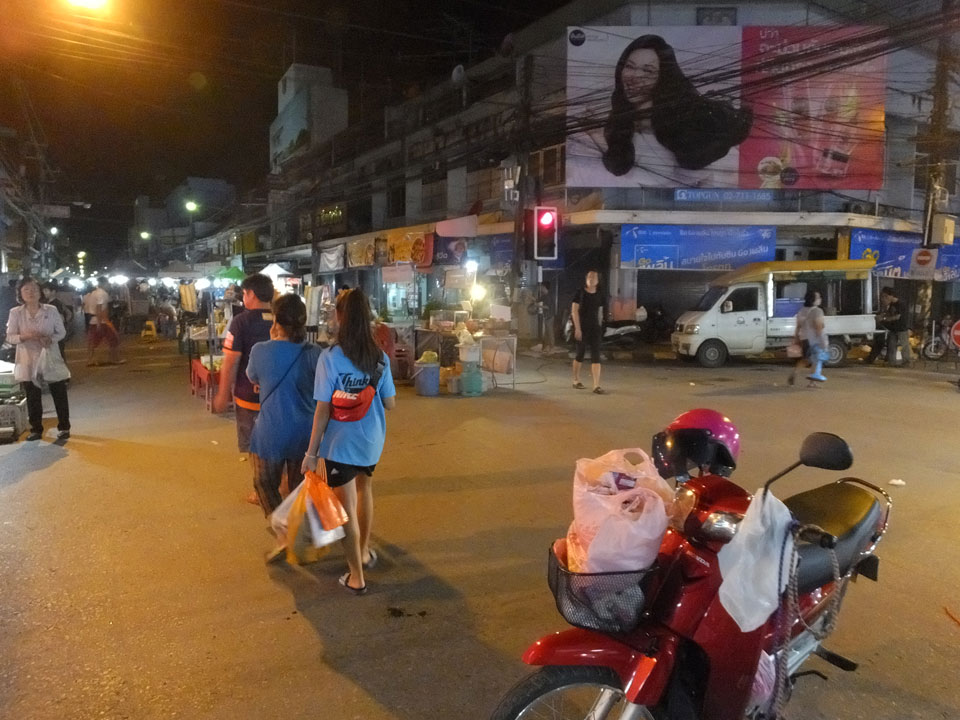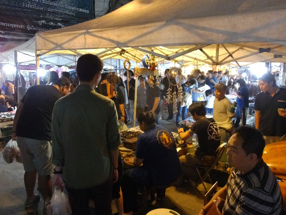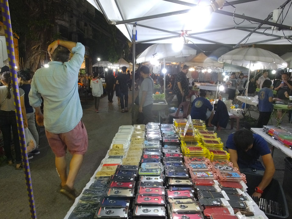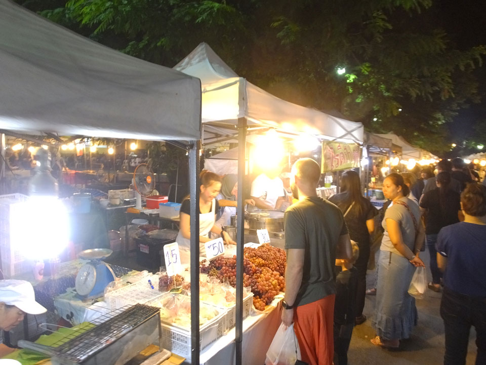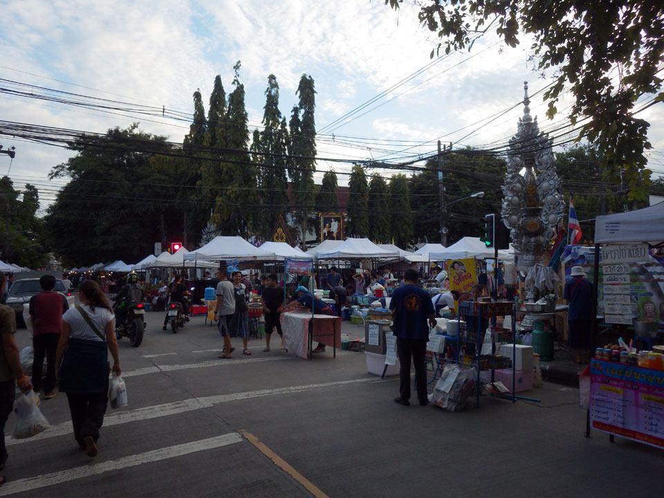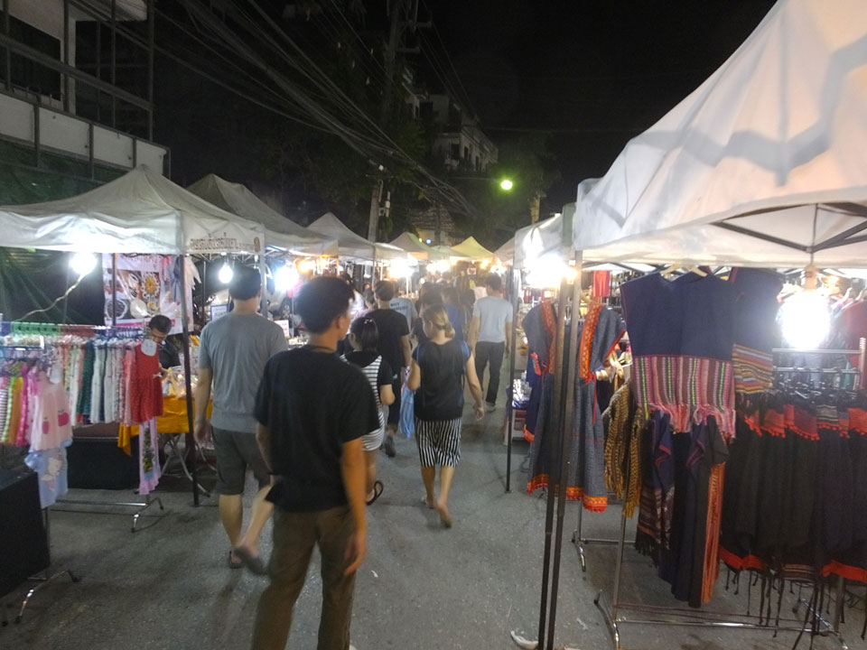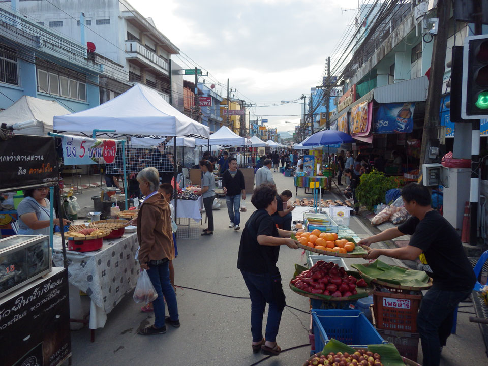 Nach ein paar Minuten chillen im Zimmer schnappte ich meine Kamera ging abends wieder raus – dieses Mal mit dem Ziel Samstags-Markt. Ich probierte da so manches Thai-Food. Alles war super, bis auf die letzte Suppe. Mich überraschte hier, wie groß der Markt doch war. Der lokale Markt braucht sich nicht hinter dem berühmteren von Chiang Mai zu verstecken. Von einem Ende zum anderen brauchte man einige Minuten zu Fuß. Ich fand nur ein T-Shirt (120 THB), ansonsten hatten viele Stände ähnliche Sachen. Von Handyhüllen, über Powerbanks, Kleinkunst, Taschen – alles Mögliche. Nach 22:00 Uhr packten die Händler ihre Sachen zusammen – um 22:30 war Schluss, wie mir die Hotelfrau vorher schon gesagt hatte.