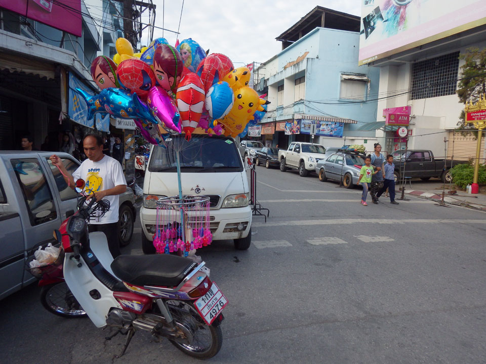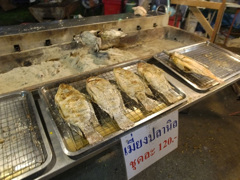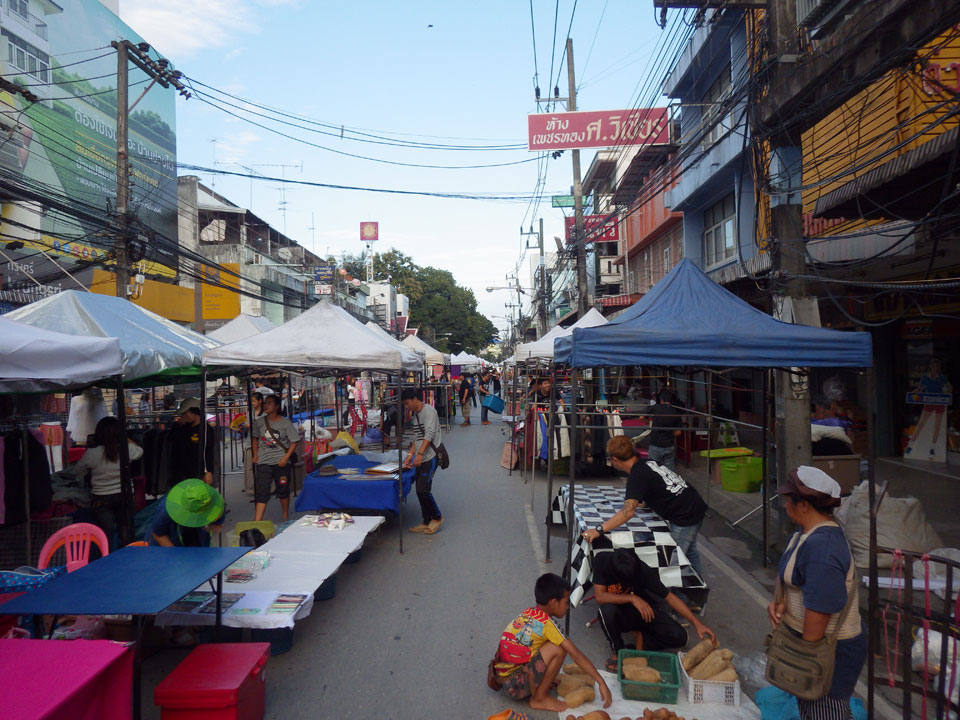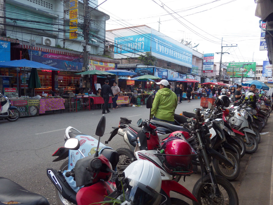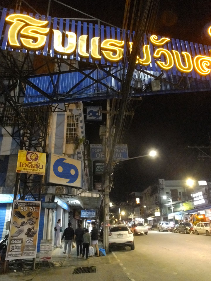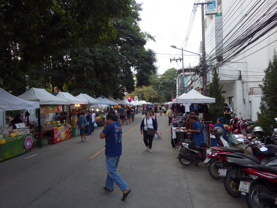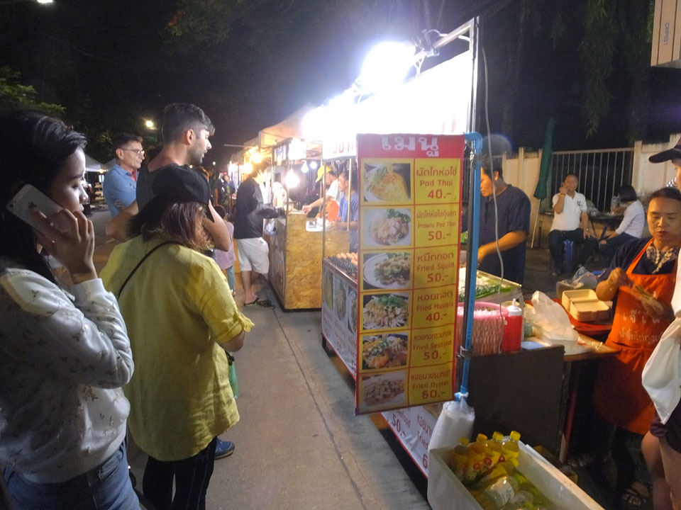 Nach ein paar Minuten chillen im Zimmer schnappte ich meine Kamera ging abends wieder raus – dieses Mal mit dem Ziel Samstags-Markt. Ich probierte da so manches Thai-Food. Alles war super, bis auf die letzte Suppe. Mich überraschte hier, wie groß der Markt doch war. Der lokale Markt braucht sich nicht hinter dem berühmteren von Chiang Mai zu verstecken. Von einem Ende zum anderen brauchte man einige Minuten zu Fuß. Ich fand nur ein T-Shirt (120 THB), ansonsten hatten viele Stände ähnliche Sachen. Von Handyhüllen, über Powerbanks, Kleinkunst, Taschen – alles Mögliche. Nach 22:00 Uhr packten die Händler ihre Sachen zusammen – um 22:30 war Schluss, wie mir die Hotelfrau vorher schon gesagt hatte.
