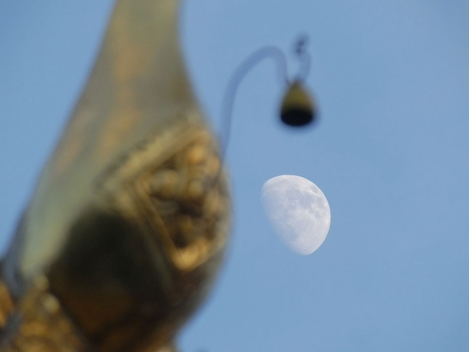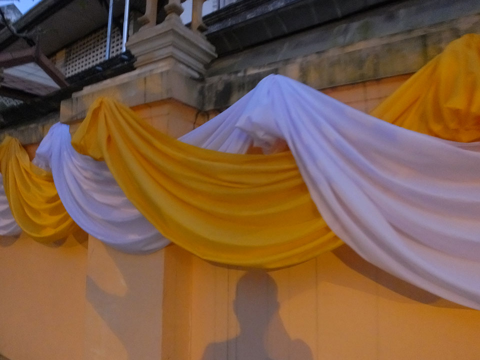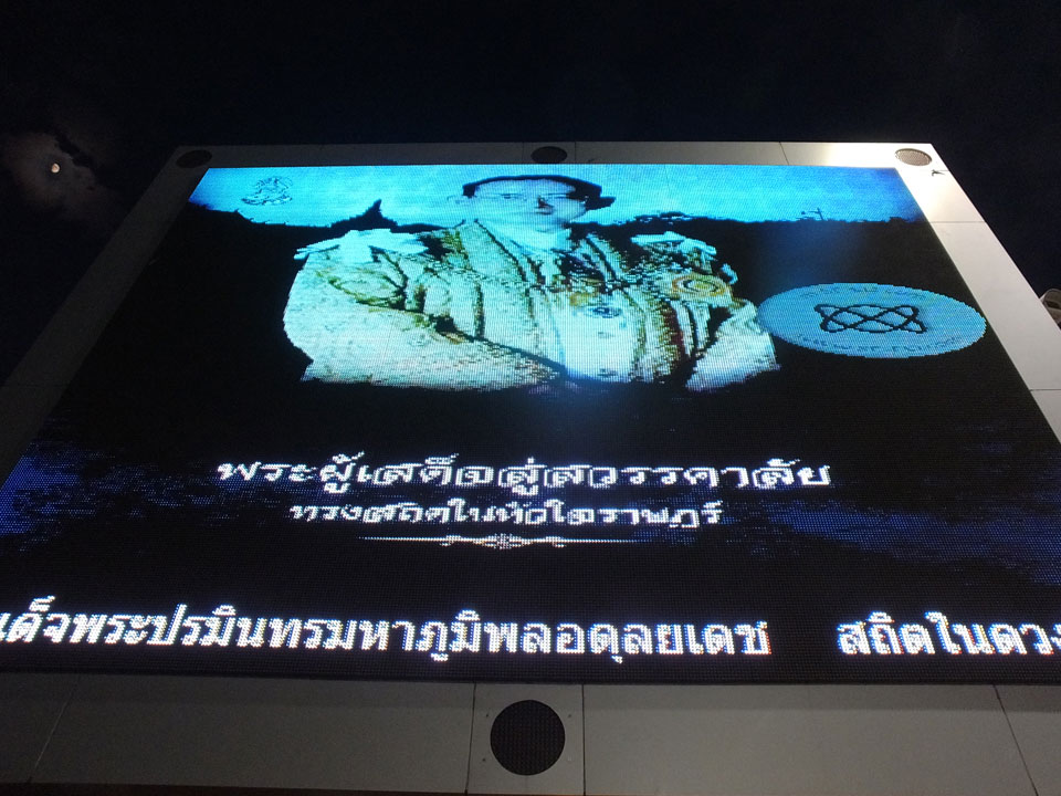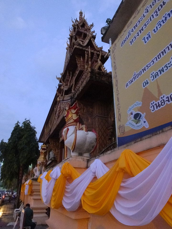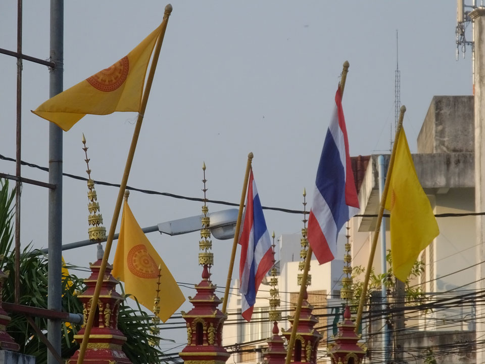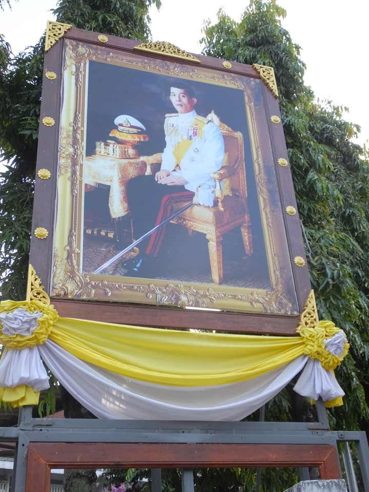 Um 17:00 Uhr kam ich endlich vor die Tür. Ein richtiges Ziel hatte ich nicht und so lief ich nur Richtung Fluss und Brücke. Der neue König Thailands sitzt jetzt bereits auf Portraits an Tempeln.