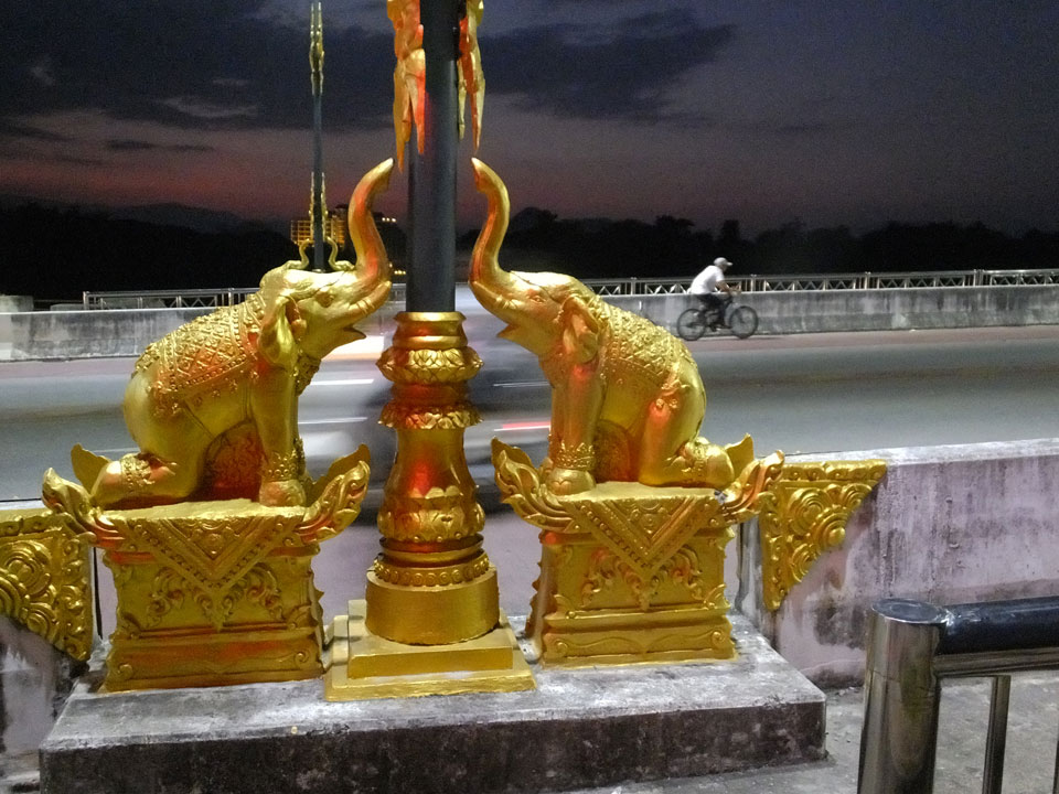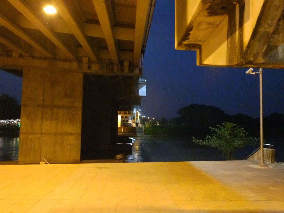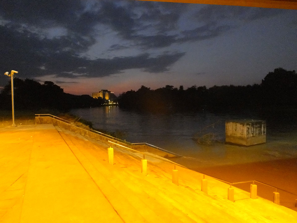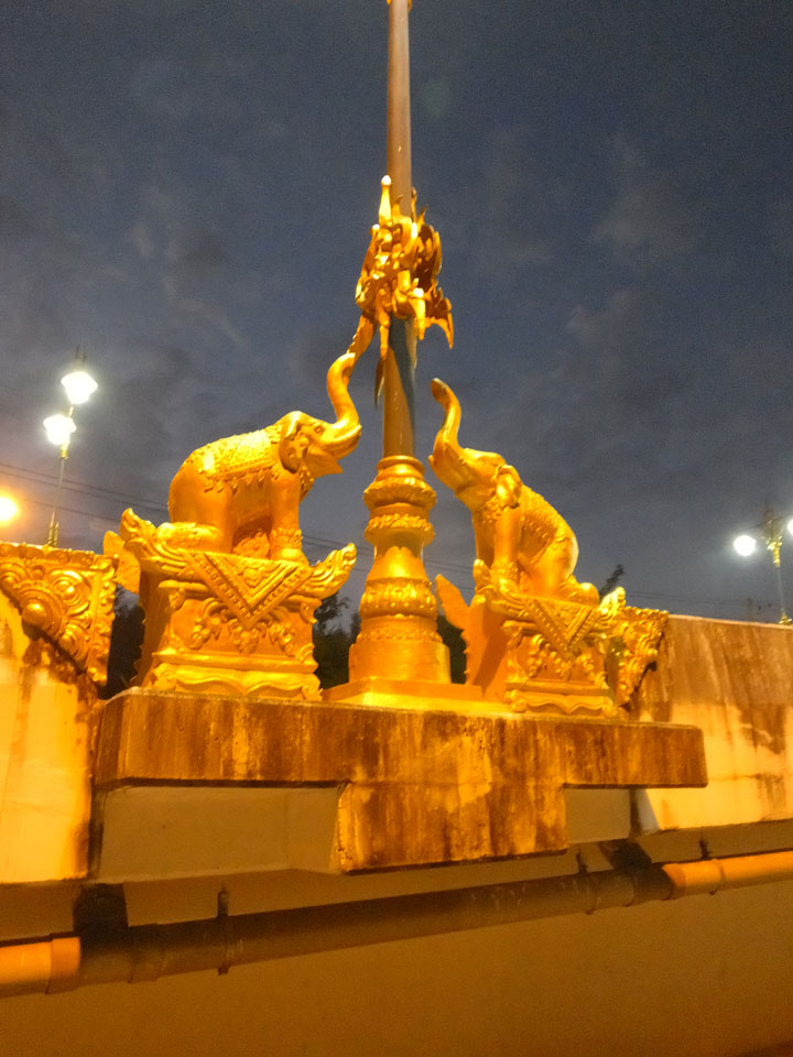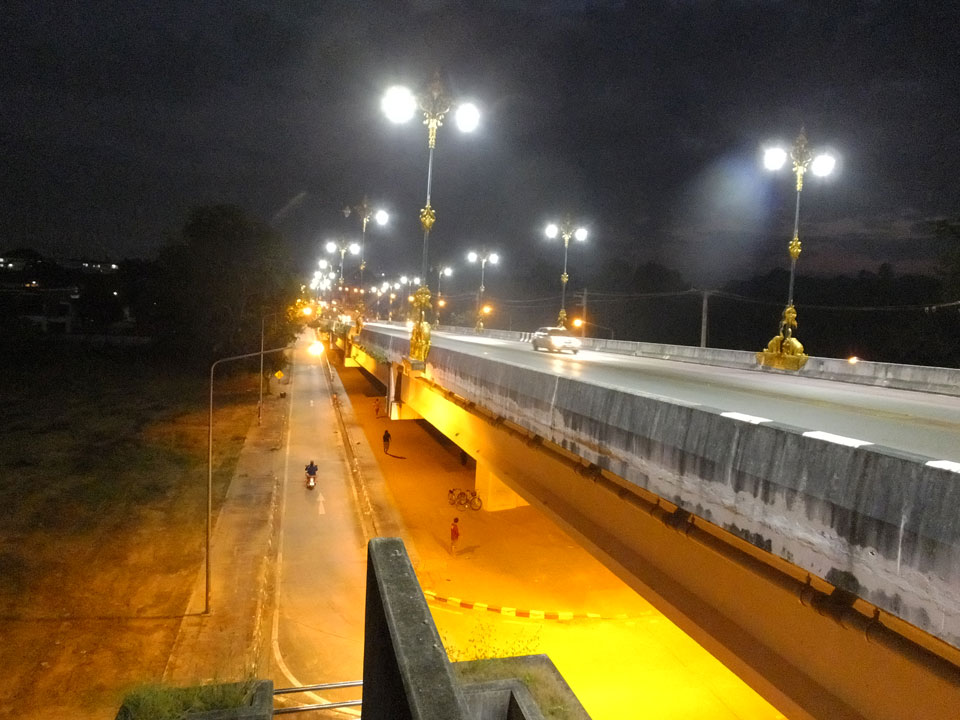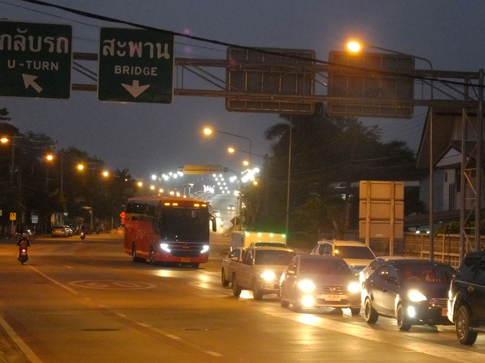 Ich hatte ein Foto von Chiang Rai gesehen, das mit einem Tempel am Fluss ganz nett aussah. Das wollte ich sehen doch inzwischen war der Sonnenuntergang nahe. Die Brücke schien eher groß und modern wie eine Autobahn. Den Tempel am Fluss fand ich nicht. An der Brücke fragte ich mich, was ich eigentlich hier soll. Ein Grund für den Spaziergang ist nur, um auf meine 8000 Schritte pro Tag zu kommen. Ansonsten ziemlich sinnlos, hier zu sein.