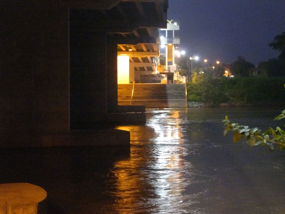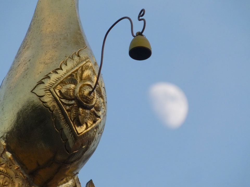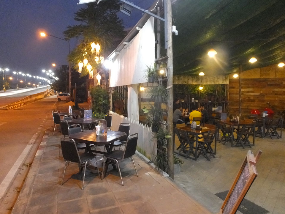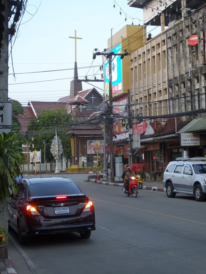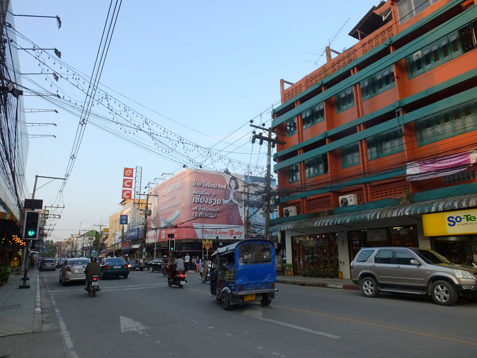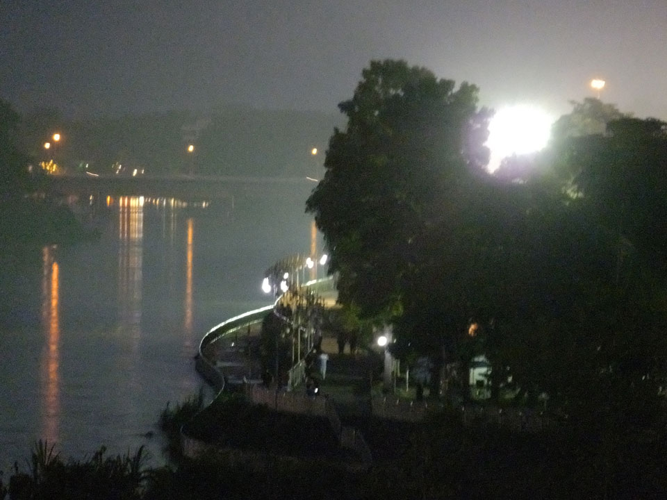 Ich hatte ein Foto von Chiang Rai gesehen, das mit einem Tempel am Fluss ganz nett aussah. Das wollte ich sehen doch inzwischen war der Sonnenuntergang nahe. Die Brücke schien eher groß und modern wie eine Autobahn. Den Tempel am Fluss fand ich nicht. An der Brücke fragte ich mich, was ich eigentlich hier soll. Ein Grund für den Spaziergang ist nur, um auf meine 8000 Schritte pro Tag zu kommen. Ansonsten ziemlich sinnlos, hier zu sein.