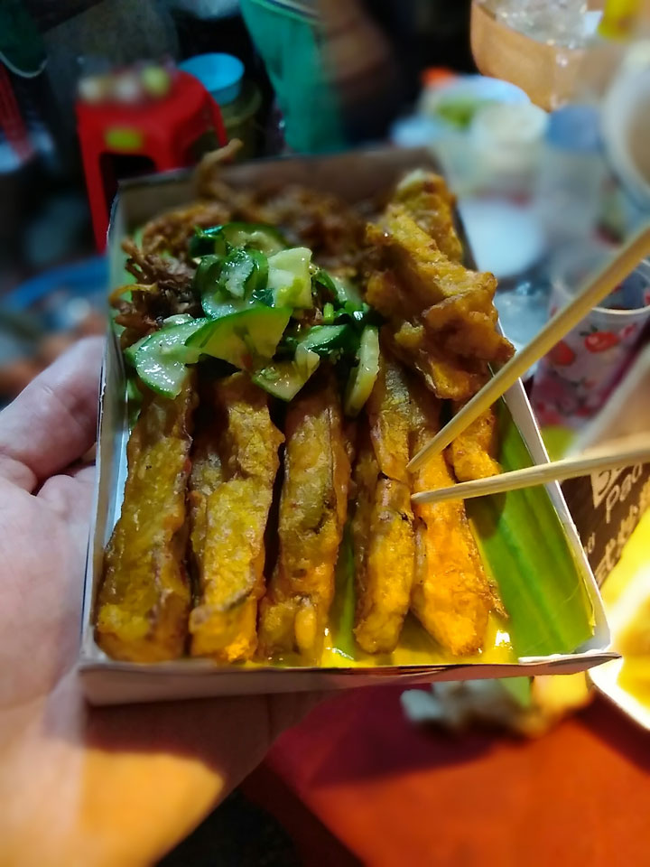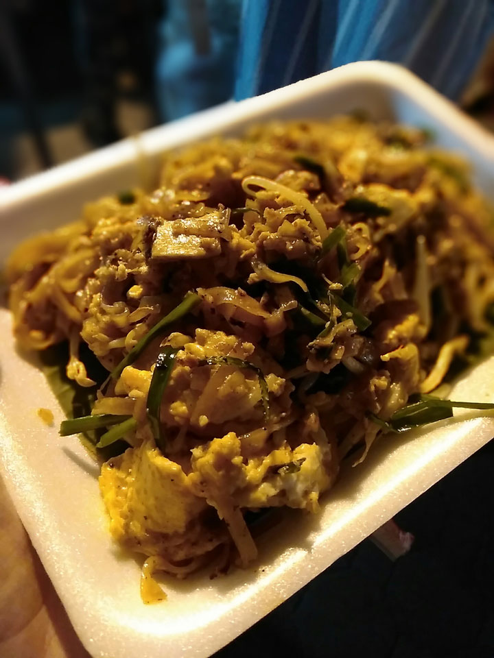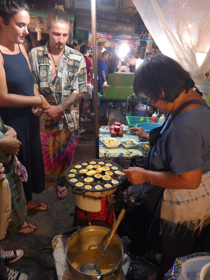 Mit etwas Hunger schmeckte alles besonders gut. Während ich nach Pad Thai in einer Schlange stand, kaufte ich gleich noch frittierten Kürbis mit Gurkensalat. Essen, während man auf’s Essen wartet. Hinterher hatte ich noch eine schön scharfe Suppe und zur Erfrischung eine Kokosnuss. Ich war voll zufrieden und … voll.