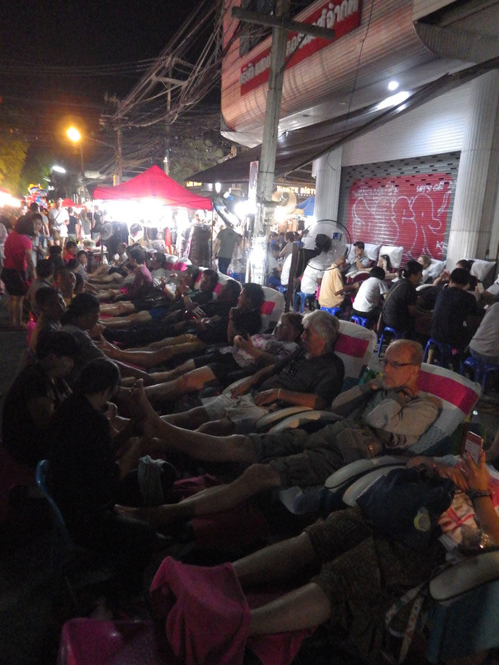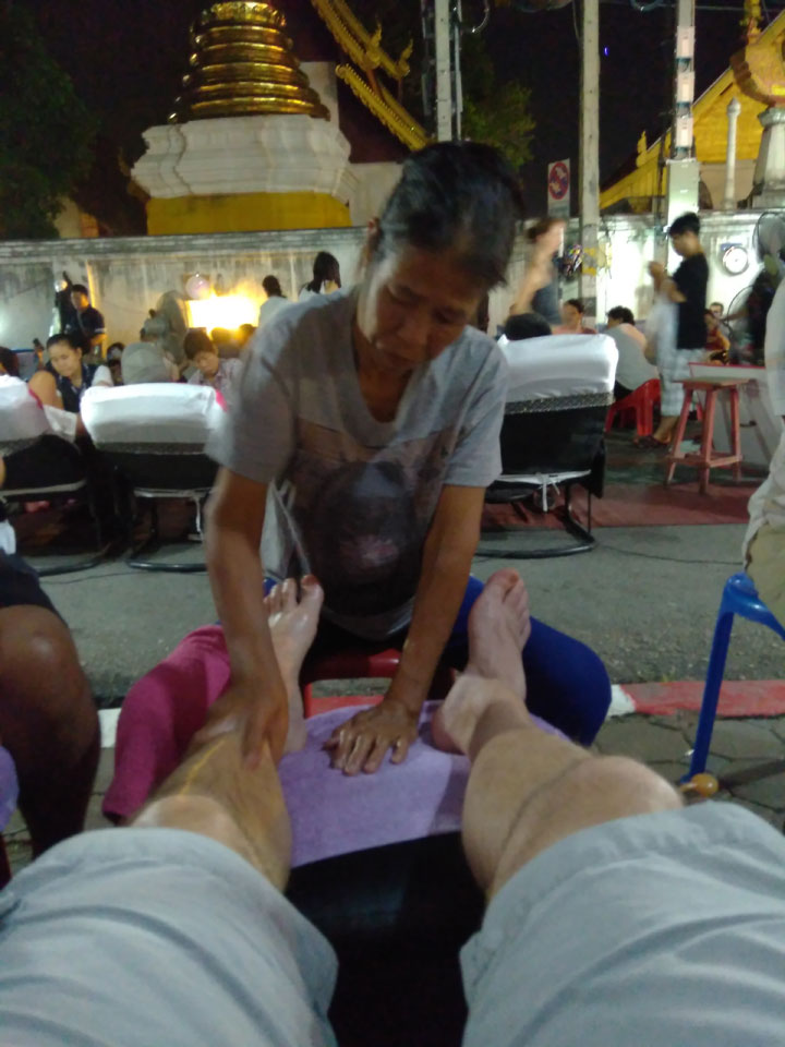 Irgendwie ging’s mir weniger gut – ich war dann doch müde und legte mich zur einer Fußmassage in die Massenabfertigung. Für 80 THB (€2 – 100 THB incl Tip) massierte eine alte Frau meine Füße und Waden. Sie war nicht ganz so kräftig – hatte ich schon bessere Massagen.