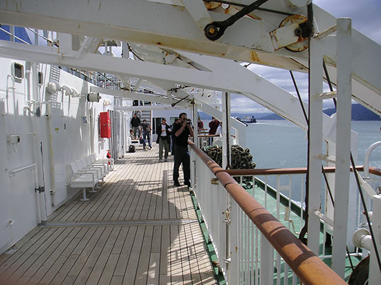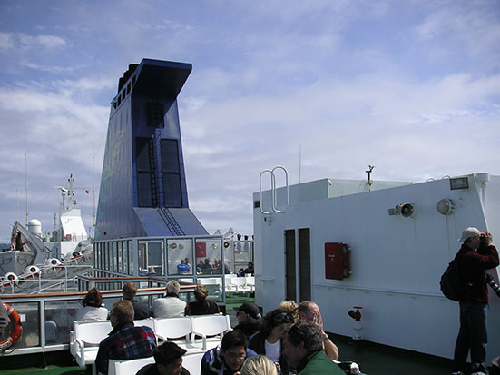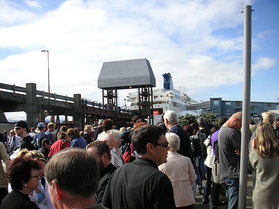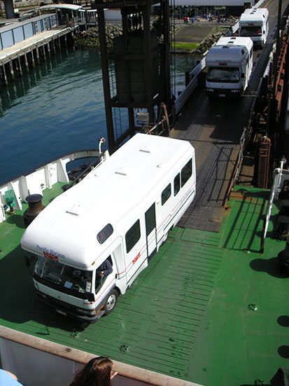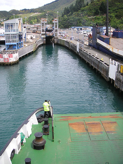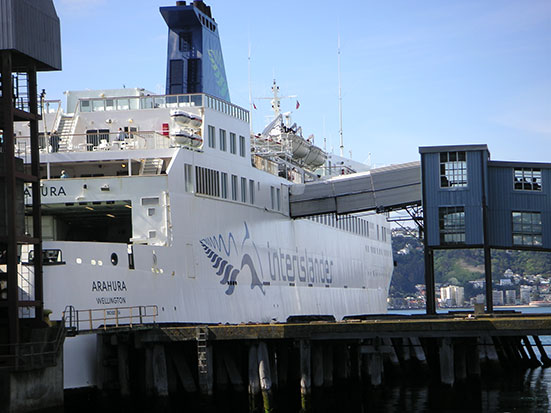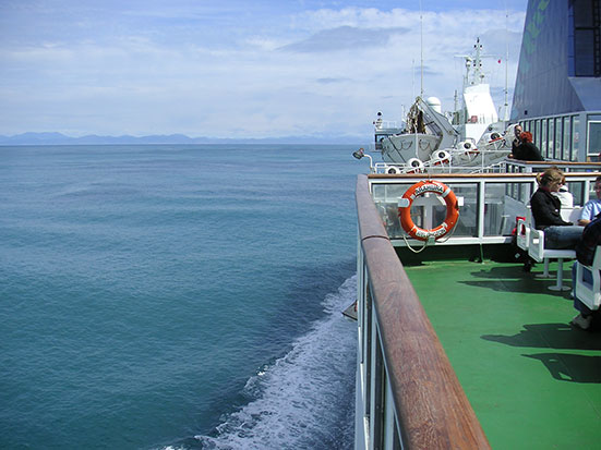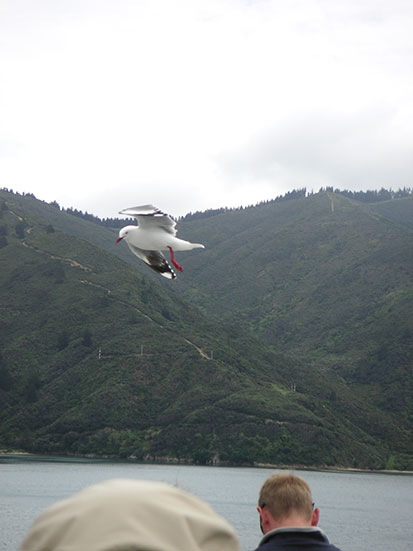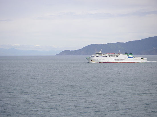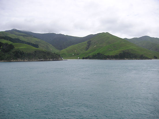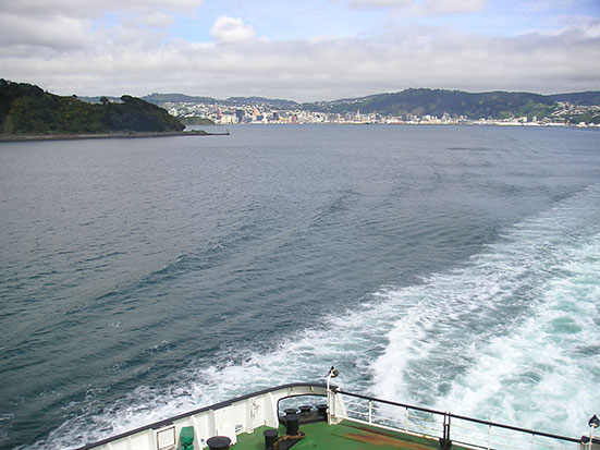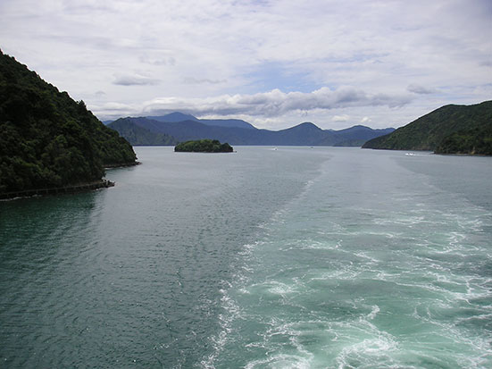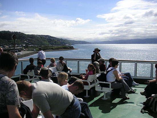 Am Bahnhof angekommen kam auch gleich der Shuttlebus zur Fähre. Da aber zu viele Touristen mitwollten, musste er zwei Mal fahre und ich konnte mir in der Zwischenzeit schnell noch ein Fruühstück holen. Die Fähre hatte sowieso Verspätung und es wollten eine ganze Menge Leute in den Süden übersetzen. Die Kameradichte sprach für fast ausschließlich Touristen. Nach dem einchecken und einer Weile ging die Seefahrt los und Wellington verschwand einige Minuten später hinter vielen Inseln. Alle knipsten wie die Weltmeister – ich natürlich auch. Wenig später war die Südinsel ins Sicht aber da war man noch nicht – noch lange nicht. Es folgte ein Schlängelkurs zwischen vielen kleinen Inseln bis man endlich mit einem gekonnten Rückwärts Einparkmanöver in Picton anlegte. Die Fahrt war sehr schön bei herrlichem Wetter und dauerte gute drei Stunden. Ich brauche sie vielleicht kein zweites Mal machen denn besser geht’s fast nicht.