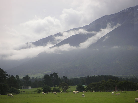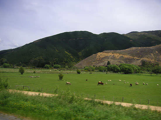 Die Fahrt ging weiter durch unendliche Wiesen. Die Schafdichte ist höher als auf der Nordinsel, wo die Schafe wohl nur zur Rasenpflege angestellt waren. Ich glaube, ich habe an noch keinem Tag so viel grüne Wiese gesehen. Es ging ganze 5 Stunden durch Wiesen it Kühen, Schafen oder sogar Alpacas. Die Straße wirbelte duch Berge vor dem final Stopp ‚Christchurch‘. Die Busfahrerin warnte schn vorher, dass man sagen sollte, wenn man sich ’sick‘ fült. Alle blieben hart aber die Fährfahrt war angenehmer.
