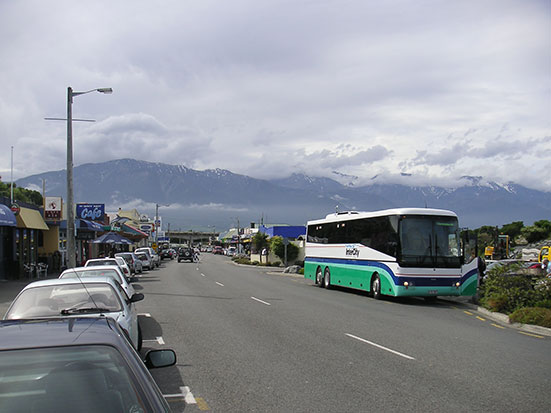In Kaikura ärgerte ich mich ein wenig, dass ich nicht dortbleiben konnte. Das Dorf liegt direkt am Meer und gleichzeitig am Fuß eines ca. 2500m hohen Bergs. Das sieht einfach wunderschön aus und man kann dortt eine Menge abenteurliche Touren buchen. Mit Delphinen schwimmen oder auch mit dem Quad durch die Berge heizen. Im Bus suchte ich mir schon eine Möglichkeit aus, dass ich vielleicht nochmal zurückkomme. Übernachtunegn muss man lt. Reiseführer besser vorher buchen und Wale beobachtet man besser mit dem flugzeug. Aha!