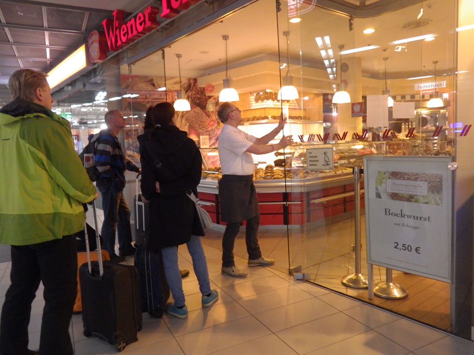 Auf dem Dresdner Flughafen warte ich bis um 8, dass ein Bäcker aufmachte – einige Leute standen auch schon in einer Schlange. Die Bockwurst war verschrumpelt doch die Apfeltasche ging zusammen mit einem Cappuccino für 7 € über die Theke. Da muss man sich erstmal wieder an deutsche Preise gewöhnen.