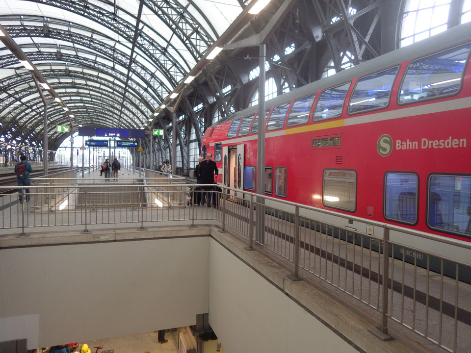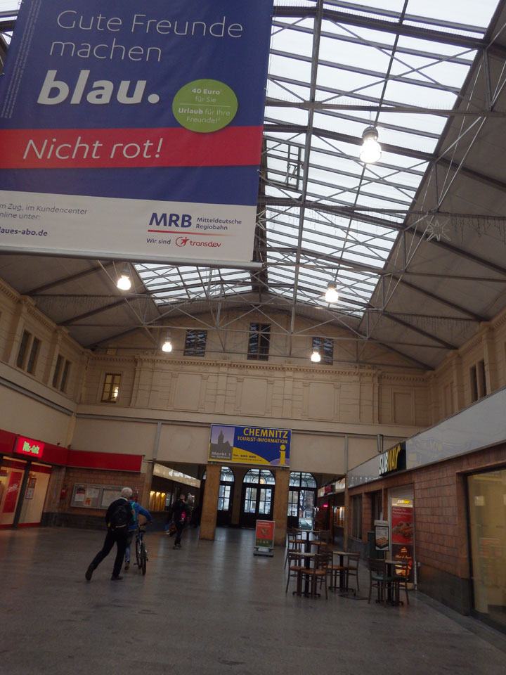 Alles musste schnell gehen denn 8 Uhr 17 Uhr vor meine S-Bahn zum Hauptbahnhof. Eigentlich hatte ich eine Verbindung mit ‘nem Bummelzug. In Dresden fand ich aber eine Regionalbahn die mich 45 Minuten früher nach Chemnitz bringen würde. Wegen meinem 120er Ticket fragte ich vorsichtshalber nach – erst ab 9 gültig und Feiertage – heute war ja Feiertag, nur nicht in Bayern, wo der Zug hinfährt. Naja, kompliziert aber doch OK.