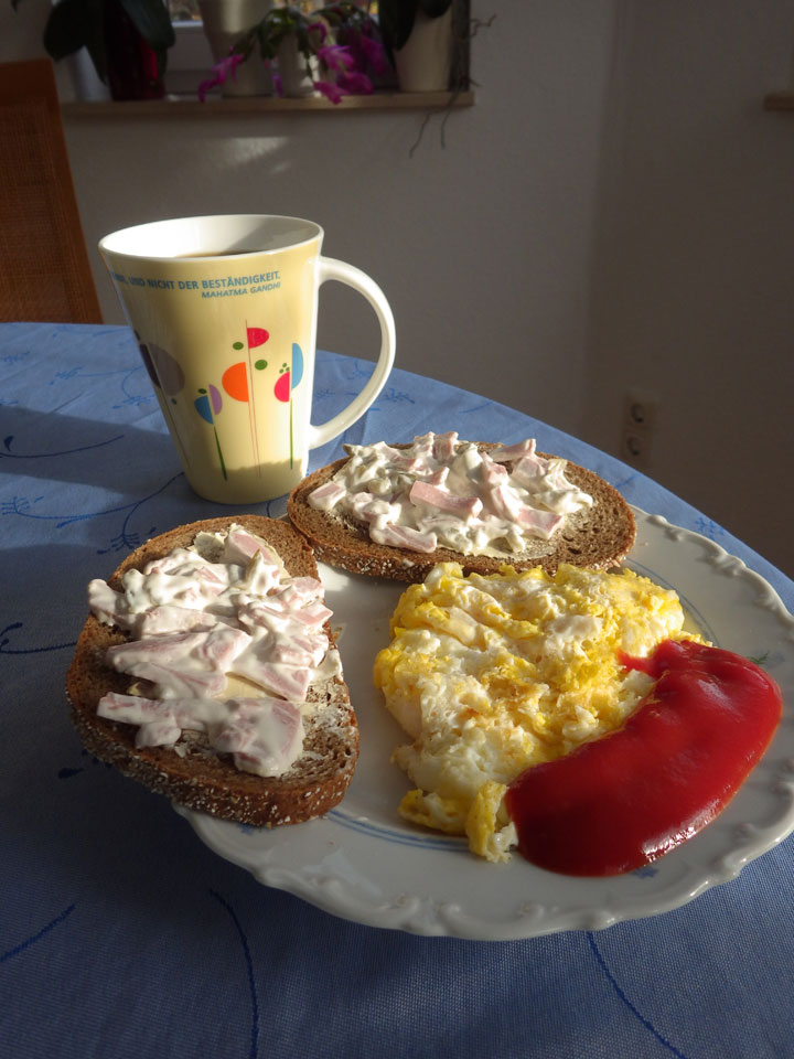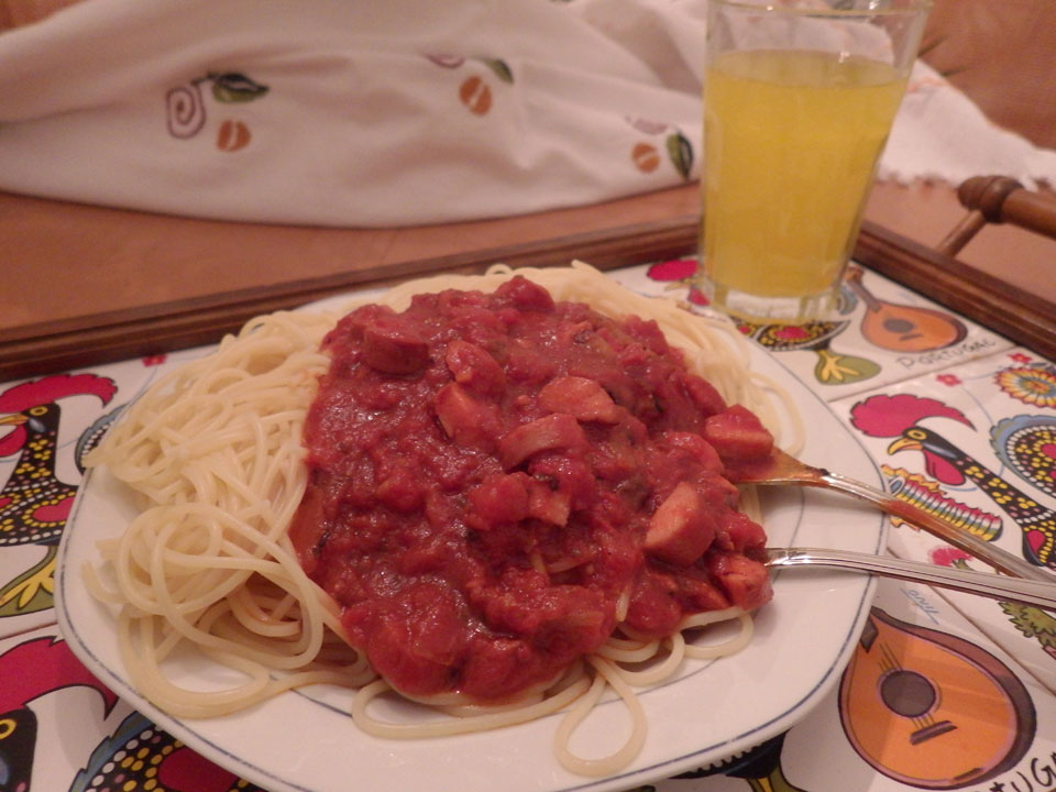 Zum Abendessen machte ich mir Spaghetti. Die Sache ging schief, weil ich zu spät merkte, dass die Soße faul war. Saurer Geschmack – alles für die Tonne. Ein paar Spaghetti konnte ich retten. Das nächste Mal bei zu leichtem Öffnen des Glases besser checken.
