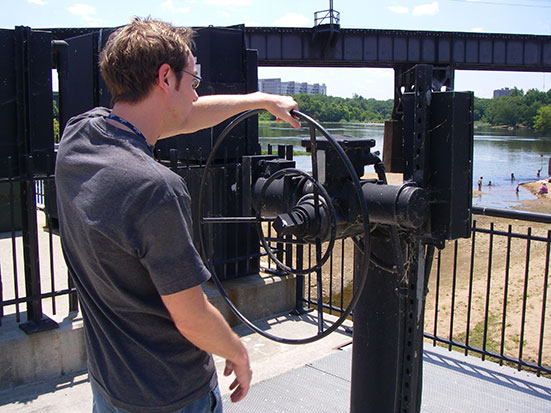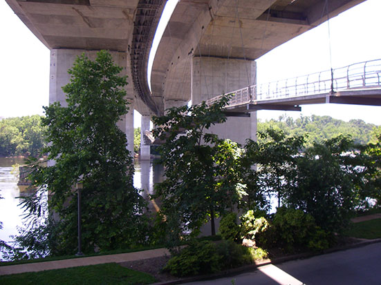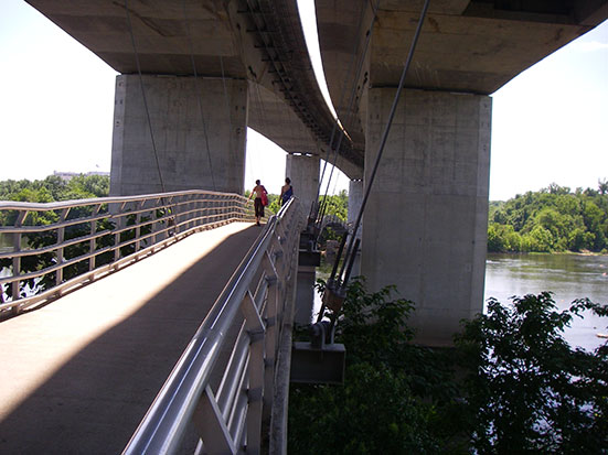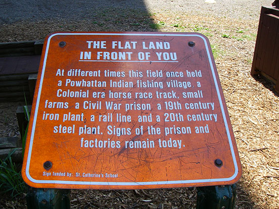 Über eine Hängebrücke ging es auf die Belle Insel, auf der lt. Infotafel mal Indianer wohnten, ein Gefängnis während des Bürgerkrieges stand und auch mal ’ne Stahlfabrik. Kaum waren wir dort, gingen wir wieder zurück. Per GPS raus aus der Stadt und Richtung Osten ans Wasser.