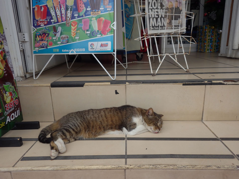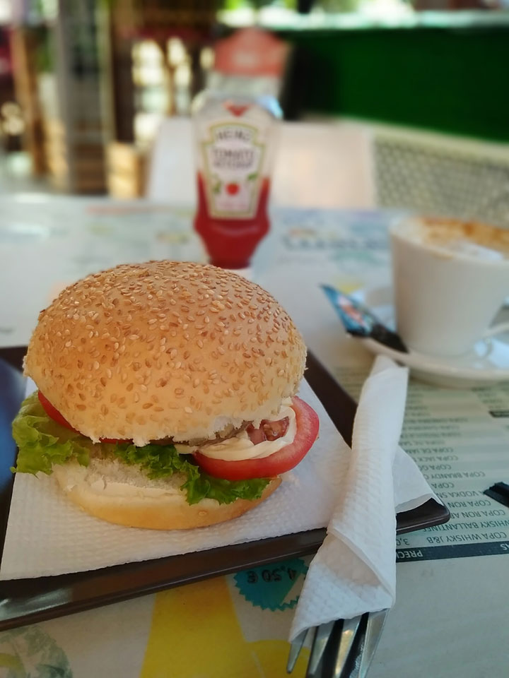 Meine Sachen verstaute ich im Tauchladen, dem das Hostel gehört und ging wieder an die Ecke zum Frühstücken. Der Ei-Toast für €2,80 war ja ein Reinfall gestern, der Cheeseburger zum gleichen Preis war heute OK.