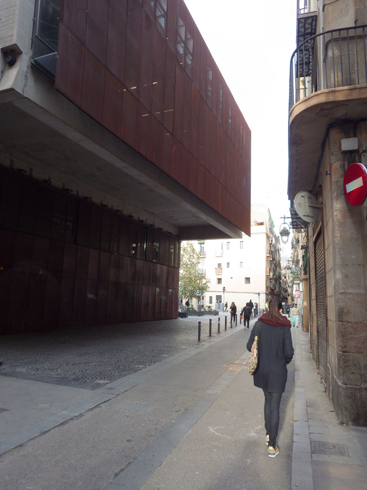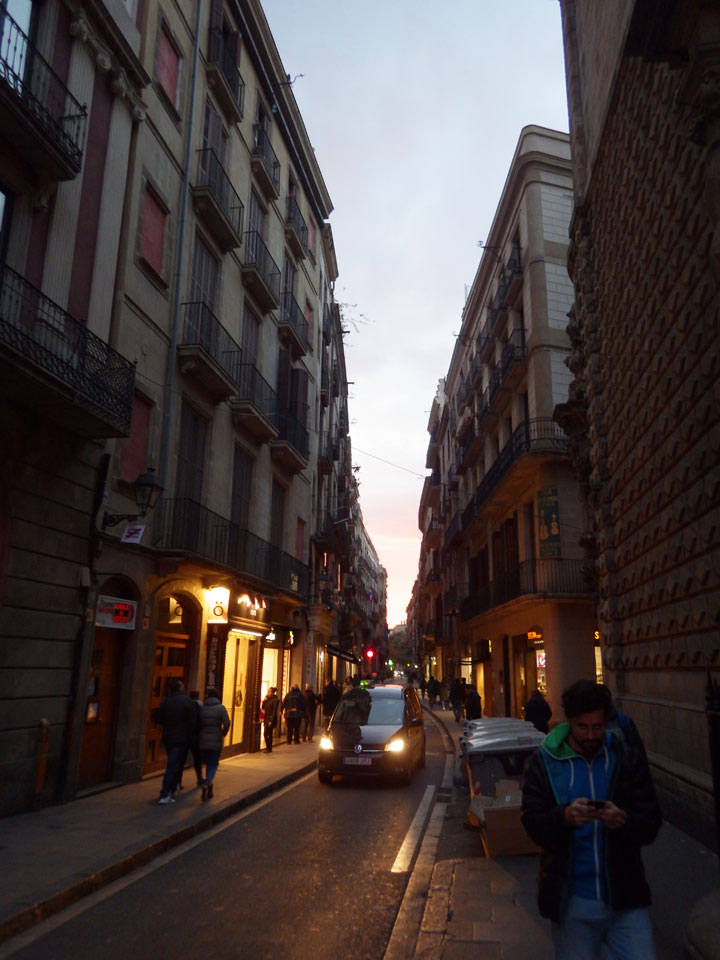 Es war kalt in Barcelona. Der Winter ist auch hier angekommen. Mit der Jacke ging es gerade so. Ich hatte kein Ziel und bog einfach mal irgendwie in neue Straßen ab. So kam ich wohl doch nach Raval, kehrte in einer Bäckerei zu ’nem Bocadillo Jamon & Queso + Cortado ein (€3,75). Dabei las ich erst mal wieder und hatte doch beim Spazieren die meisten gedanklichen Erkenntnisse, die lt. Krishnamurti eigentlich wenig wert sind. In Sachen Realität war das eben life watched by „self“ -> observer of self in mindful state (non-self) -> space of observer being observed (non-mind). Alles Quatsch am Ende, genauso wie in Matrix Terminologie statt roter Pille & blauer Pille ist es wohl eher die lila Pille… Durch die ganzen Ideen bekommt man auch ein High. Quatsch eben oder wasauchimmer. Wie korrekt angekündigt, kann man sich die Sachen nicht durchdenken. Es wird Zeit, sich anderen Themen zu widmen.