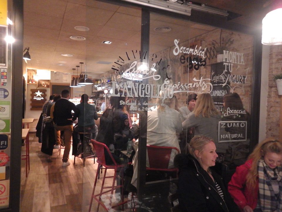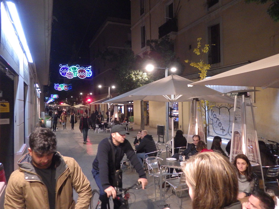 Abends wurde es interessanter. Tapas night stand an. Ich ging mit einer Handvoll Leute und dem Guide in die Tapas Straße. Für €1 oder €1,80 war eine Doppelreihe leckerer Häppchen aufgestellt. Ich nahm erst drei und die Tapas waren soo gut, dass ich noch zwei nachschob. Sangria wurde zwischen vier Leuten geteilt. So hatte jeder ein Glas. Am Ende wurden es €10 für mich. Recht teuer aber eines der besten Essen bisher hier in Barcelona.