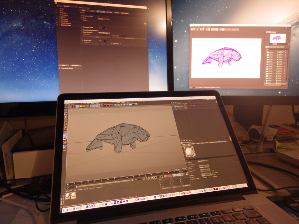 Ein Besuch bei Oma war vorgesehen, musste jedoch verschoben werden. Ich setzte mich an Cinema4D und versuchte die Wireframe Renderings hinzubekommen. Die vielen Optionen von Sketch & Toon machten die Sache schwierig.