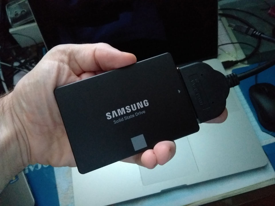 Die Samsung SSD kam heute. Ich hatte bereits Kabel und Gehäuse für 2,5“ Geräte aus China bekommen, sodass der Anschluss einfach ging. Fast…