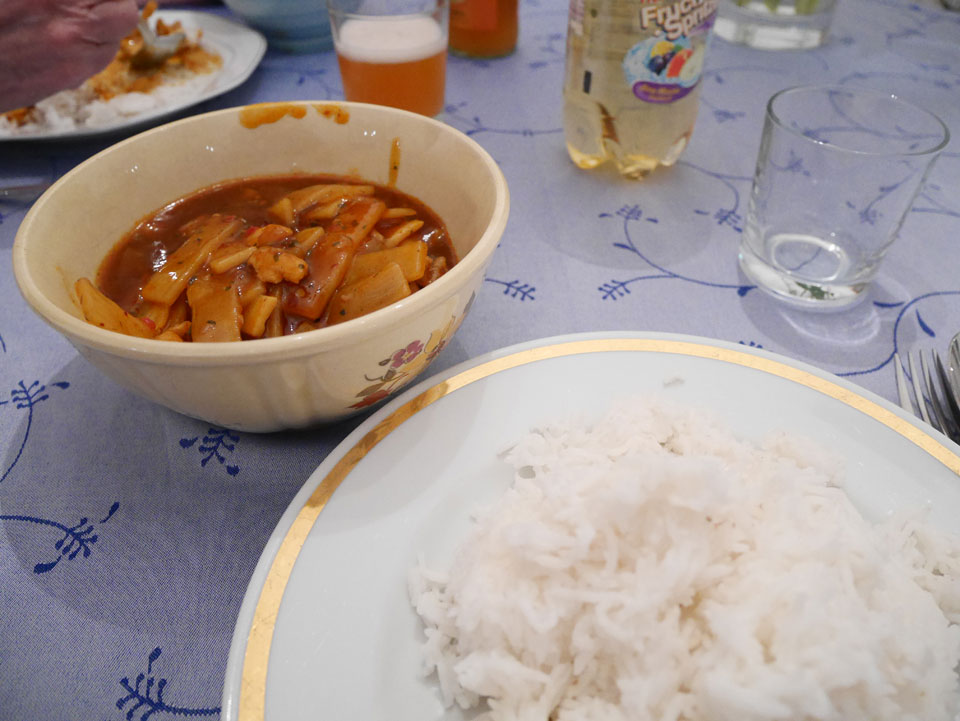 Zu Hause machte ich Kaffee, aß etwas Fisch und fand den Übeltäter. Nur bis 8.2. haltbare Makrelen machten wohl dem Magen zu schaffen. Langsam gibg’s mir besser, obwohl ich die ganze Packung aufgegessen hatte. Da kochte ich mal wieder asiatisch mit ’ner Aldi-Soße. Nichts besonderes, nur schnell.
