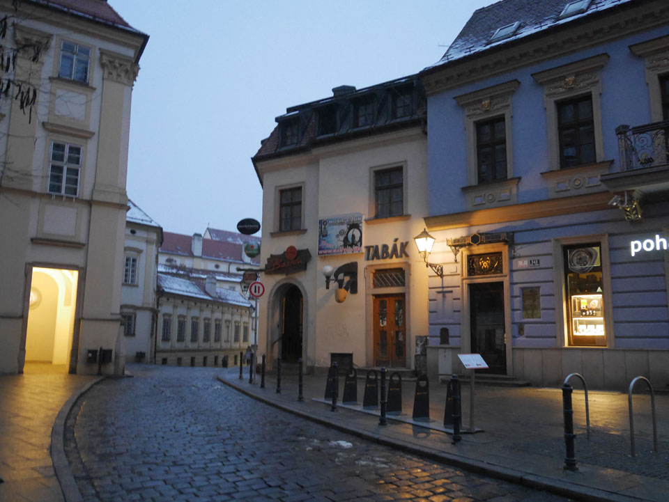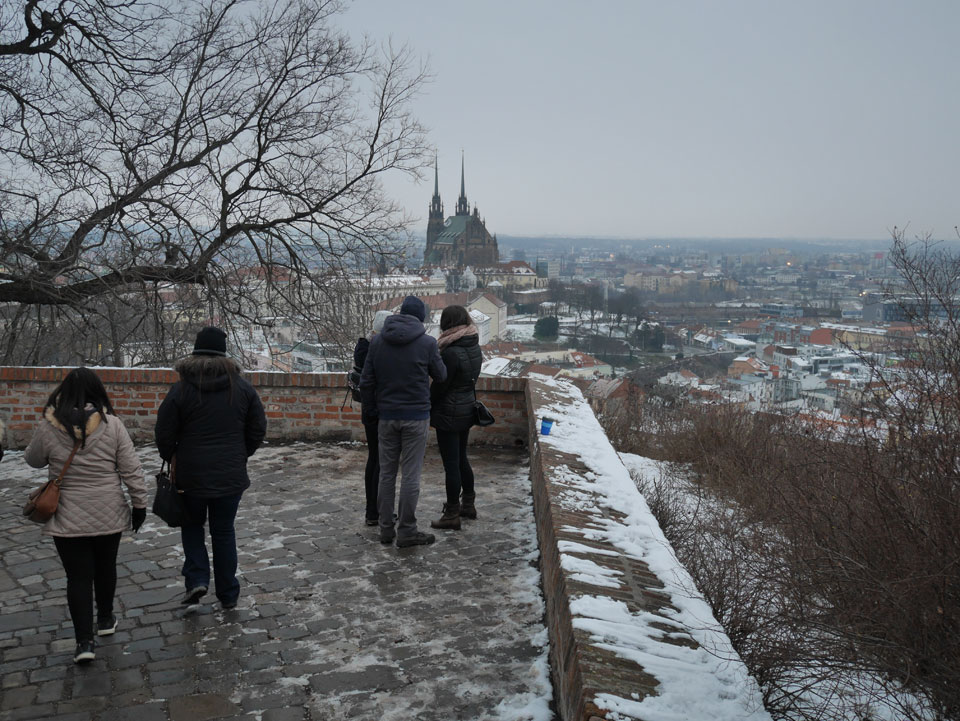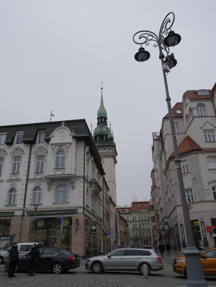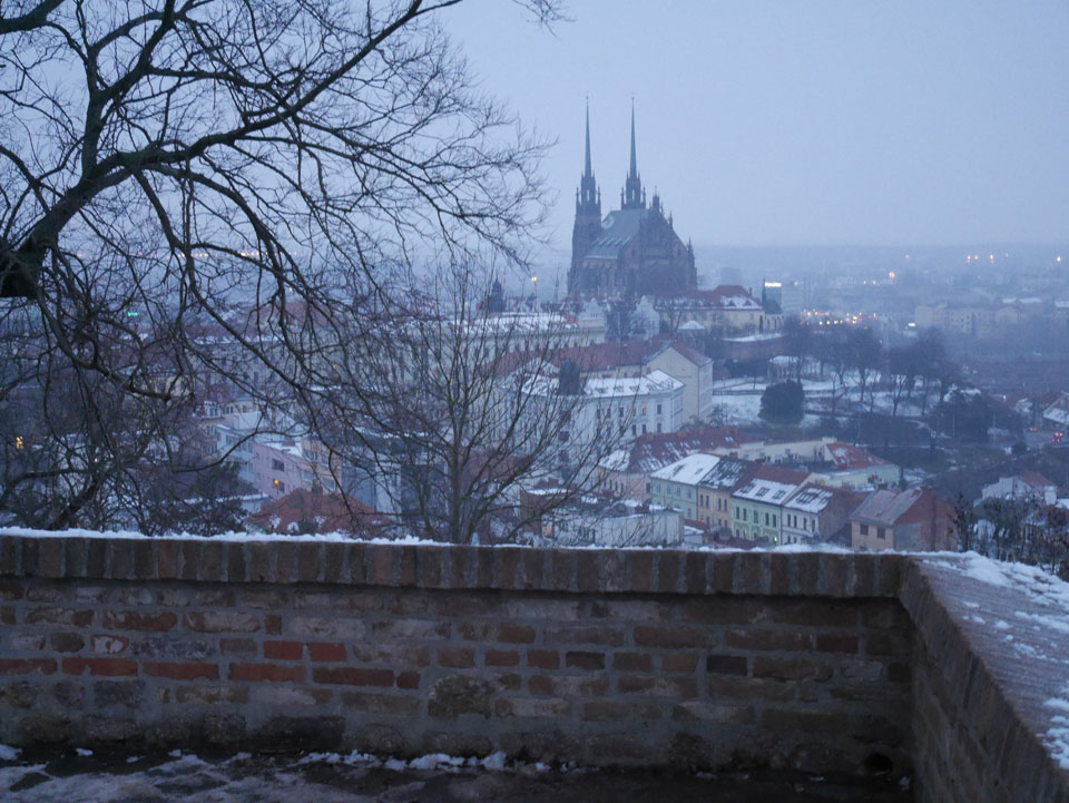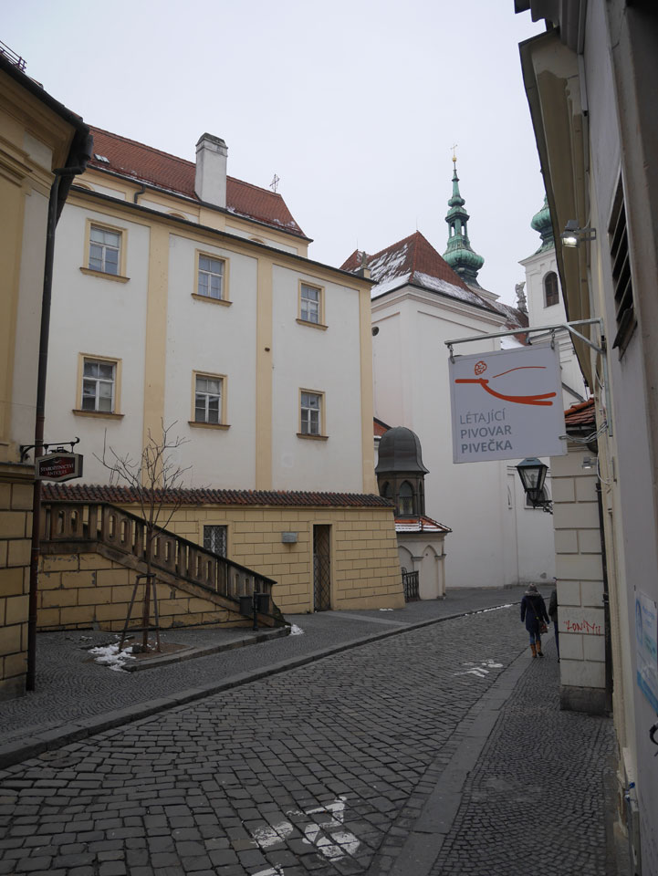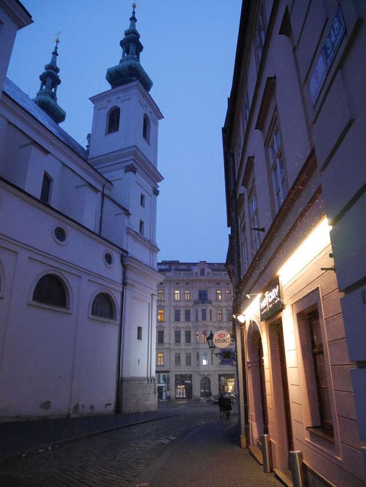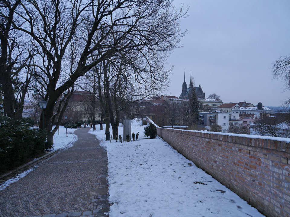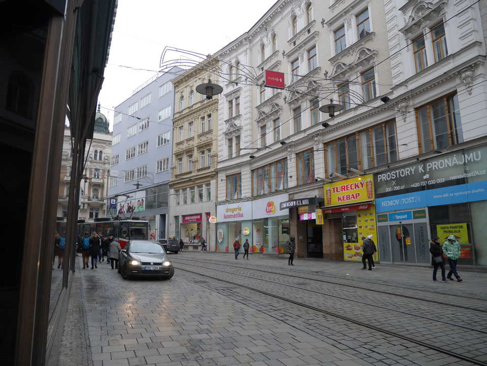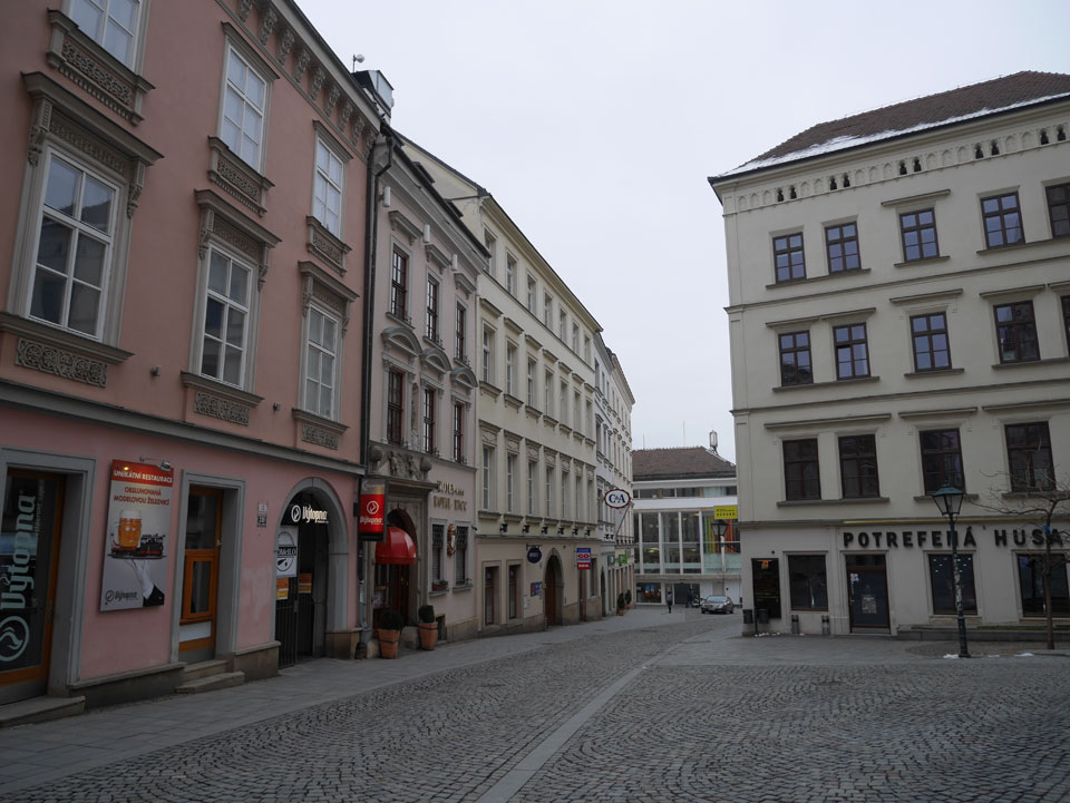 Winterwetter und leere Straßen. Ein paar Touristen wurden durch Brno geführt, ansonsten verbrachten die meisten Leute ihre Zeit besser im Warmen.