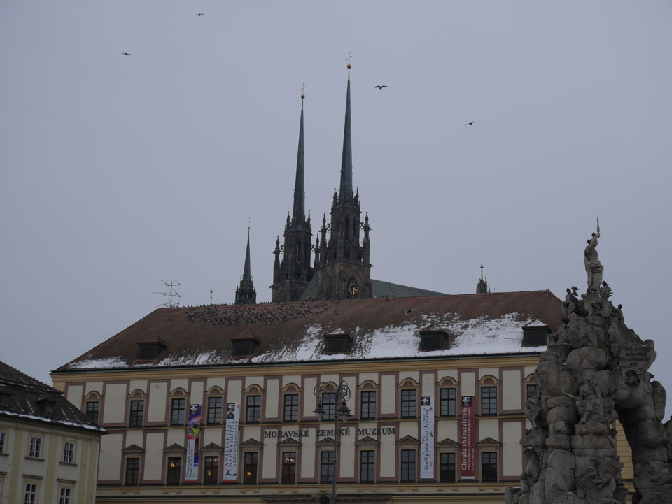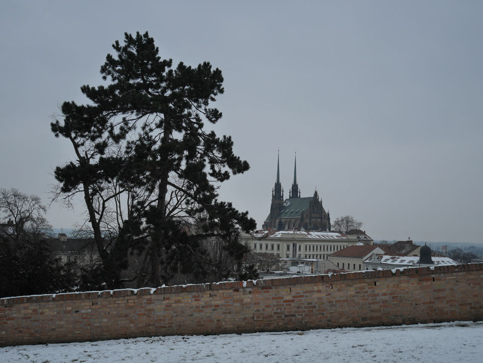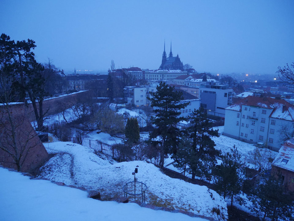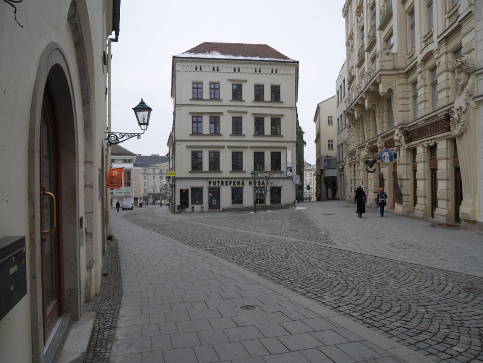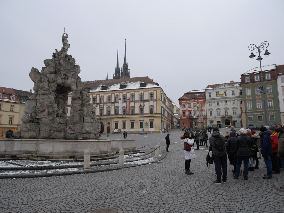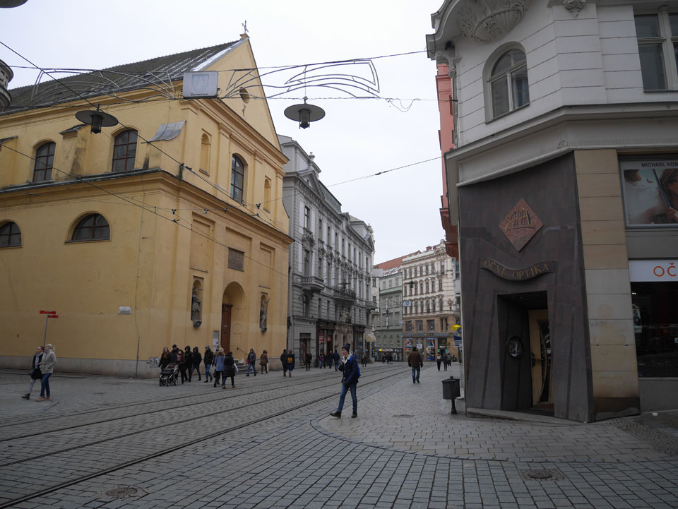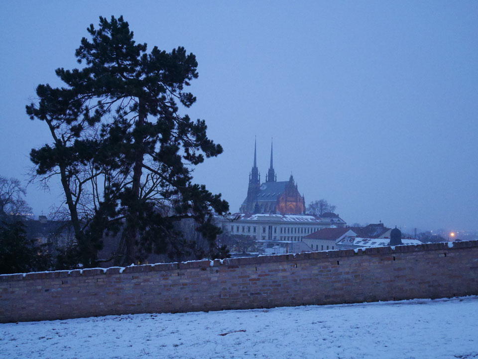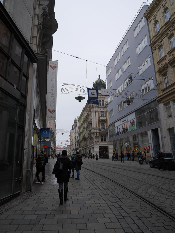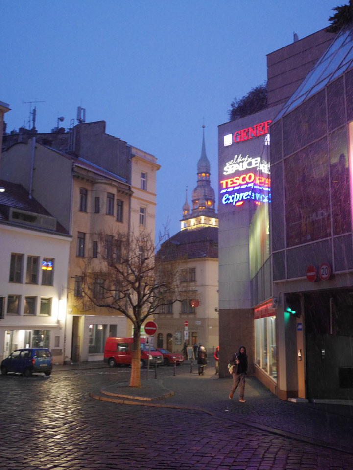 Winterwetter und leere Straßen. Ein paar Touristen wurden durch Brno geführt, ansonsten verbrachten die meisten Leute ihre Zeit besser im Warmen.