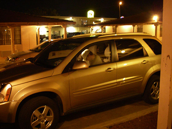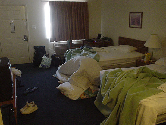 In der Innenstadt buchte ich per hotels.com ein Zimmer. Als ’ne halbe Stunde wir vor dem Motel standen, sah ich schon das „no vacancy“ Schild. Nach der Erfahrung in Cannes mit einer kurzfristigen Buchung war ich nicht so optimistisch. Das Motel wusste von nüscht. Er rief jemanden an und zeichnete mir eine Wegbeschreibung für das BudgetInn zum gleichen Preis. Dort checkten wir ein – für die gleichen $42.99 + Tax.