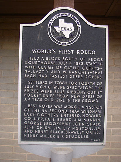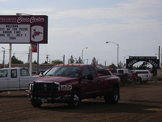 Auf dem einsamen Highway durch die schöne Landschaft. Ein Traum. Wir kamen nach Pesco, TX. Im Radio hatten wir schon ’ne Werbung für ein Rodeo gehört. Hier in Pesco fand das erste Rodeo überhaupt statt. Es war 6. Nach einer Runde druch den Ort parkten wir das Auto und sahen die ganzen Cowboys auf den Pferden, mit riesigen Pickups und noch mehr Pferden in Anhängern. Es war wie im Film: Country Musik, Rodeo, Pferde, Dorf in Texas.