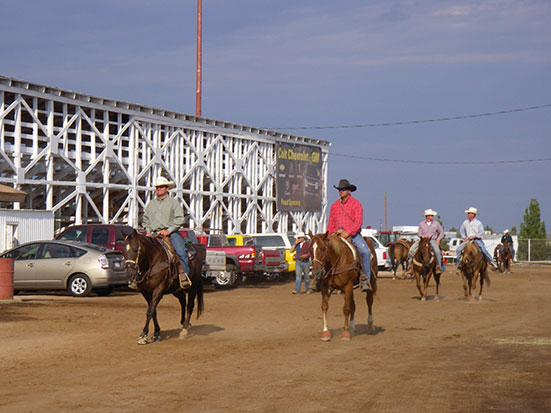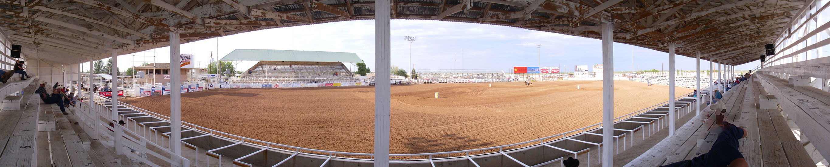 Ab halb sieben war ein kleiner Wettbewerb angesetzt. Die Pferde mussten so schnell wie möglich um ein paar Fässer galoppieren. Da saßen wir nun und schauten uns den „Slack“ an. Erst morgen ab 20:00 wäre das richtige Rodeo. Ich wäre auch gern 2 Nächte hier geblieben aber es musste nicht sein.