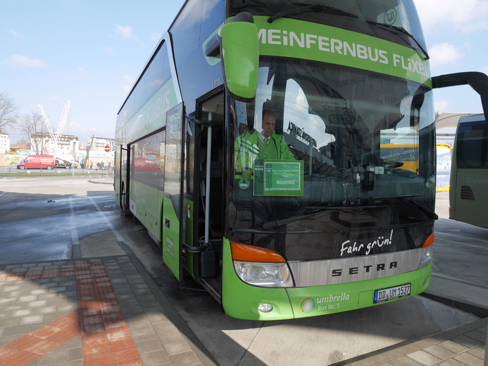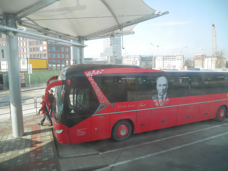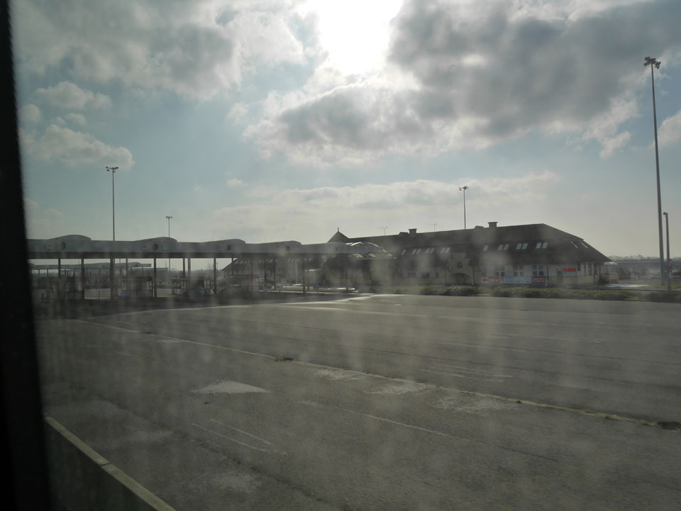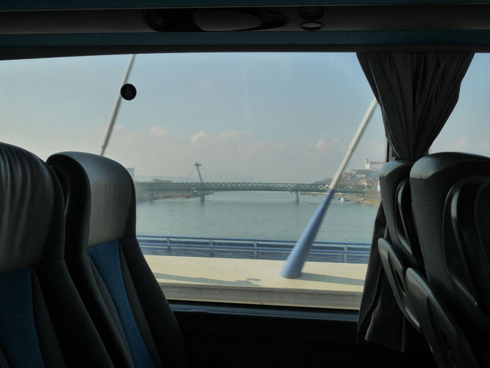 Kleines Frühstück im Hostel und rechtzeitig auf dem Weg und am Bus. Zuerst führte die Strecke nach Bratislava und einer Pause, wo ich ein paar €-Münzen in Wasser (€0,99) und Kebab-Tortilla (€2,70) umtauschte. Ich habe immer noch zu viel Klimpergeld = Ballast.