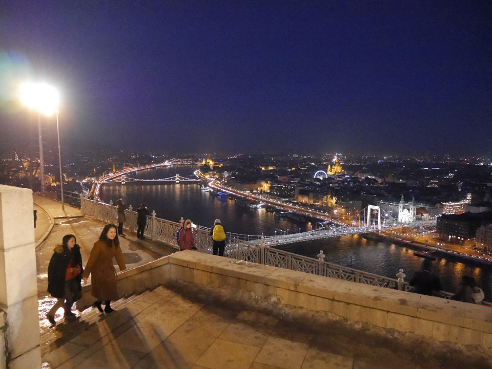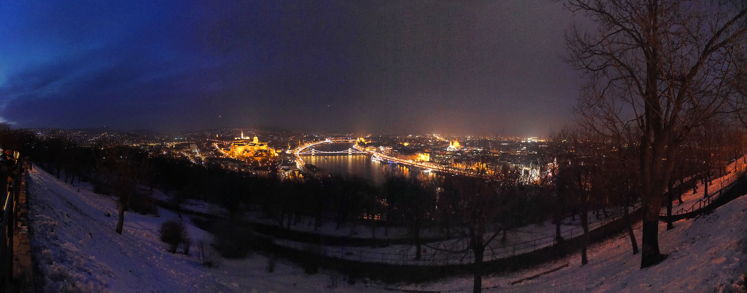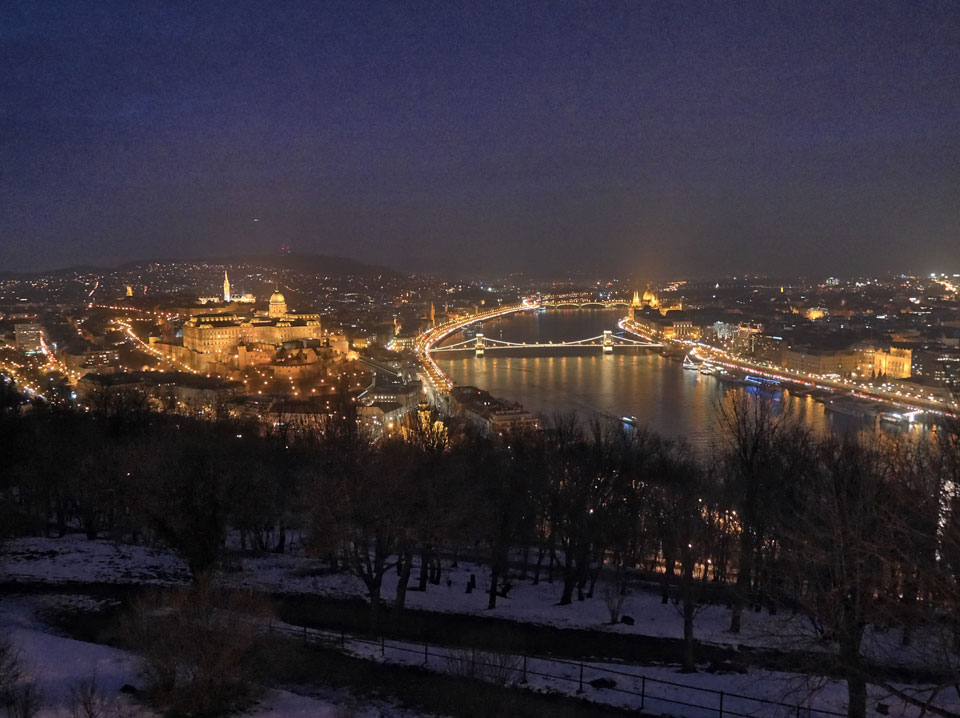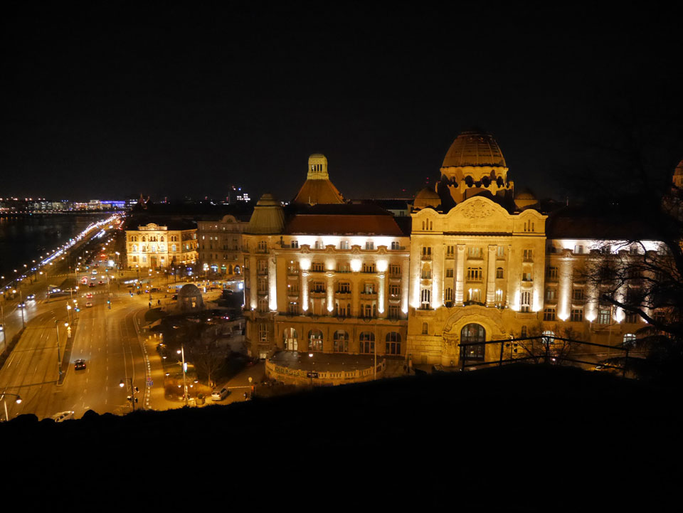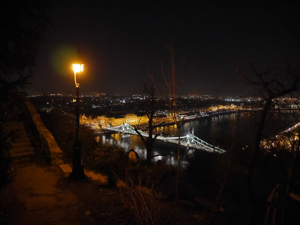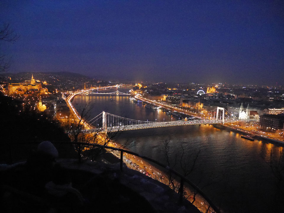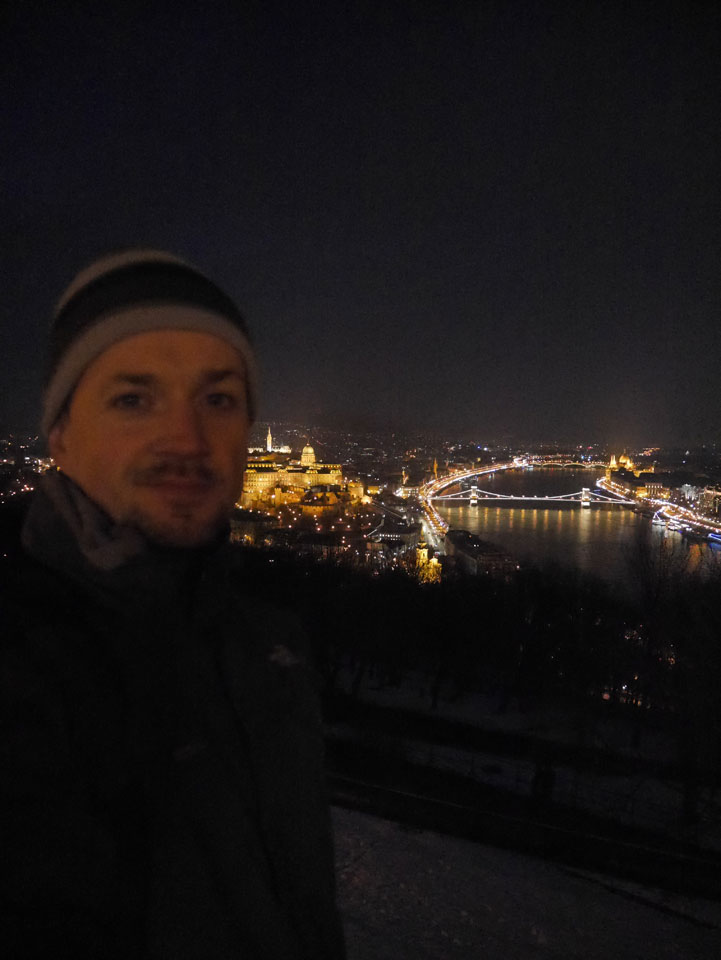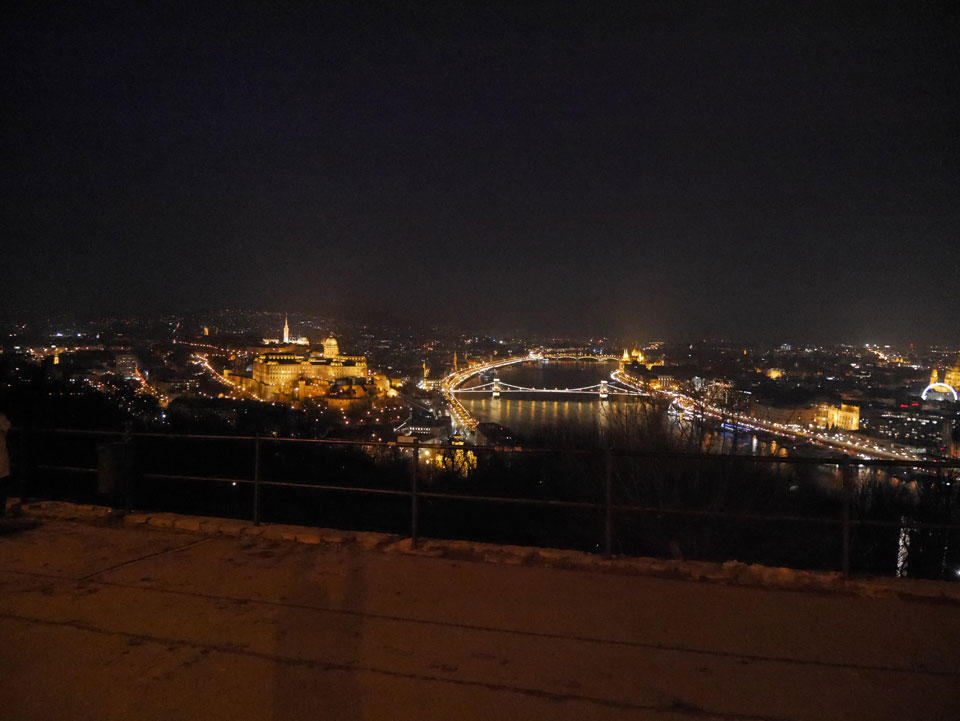 Mit den Jogging-Schuhen war ich zwar schnell unterwegs doch auf dem eisigen Weg bergauf falsch ausgestattet. Nur mit einer Hand am Geländer kam ich teilweise vorwärts, rutschte sonst immer wieder. Da hatte ich natürlich Bammel um die Lumix. Oben dann war’s inzwischen richtig Abend, die Bauwerke Budapests erstrahlten im Licht. Auch das hatte ich so schon mal gesehen, ist aber auch immer wieder nett. Die Lumix ging oft bis zu 12800, die ich als ISO-Grenze setzte. Das Bildrauschen ist für Hobby da immer noch akzeptabel, schon Klasse!