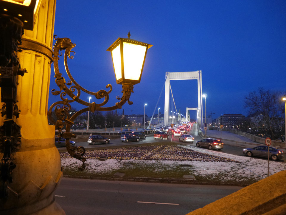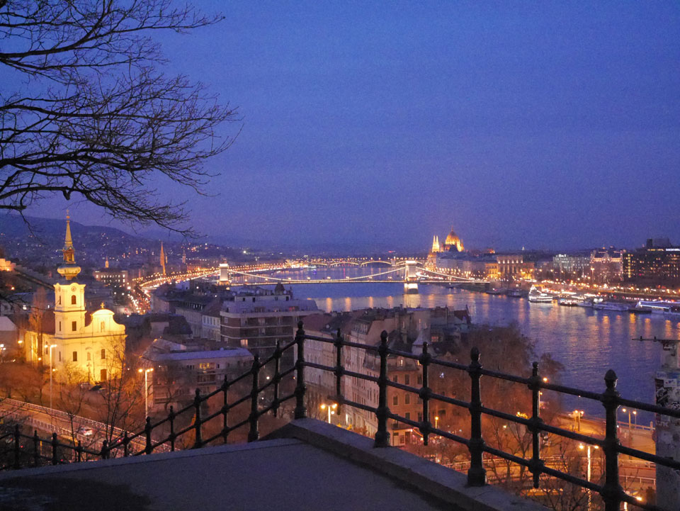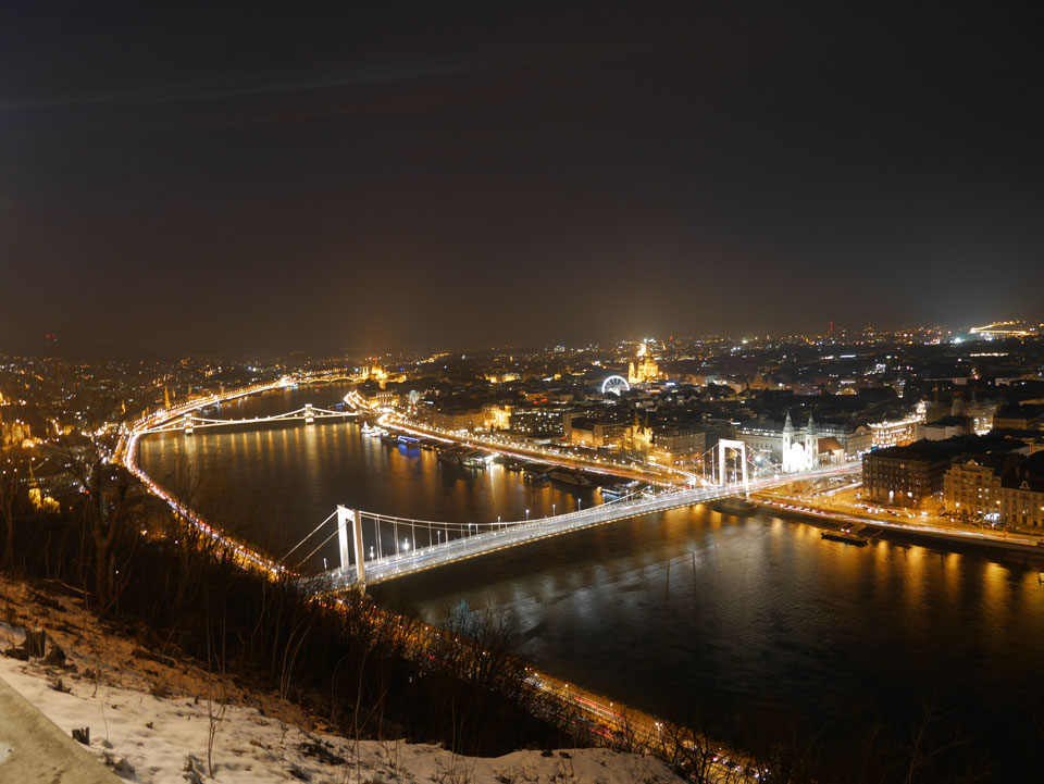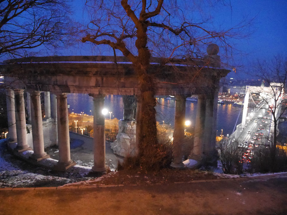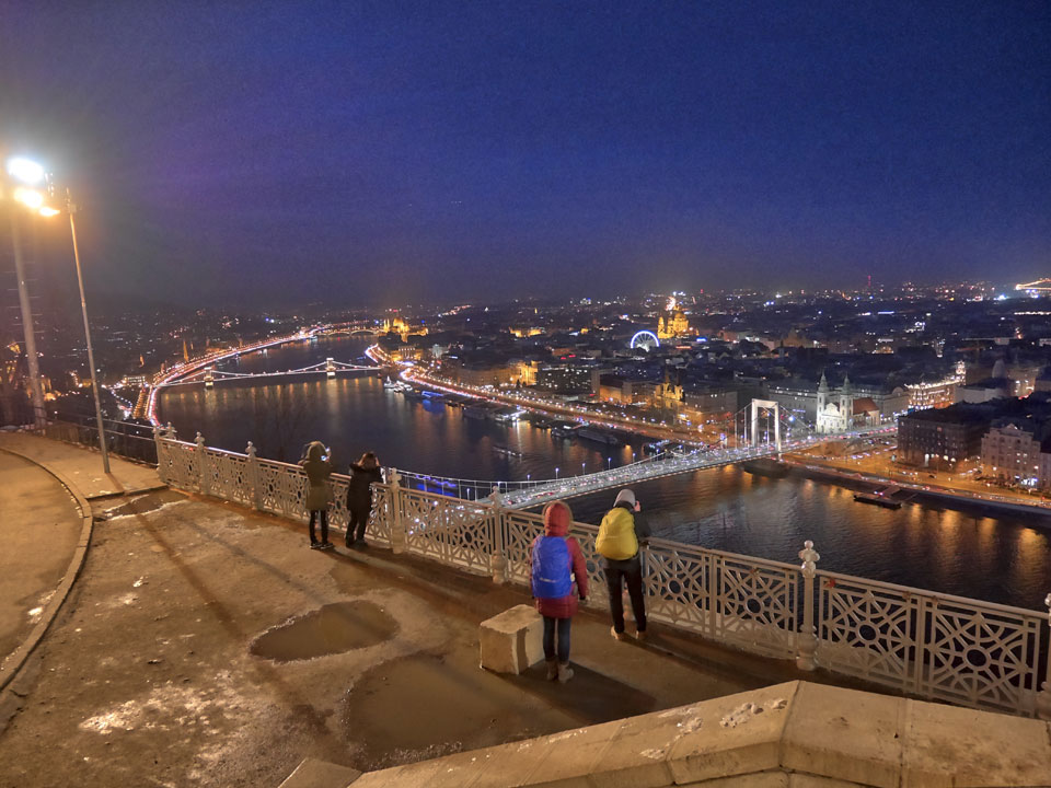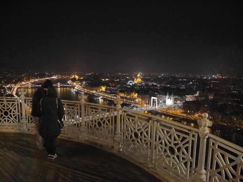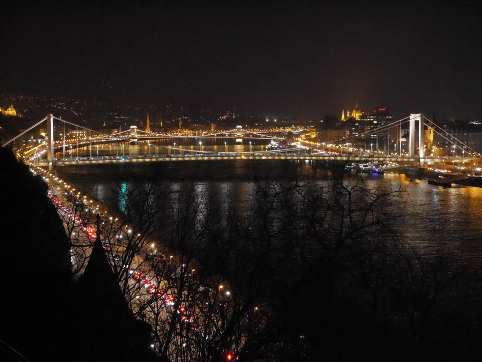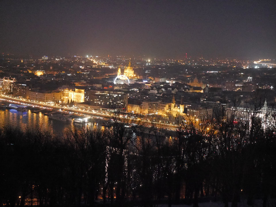 Mit den Jogging-Schuhen war ich zwar schnell unterwegs doch auf dem eisigen Weg bergauf falsch ausgestattet. Nur mit einer Hand am Geländer kam ich teilweise vorwärts, rutschte sonst immer wieder. Da hatte ich natürlich Bammel um die Lumix. Oben dann war’s inzwischen richtig Abend, die Bauwerke Budapests erstrahlten im Licht. Auch das hatte ich so schon mal gesehen, ist aber auch immer wieder nett. Die Lumix ging oft bis zu 12800, die ich als ISO-Grenze setzte. Das Bildrauschen ist für Hobby da immer noch akzeptabel, schon Klasse!