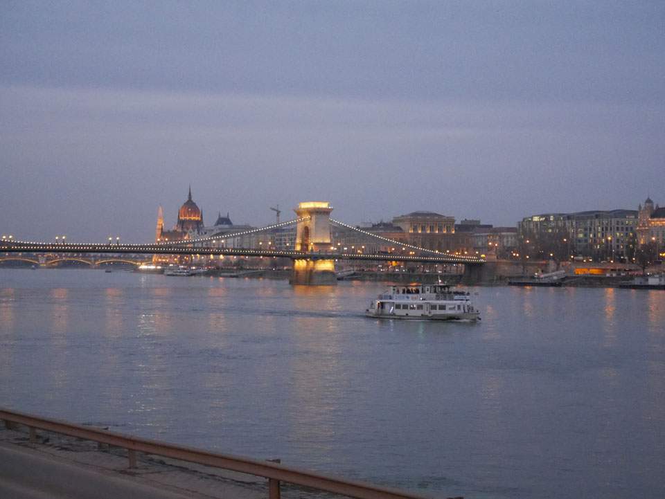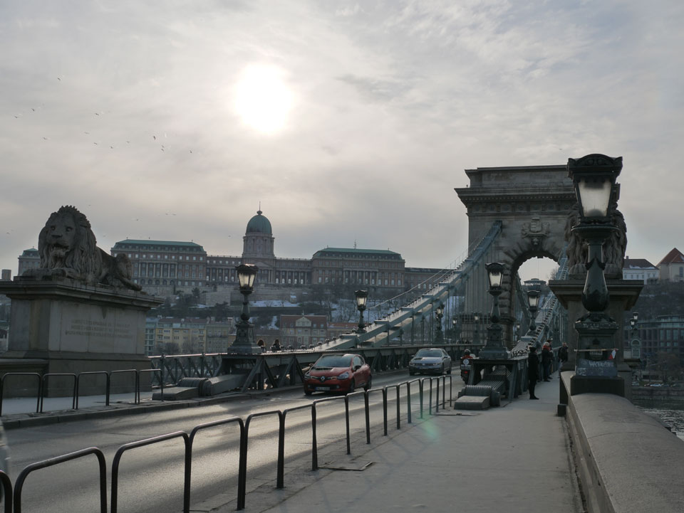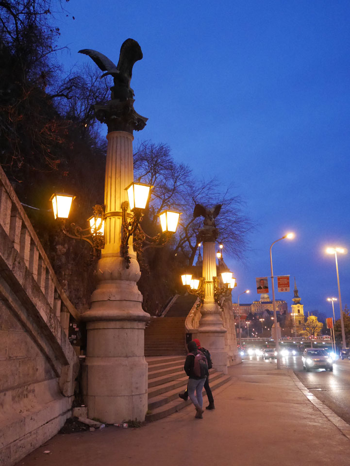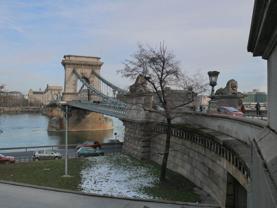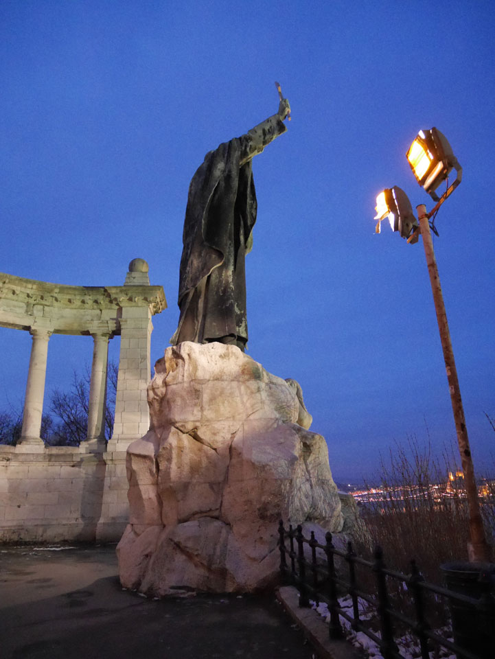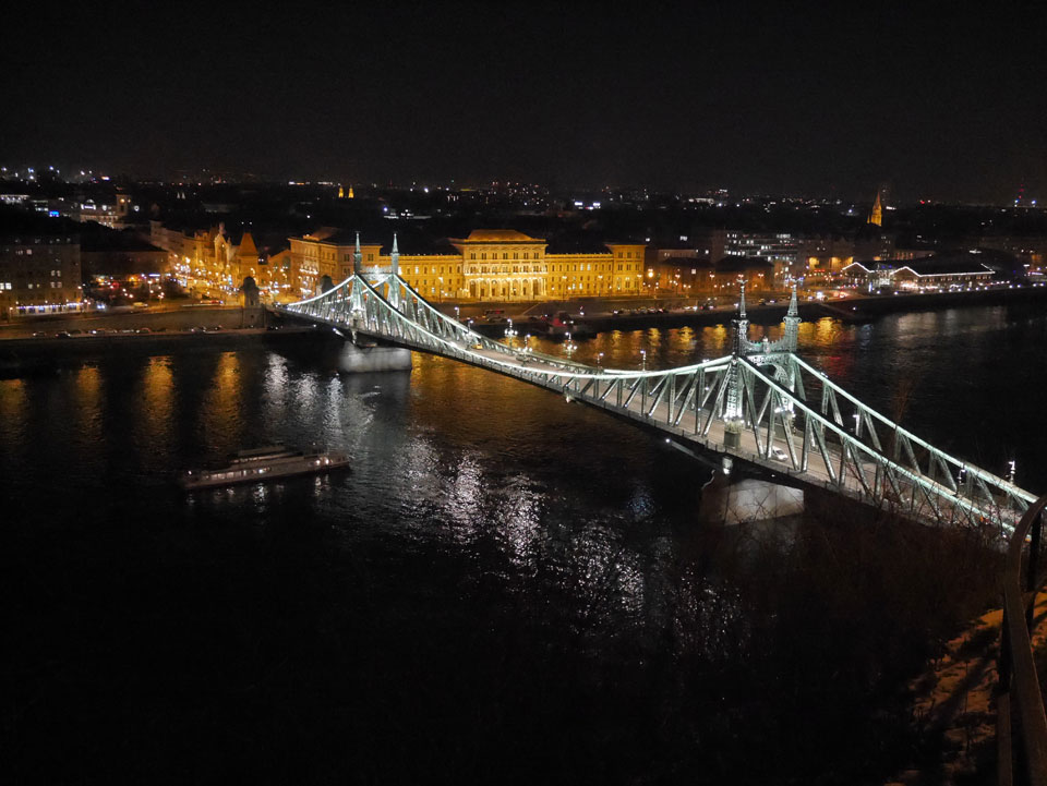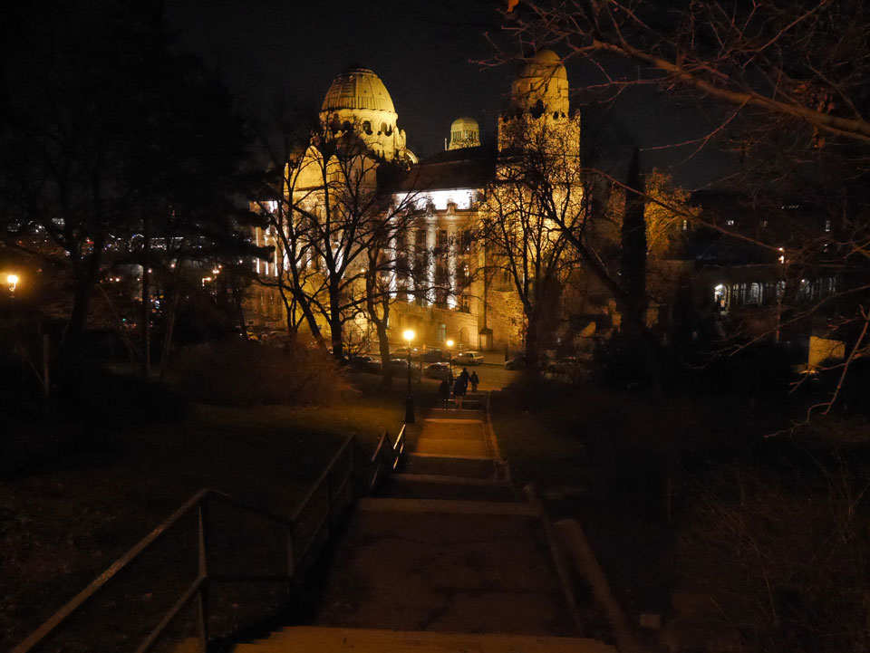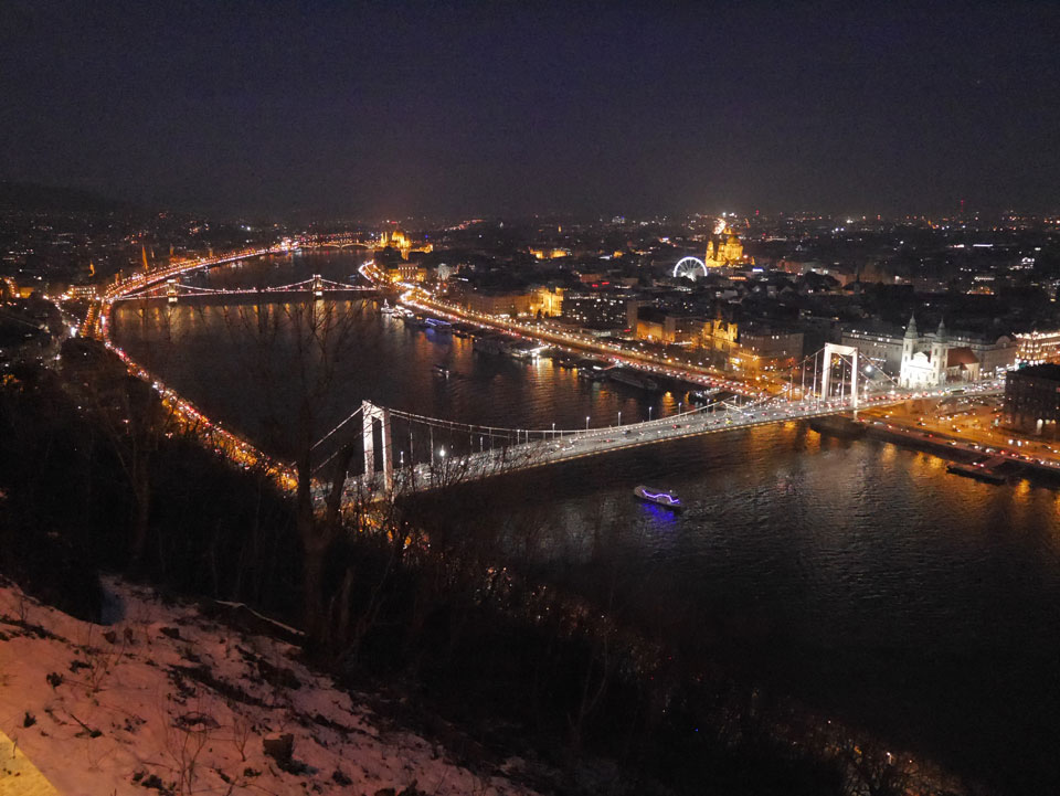 Mit den Jogging-Schuhen war ich zwar schnell unterwegs doch auf dem eisigen Weg bergauf falsch ausgestattet. Nur mit einer Hand am Geländer kam ich teilweise vorwärts, rutschte sonst immer wieder. Da hatte ich natürlich Bammel um die Lumix. Oben dann war’s inzwischen richtig Abend, die Bauwerke Budapests erstrahlten im Licht. Auch das hatte ich so schon mal gesehen, ist aber auch immer wieder nett. Die Lumix ging oft bis zu 12800, die ich als ISO-Grenze setzte. Das Bildrauschen ist für Hobby da immer noch akzeptabel, schon Klasse!