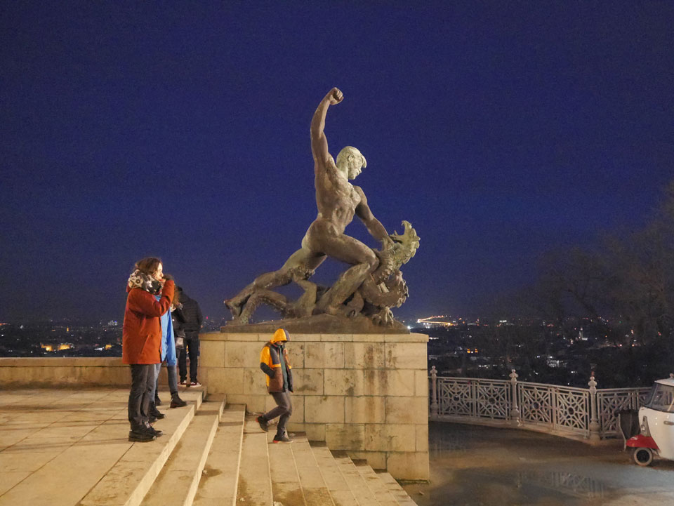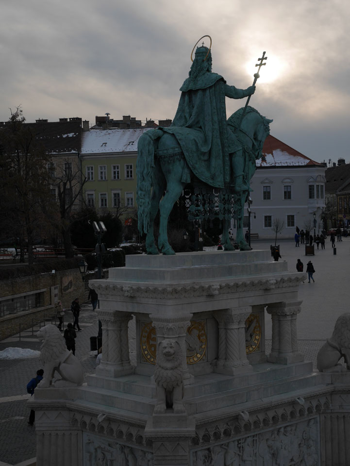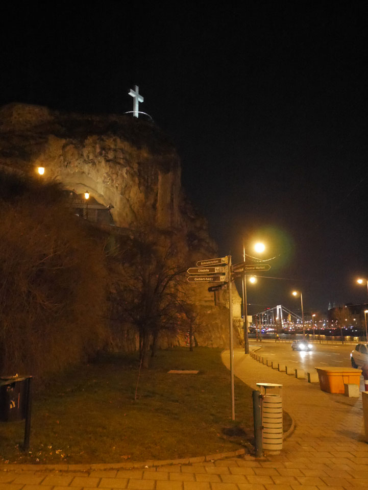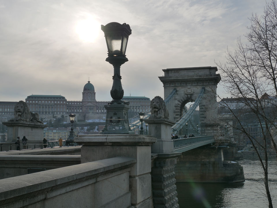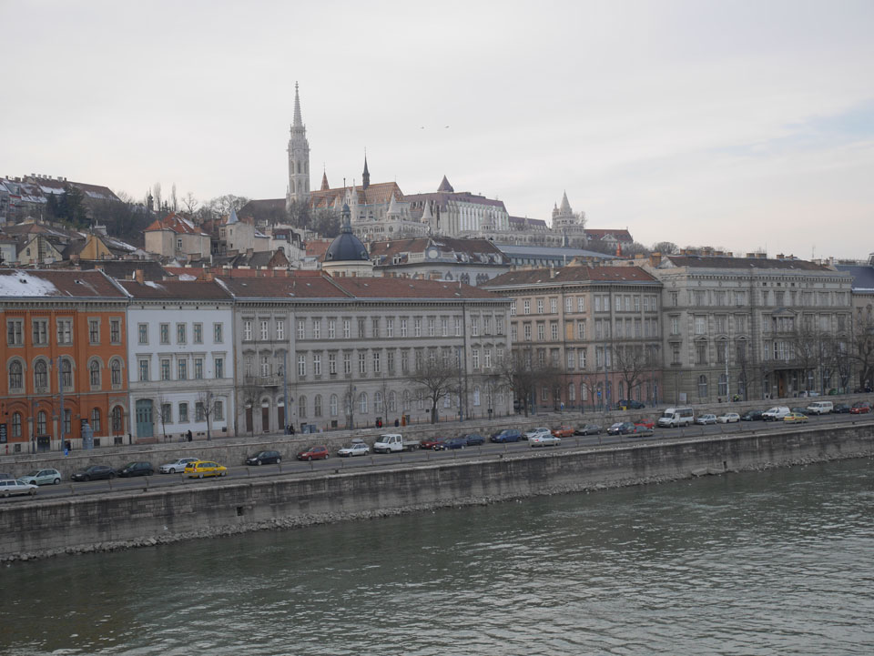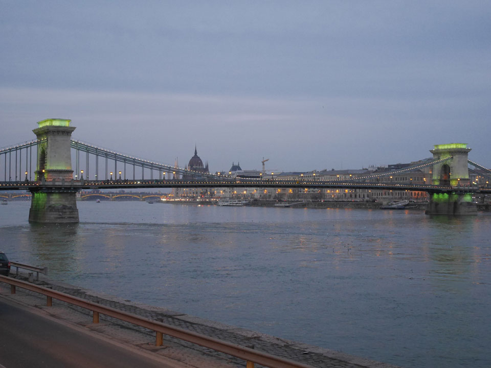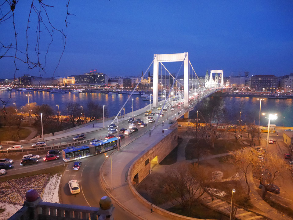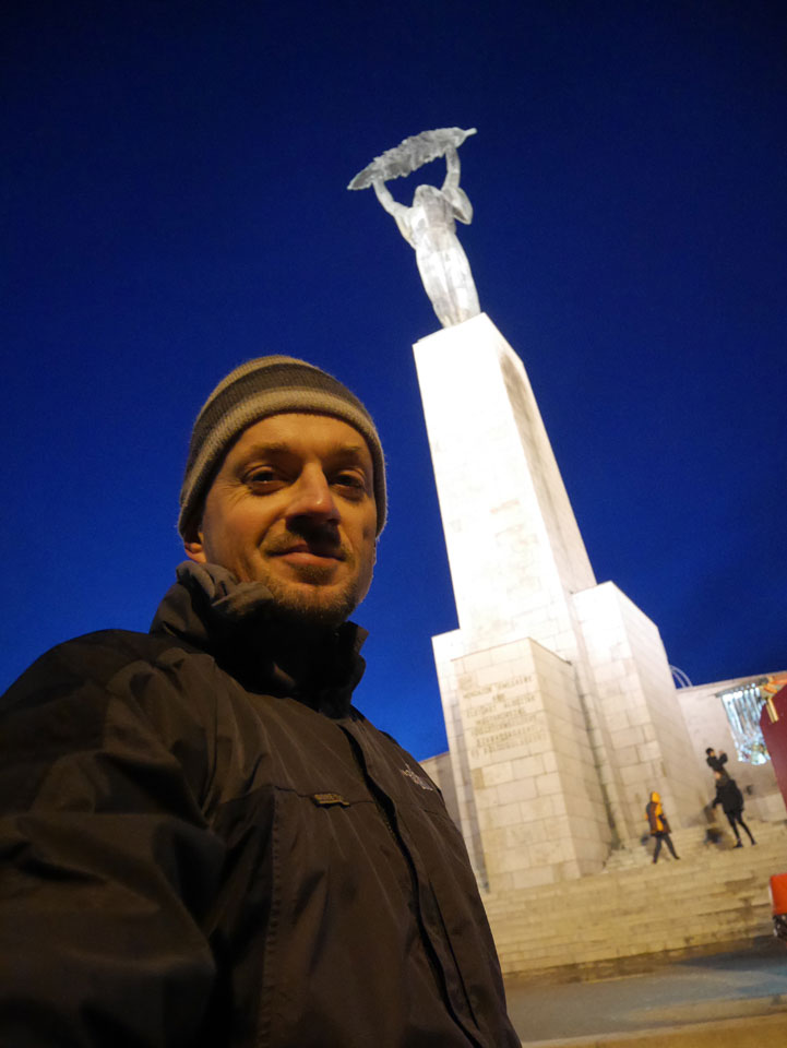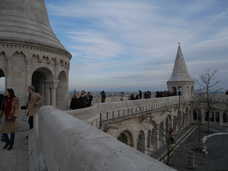 Mit den Jogging-Schuhen war ich zwar schnell unterwegs doch auf dem eisigen Weg bergauf falsch ausgestattet. Nur mit einer Hand am Geländer kam ich teilweise vorwärts, rutschte sonst immer wieder. Da hatte ich natürlich Bammel um die Lumix. Oben dann war’s inzwischen richtig Abend, die Bauwerke Budapests erstrahlten im Licht. Auch das hatte ich so schon mal gesehen, ist aber auch immer wieder nett. Die Lumix ging oft bis zu 12800, die ich als ISO-Grenze setzte. Das Bildrauschen ist für Hobby da immer noch akzeptabel, schon Klasse!