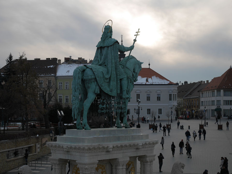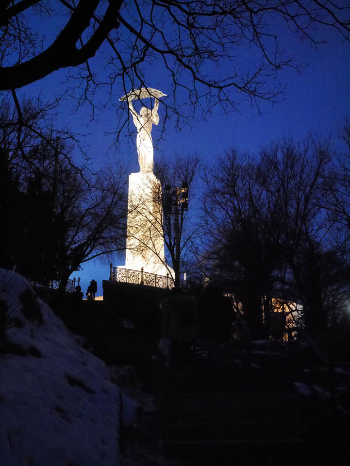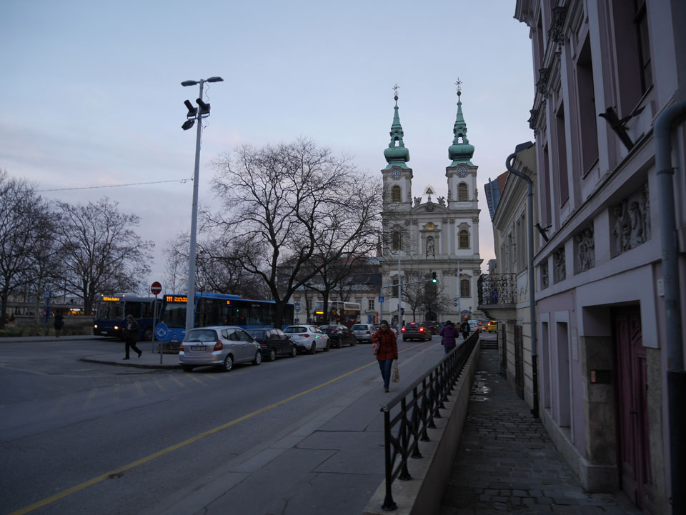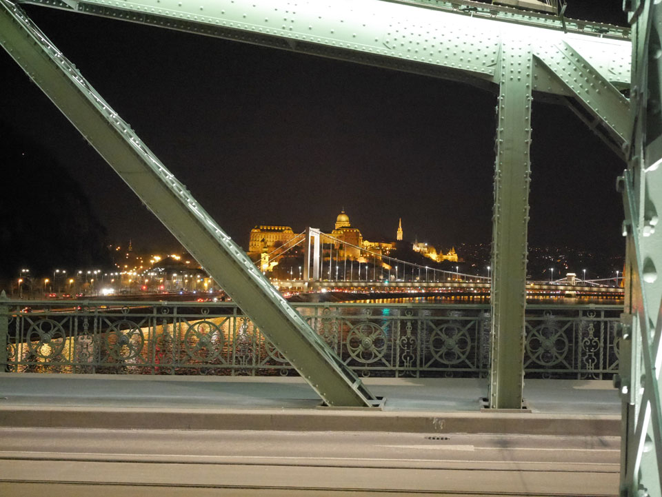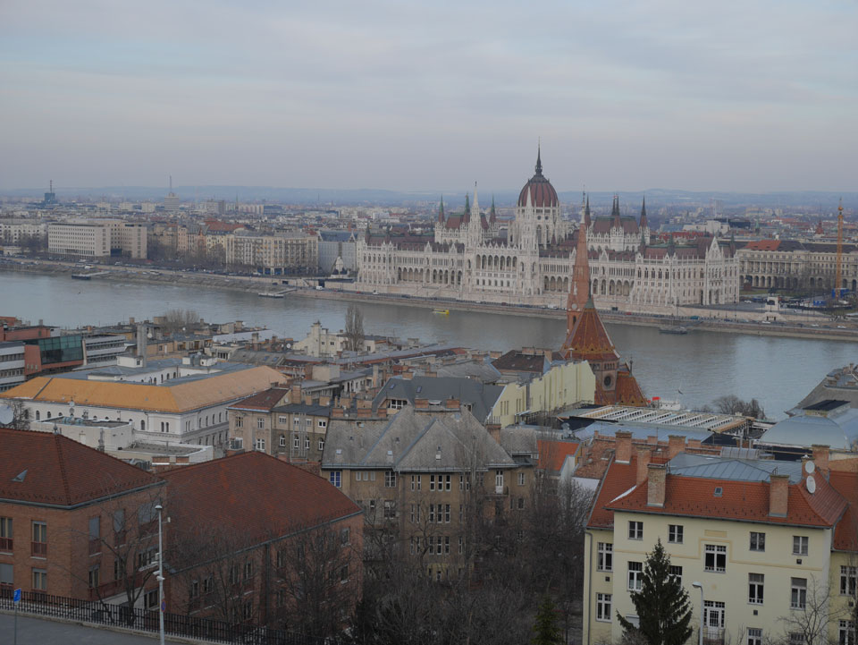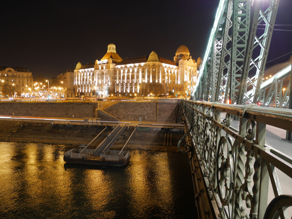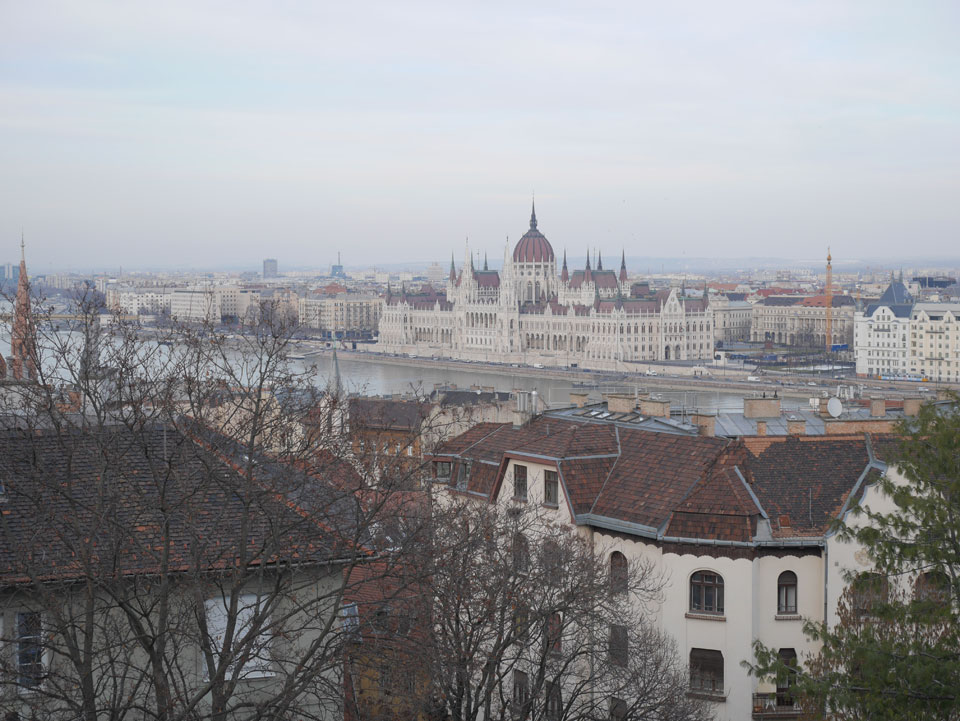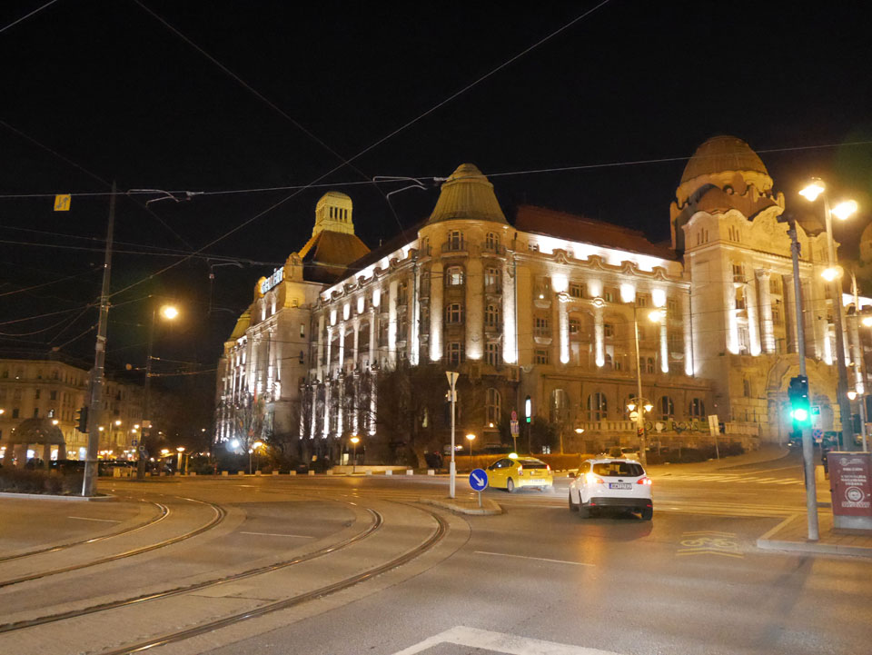 Mit den Jogging-Schuhen war ich zwar schnell unterwegs doch auf dem eisigen Weg bergauf falsch ausgestattet. Nur mit einer Hand am Geländer kam ich teilweise vorwärts, rutschte sonst immer wieder. Da hatte ich natürlich Bammel um die Lumix. Oben dann war’s inzwischen richtig Abend, die Bauwerke Budapests erstrahlten im Licht. Auch das hatte ich so schon mal gesehen, ist aber auch immer wieder nett. Die Lumix ging oft bis zu 12800, die ich als ISO-Grenze setzte. Das Bildrauschen ist für Hobby da immer noch akzeptabel, schon Klasse!