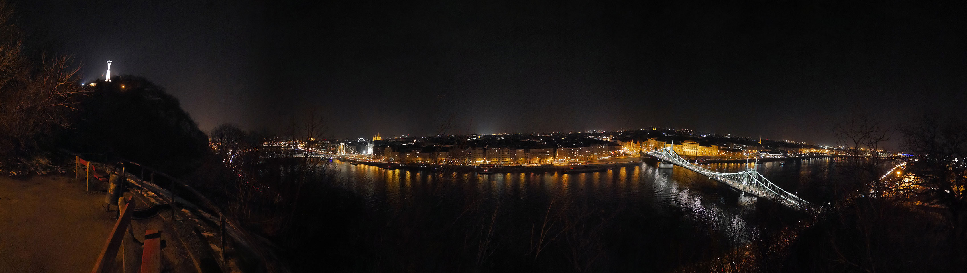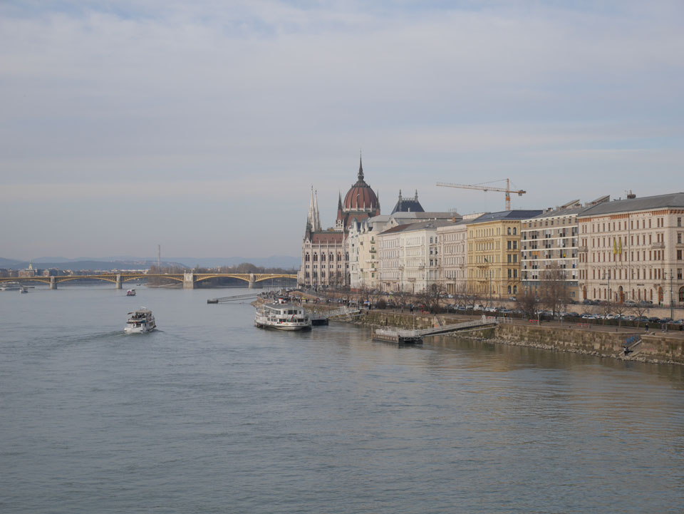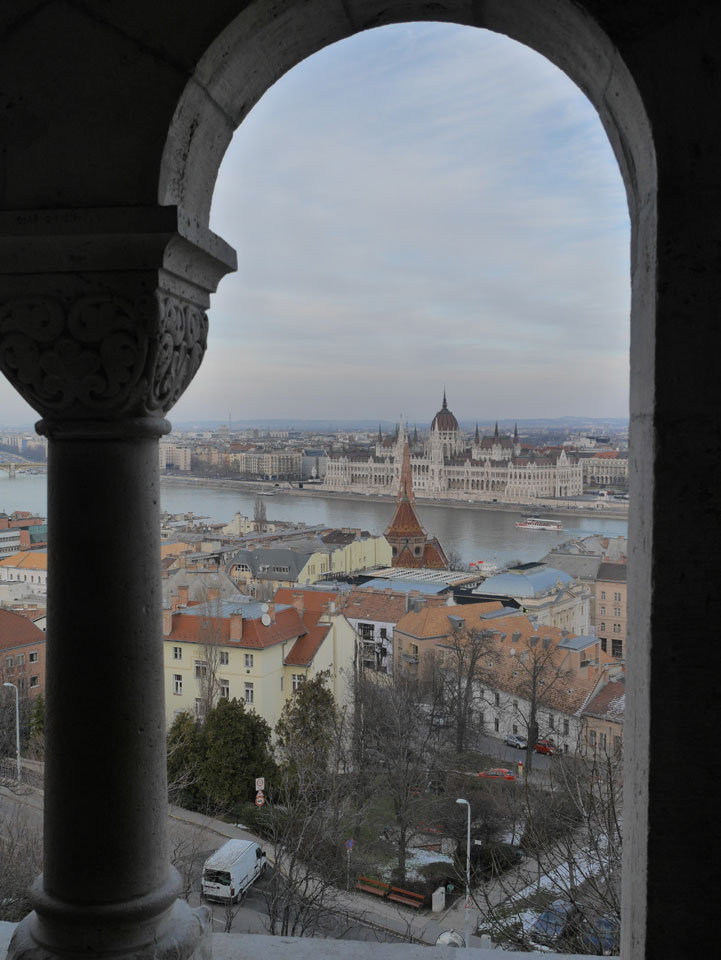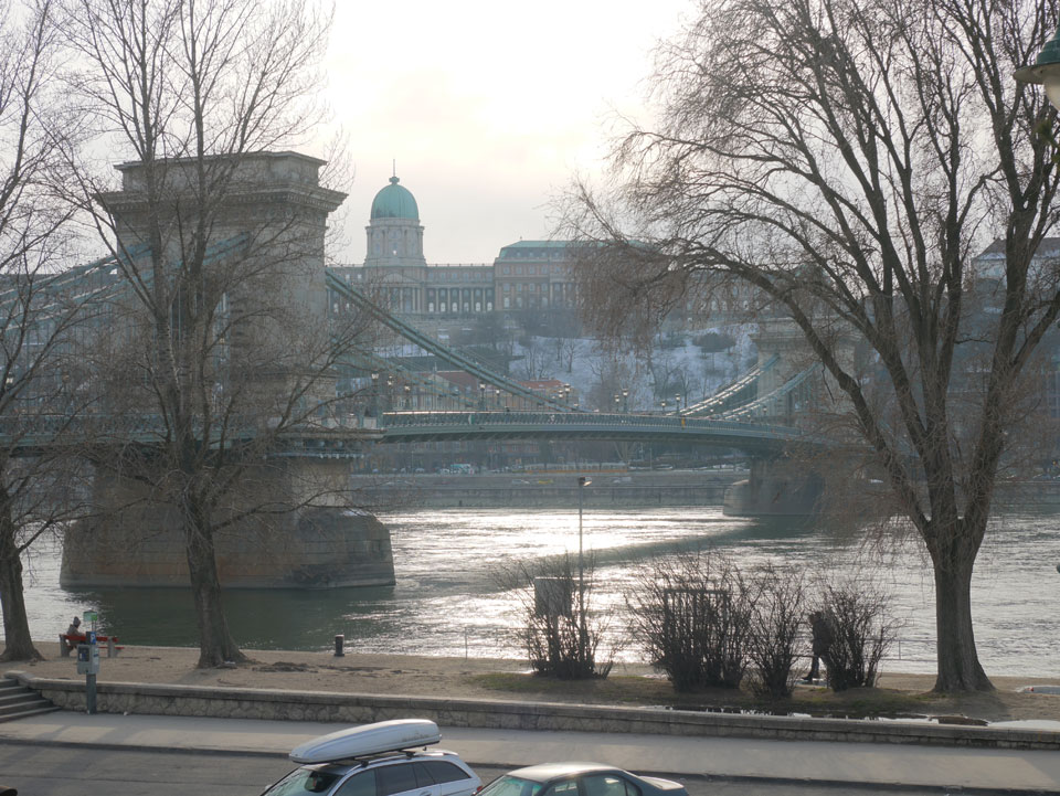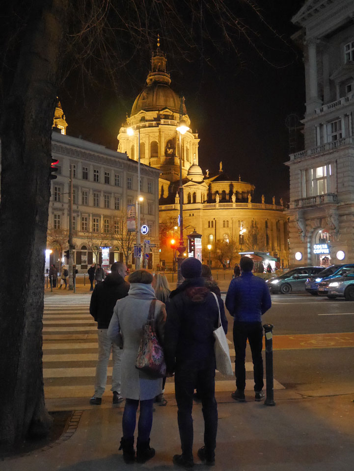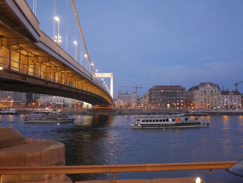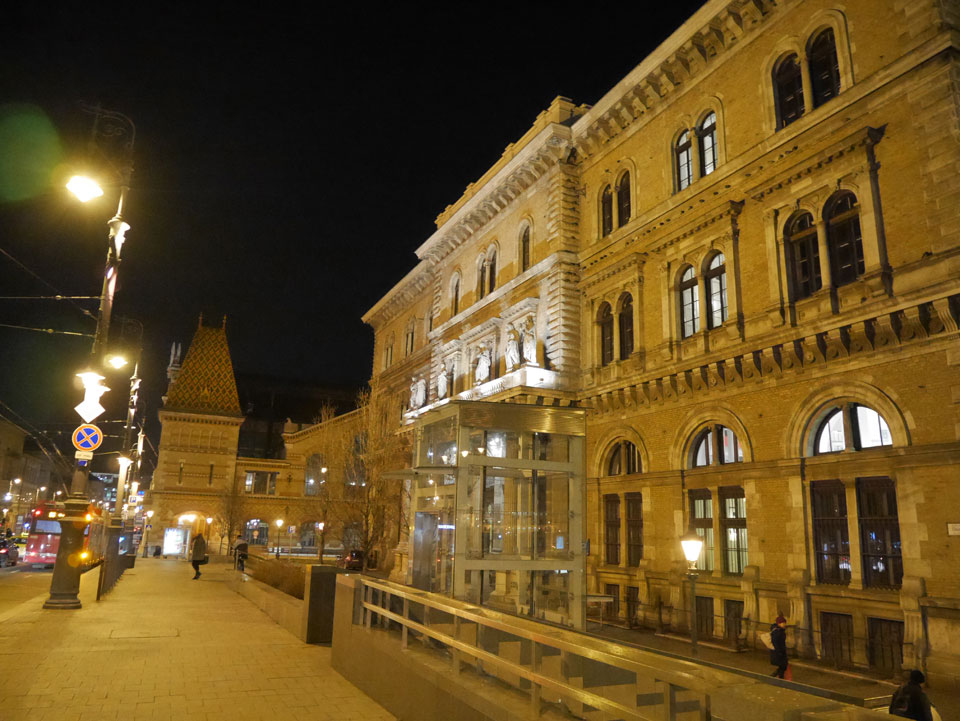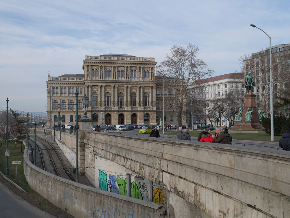 Mit den Jogging-Schuhen war ich zwar schnell unterwegs doch auf dem eisigen Weg bergauf falsch ausgestattet. Nur mit einer Hand am Geländer kam ich teilweise vorwärts, rutschte sonst immer wieder. Da hatte ich natürlich Bammel um die Lumix. Oben dann war’s inzwischen richtig Abend, die Bauwerke Budapests erstrahlten im Licht. Auch das hatte ich so schon mal gesehen, ist aber auch immer wieder nett. Die Lumix ging oft bis zu 12800, die ich als ISO-Grenze setzte. Das Bildrauschen ist für Hobby da immer noch akzeptabel, schon Klasse!