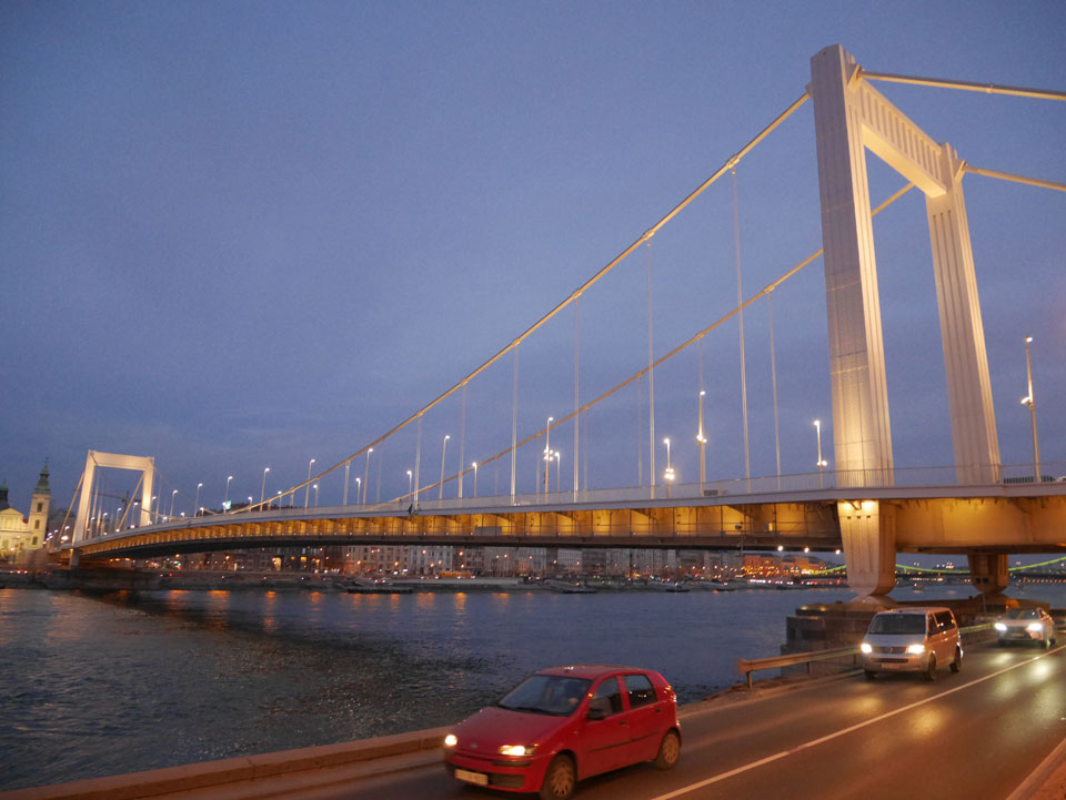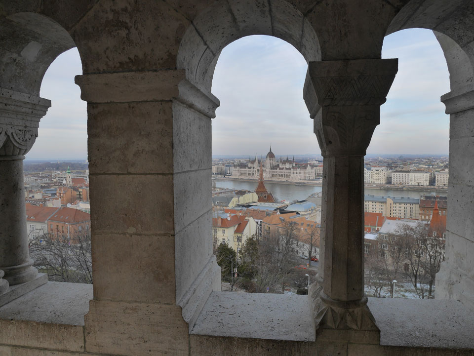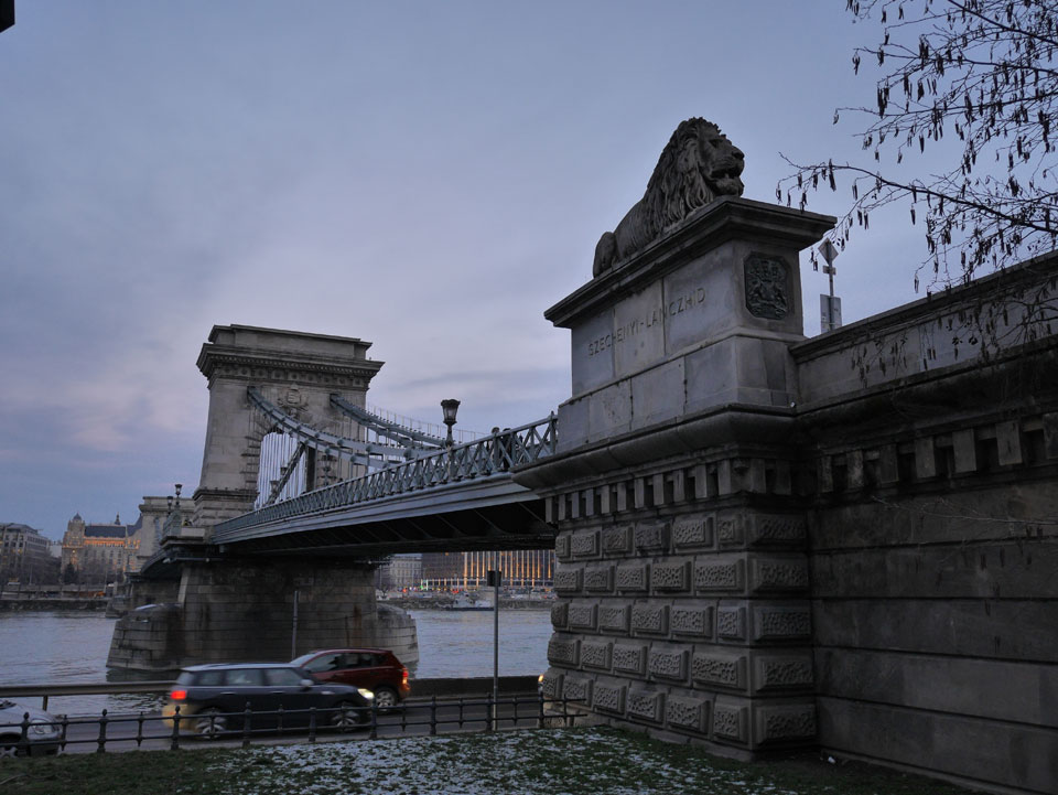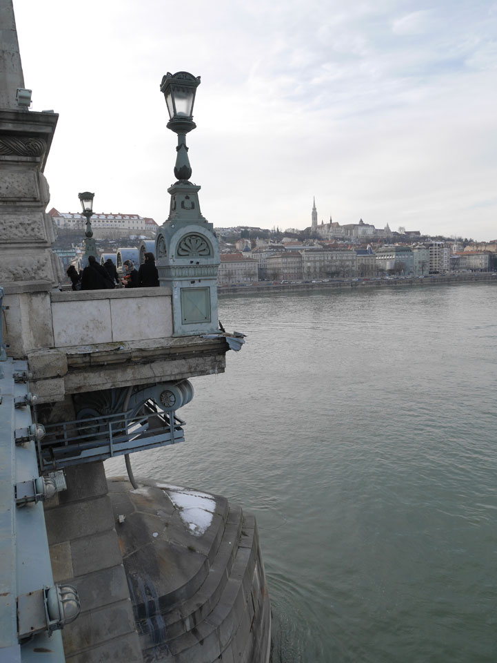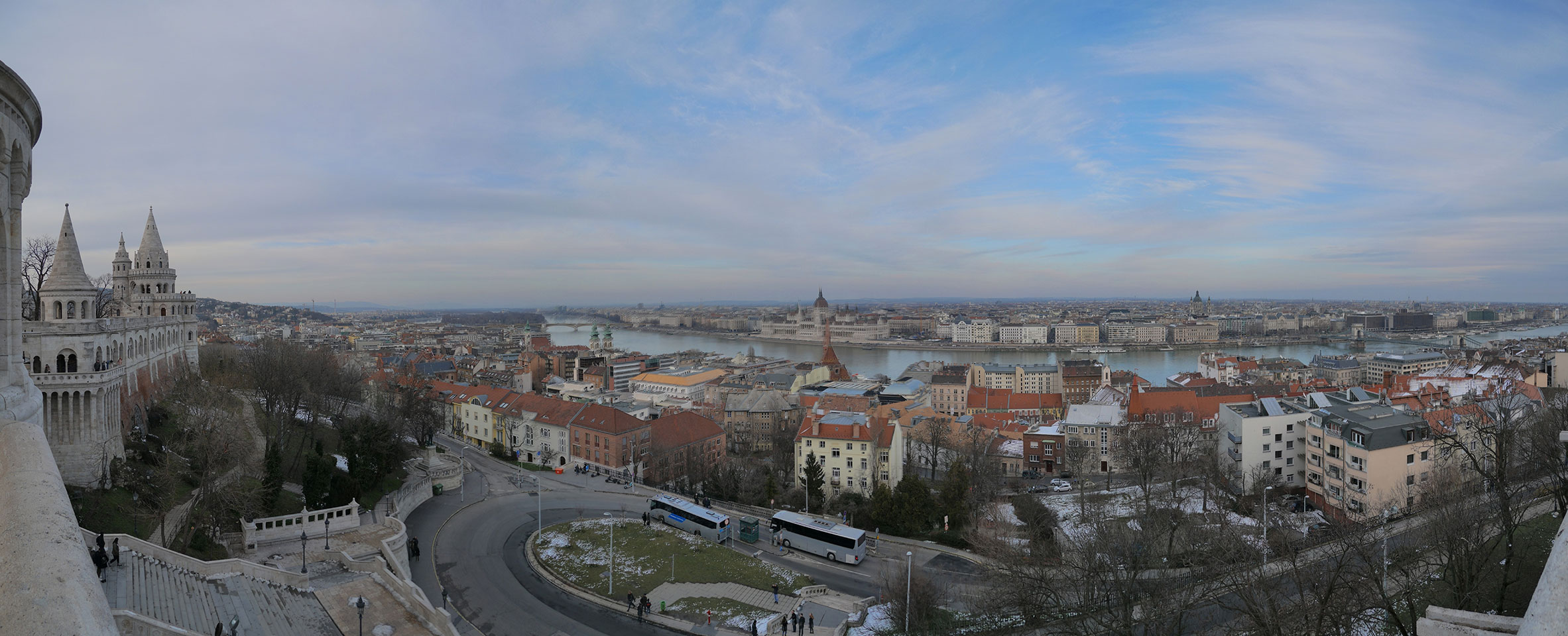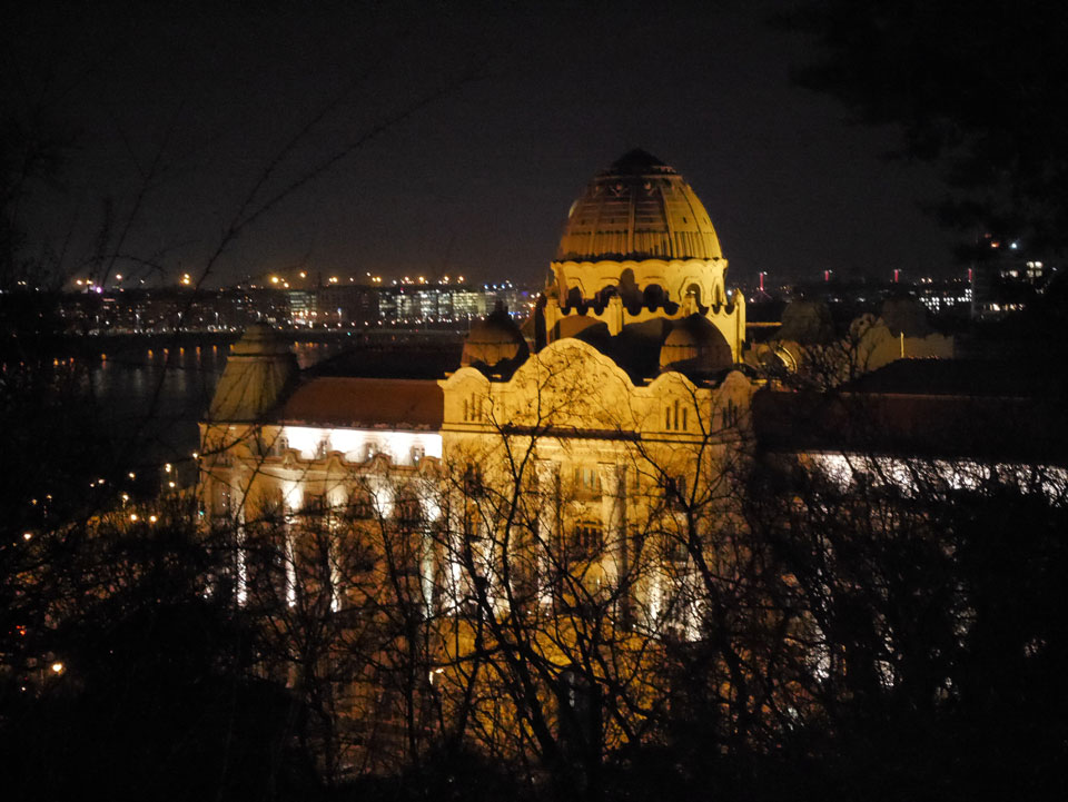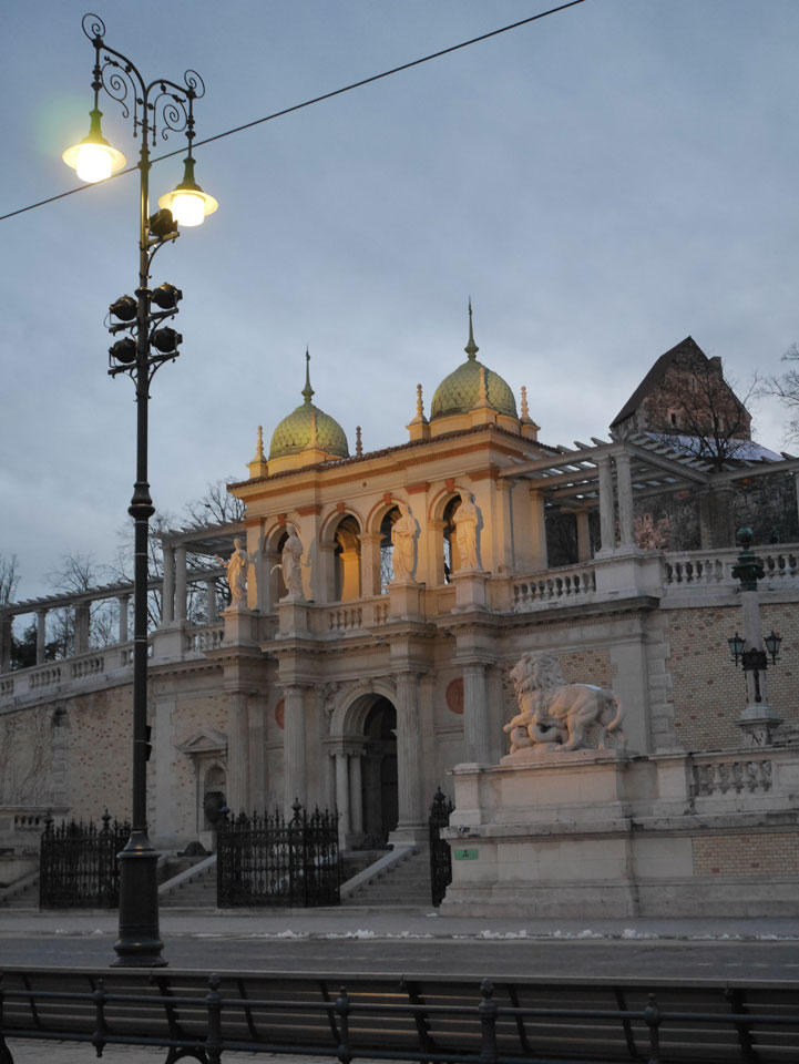 Mit den Jogging-Schuhen war ich zwar schnell unterwegs doch auf dem eisigen Weg bergauf falsch ausgestattet. Nur mit einer Hand am Geländer kam ich teilweise vorwärts, rutschte sonst immer wieder. Da hatte ich natürlich Bammel um die Lumix. Oben dann war’s inzwischen richtig Abend, die Bauwerke Budapests erstrahlten im Licht. Auch das hatte ich so schon mal gesehen, ist aber auch immer wieder nett. Die Lumix ging oft bis zu 12800, die ich als ISO-Grenze setzte. Das Bildrauschen ist für Hobby da immer noch akzeptabel, schon Klasse!