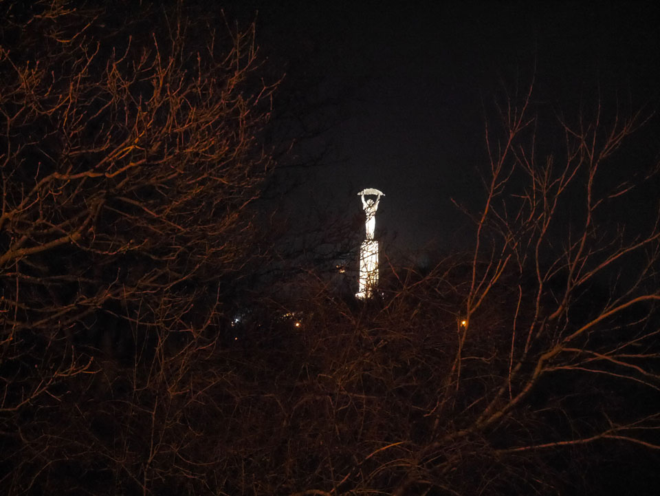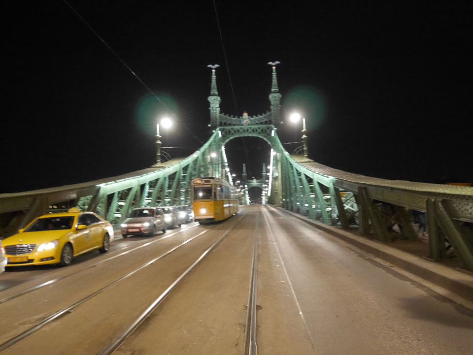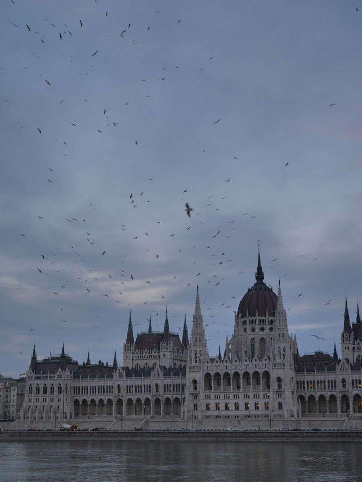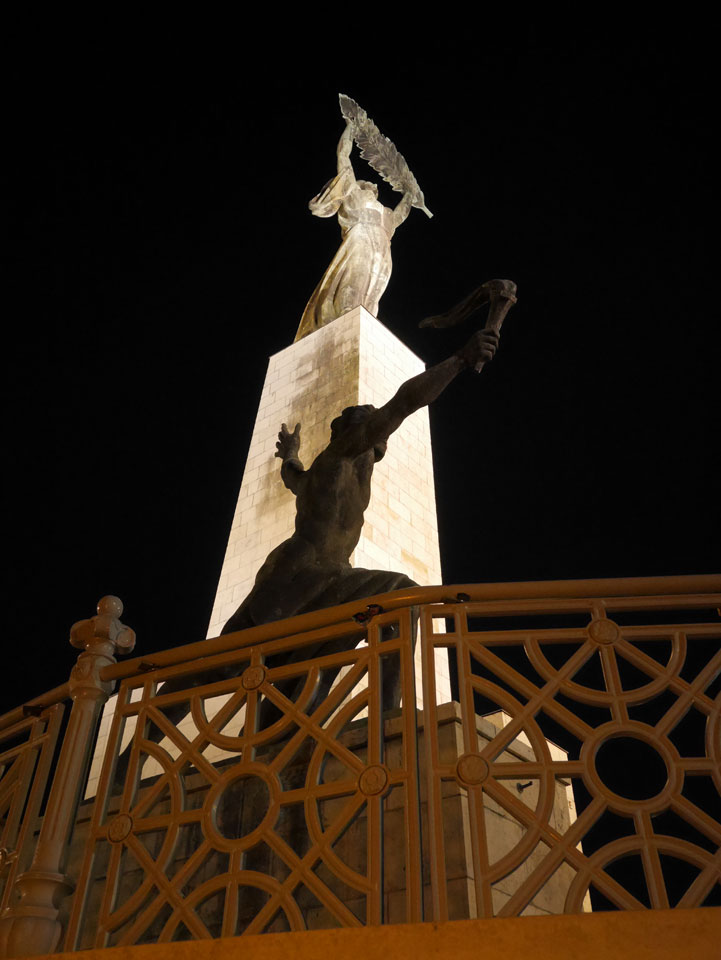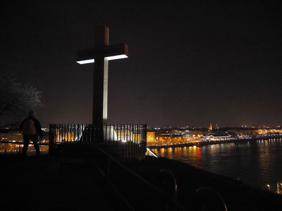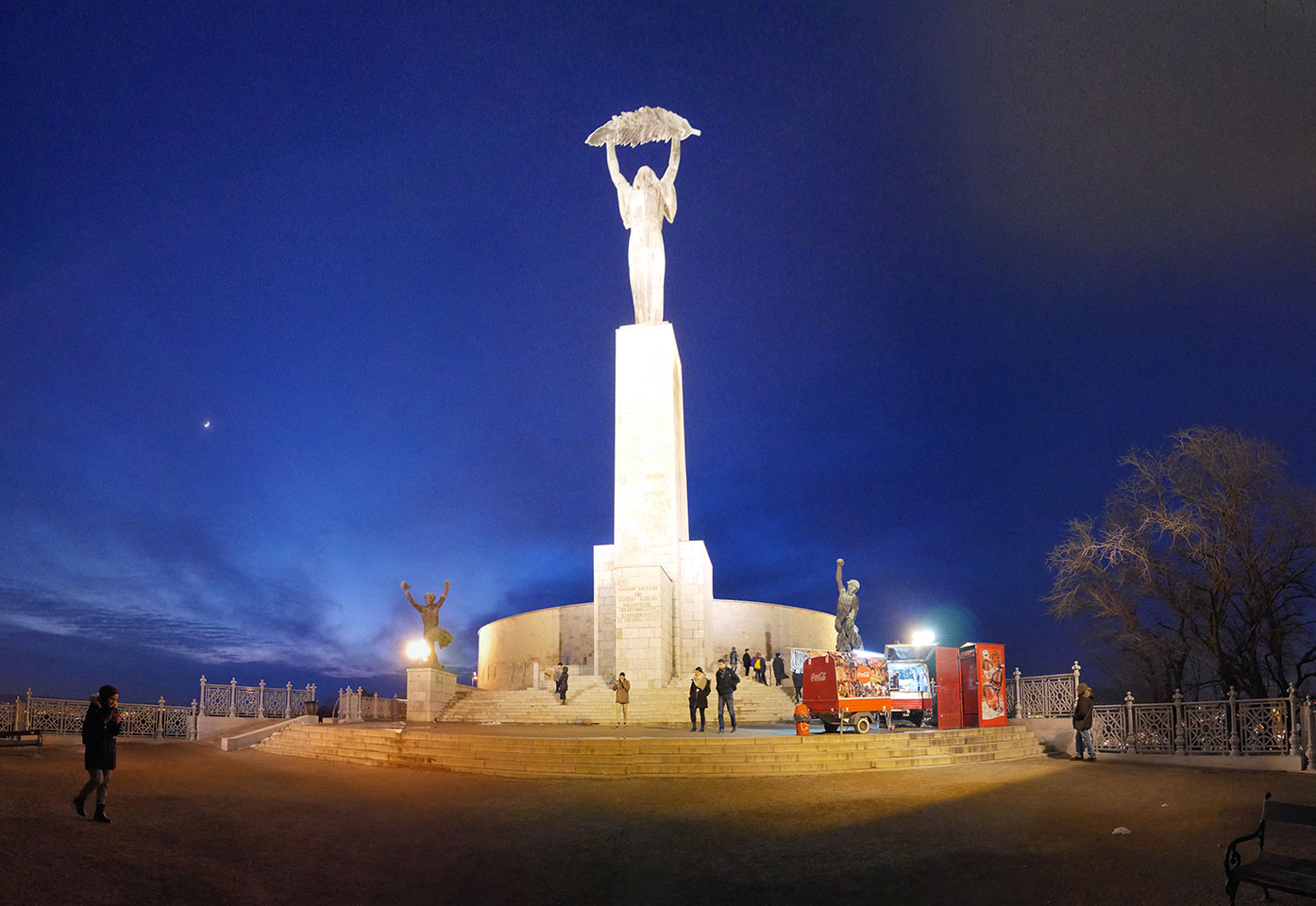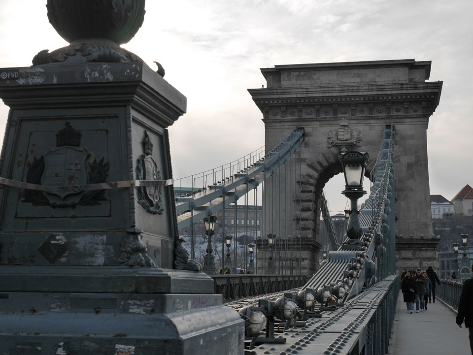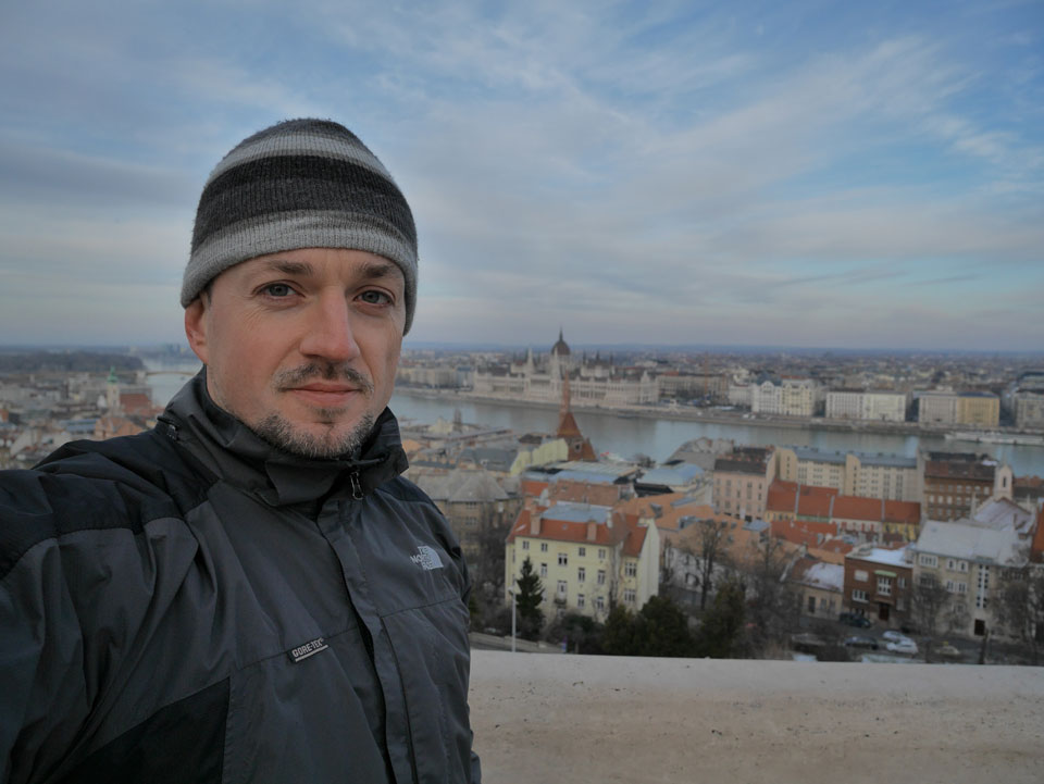 Mit den Jogging-Schuhen war ich zwar schnell unterwegs doch auf dem eisigen Weg bergauf falsch ausgestattet. Nur mit einer Hand am Geländer kam ich teilweise vorwärts, rutschte sonst immer wieder. Da hatte ich natürlich Bammel um die Lumix. Oben dann war’s inzwischen richtig Abend, die Bauwerke Budapests erstrahlten im Licht. Auch das hatte ich so schon mal gesehen, ist aber auch immer wieder nett. Die Lumix ging oft bis zu 12800, die ich als ISO-Grenze setzte. Das Bildrauschen ist für Hobby da immer noch akzeptabel, schon Klasse!