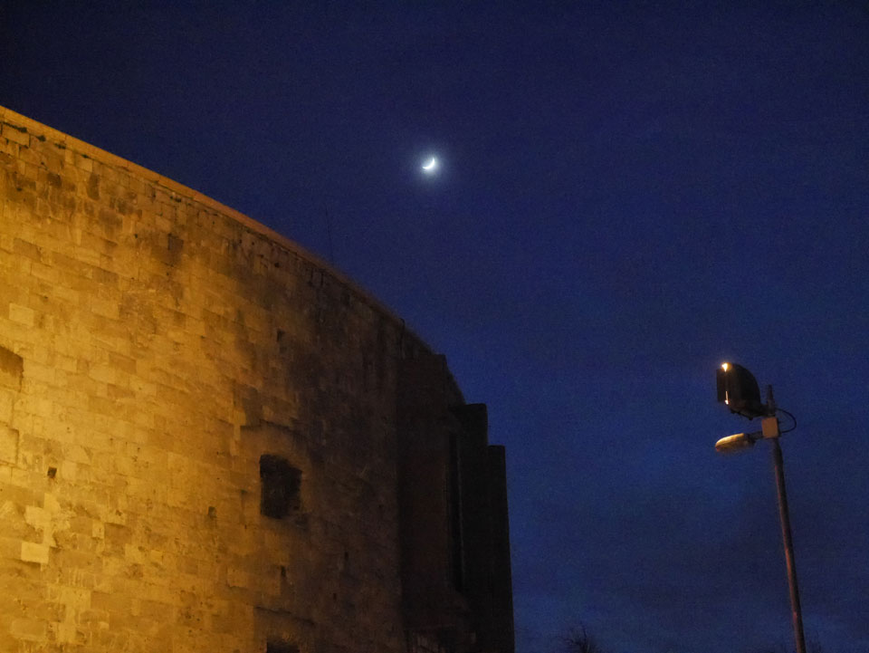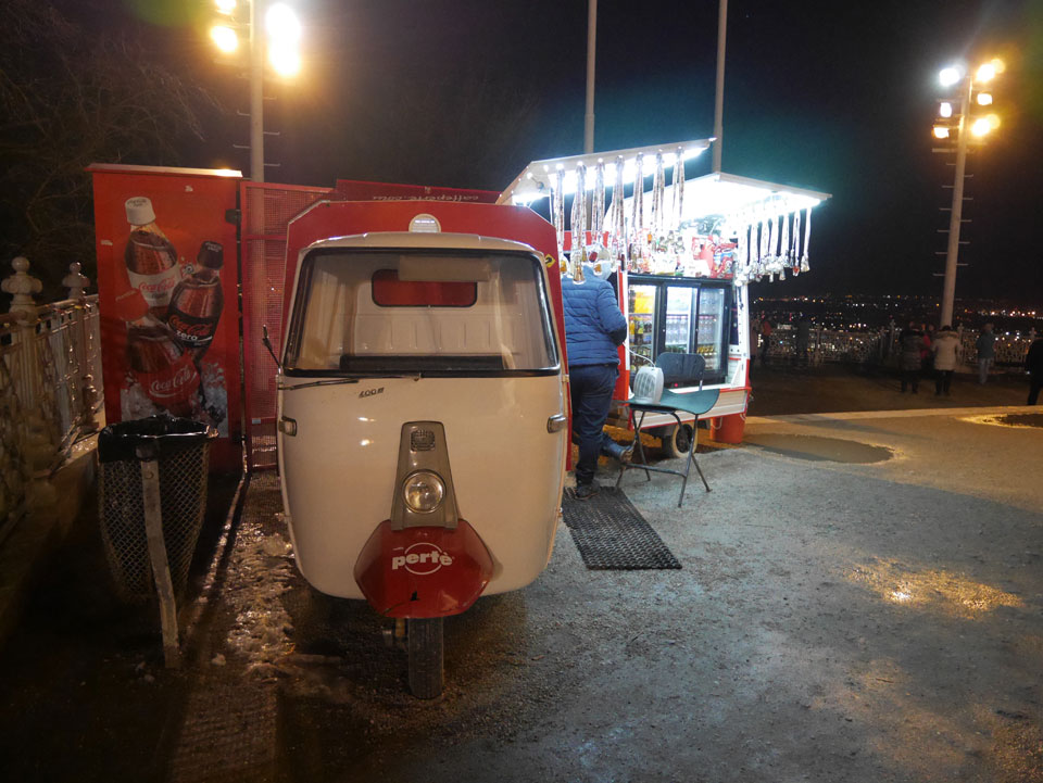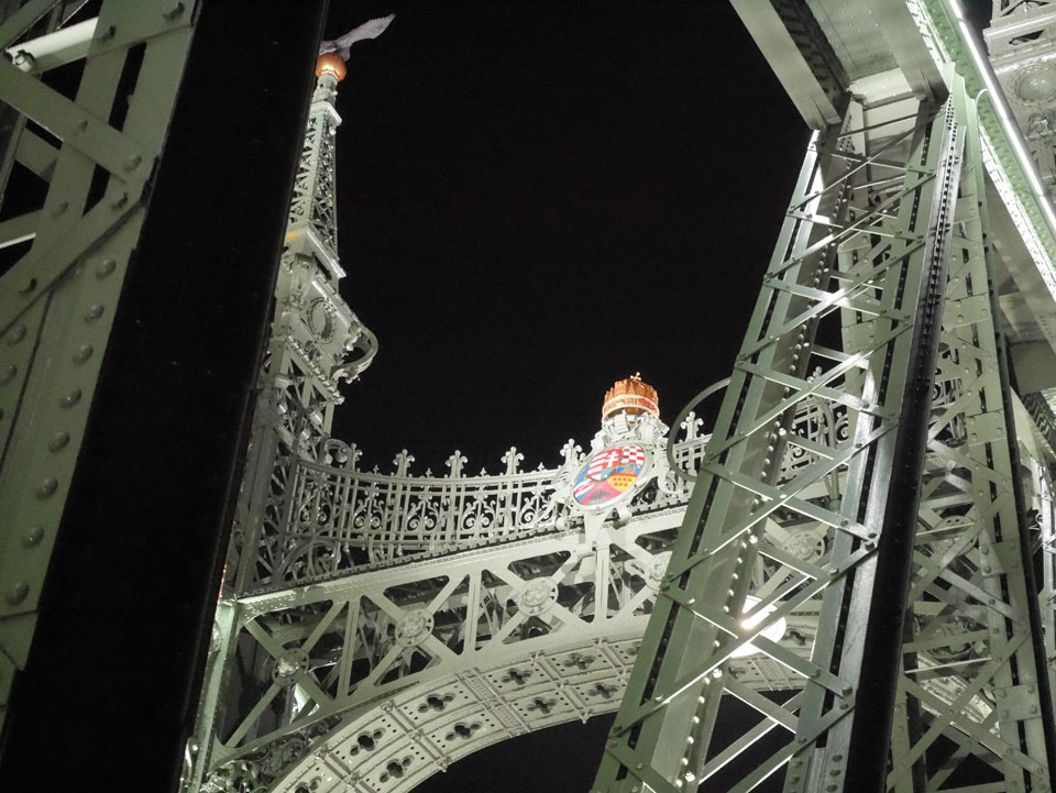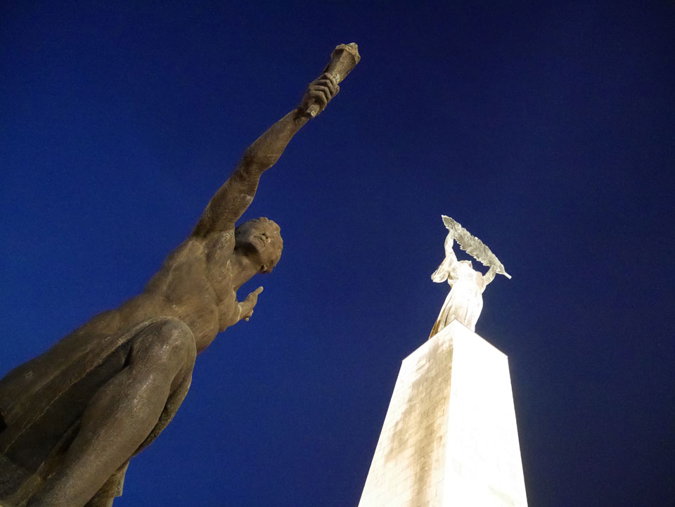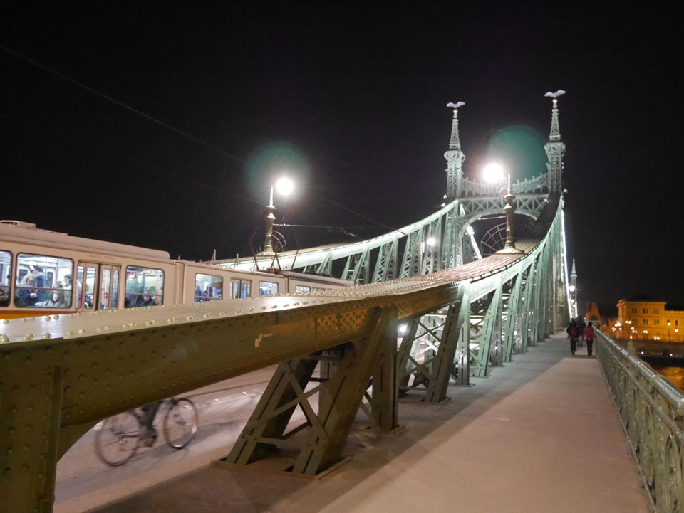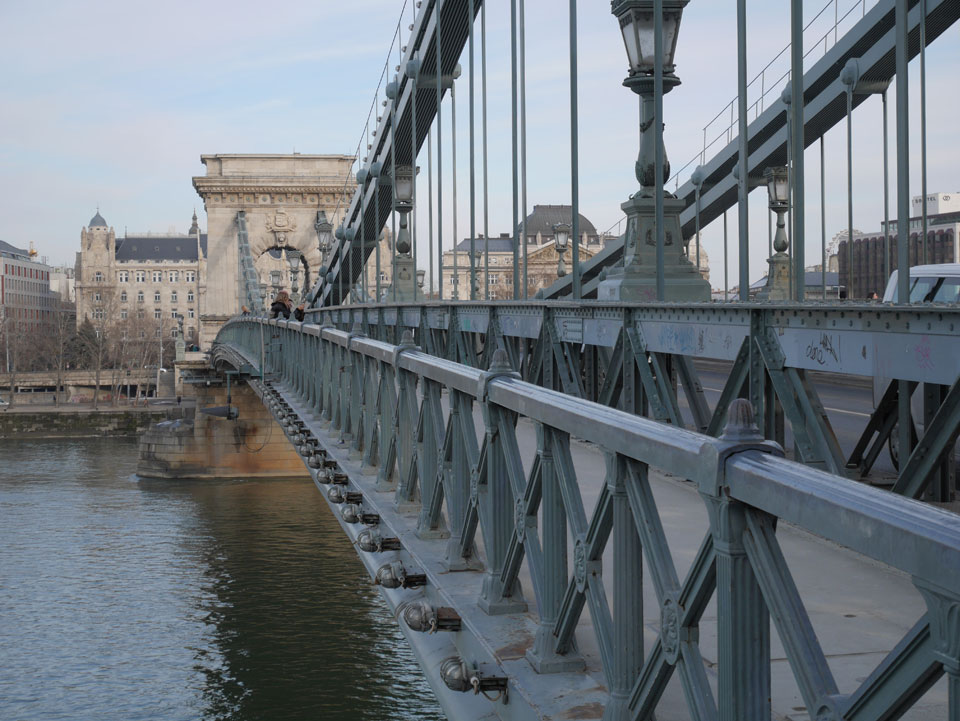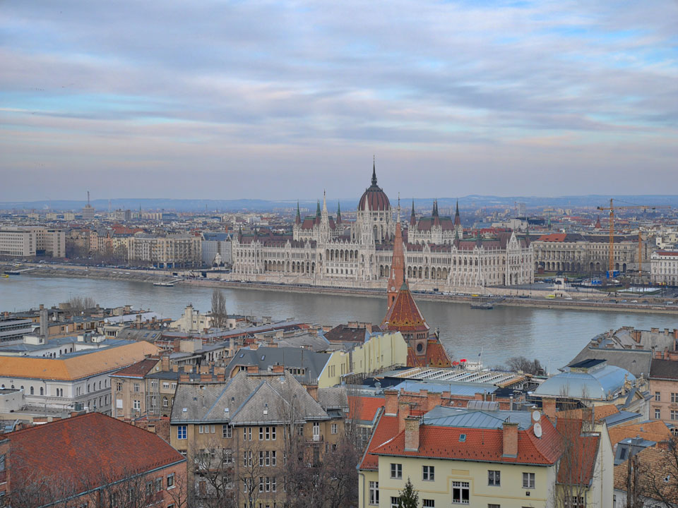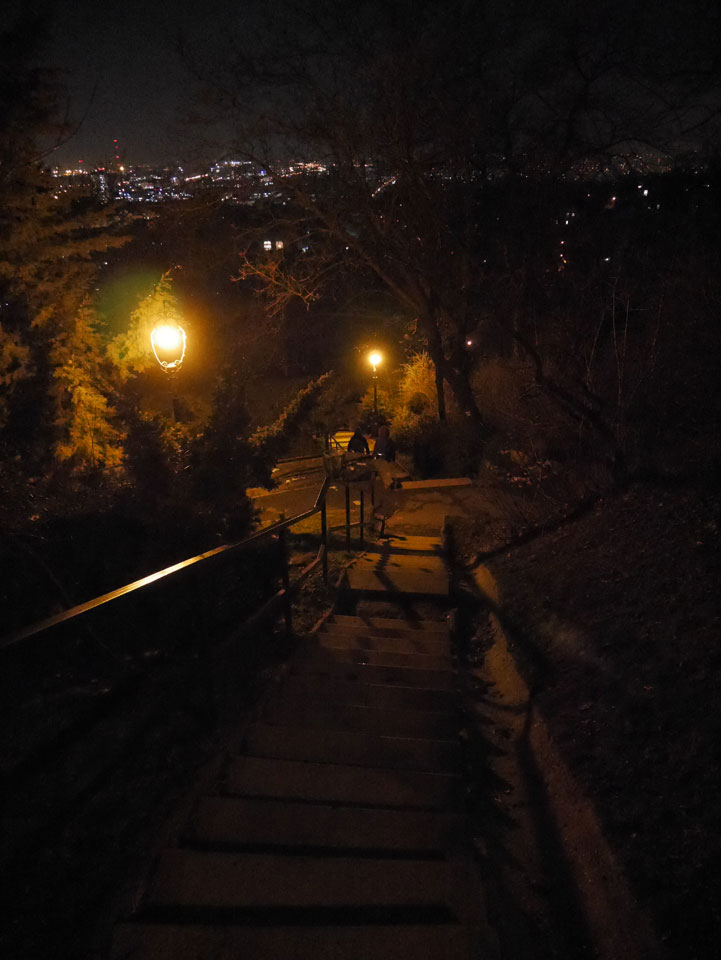 Mit den Jogging-Schuhen war ich zwar schnell unterwegs doch auf dem eisigen Weg bergauf falsch ausgestattet. Nur mit einer Hand am Geländer kam ich teilweise vorwärts, rutschte sonst immer wieder. Da hatte ich natürlich Bammel um die Lumix. Oben dann war’s inzwischen richtig Abend, die Bauwerke Budapests erstrahlten im Licht. Auch das hatte ich so schon mal gesehen, ist aber auch immer wieder nett. Die Lumix ging oft bis zu 12800, die ich als ISO-Grenze setzte. Das Bildrauschen ist für Hobby da immer noch akzeptabel, schon Klasse!
