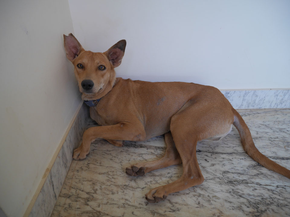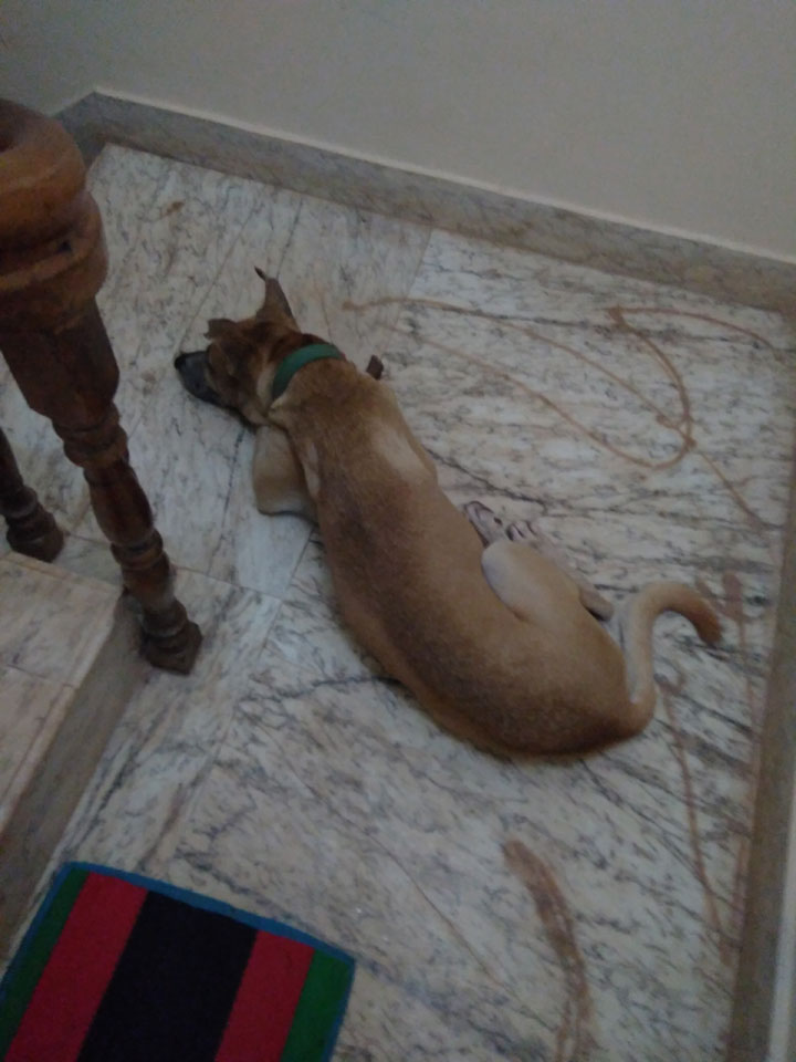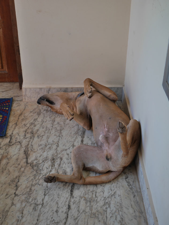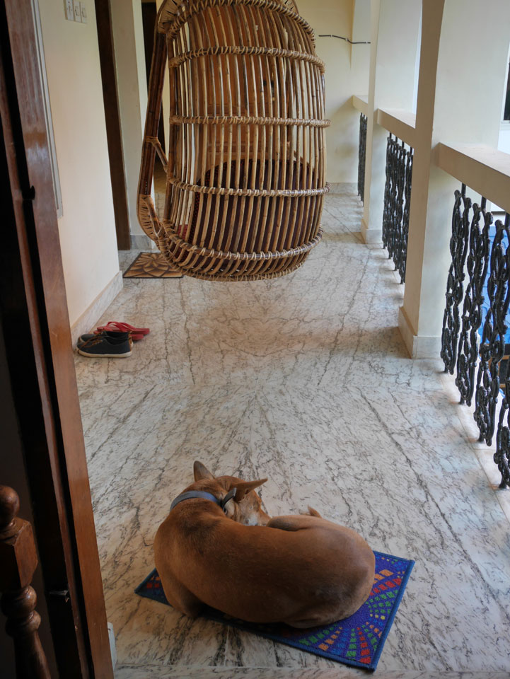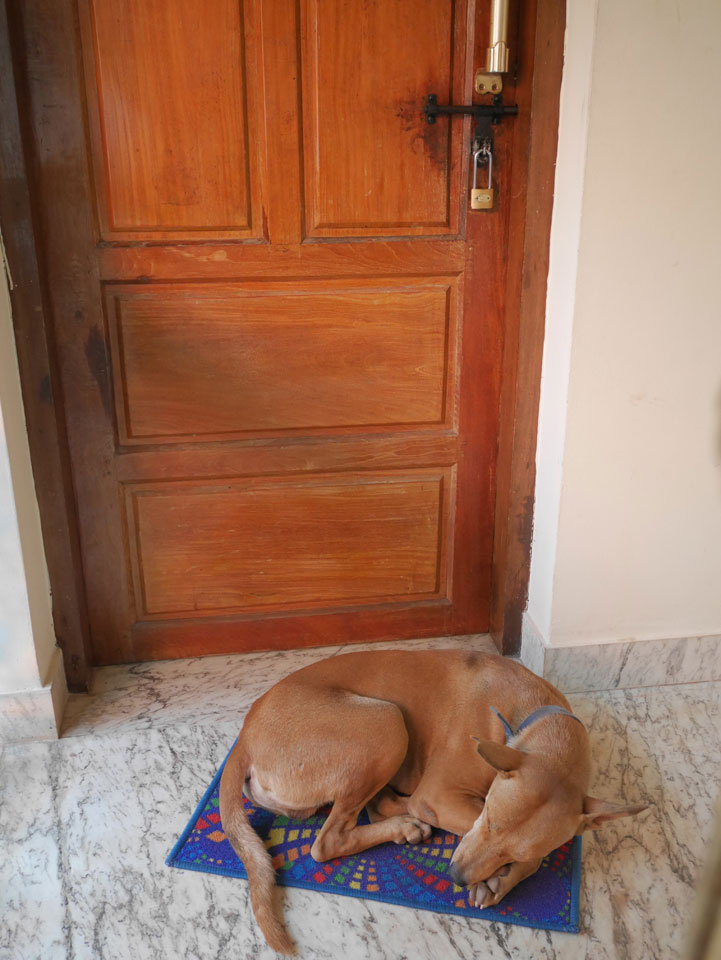 Vor der Tür ein Tier – der Hund war freundlich. Zunächst füllte ich das Registrierungsformular für’s Hotel aus. In Indien ist so etwas detaillierter, wie kaum anderswo. Ich bezahlte drei Nächte statt der gebuchten zwei. Der Preis war etwas höher – €16 / Nacht und doch ohne Frühstück.