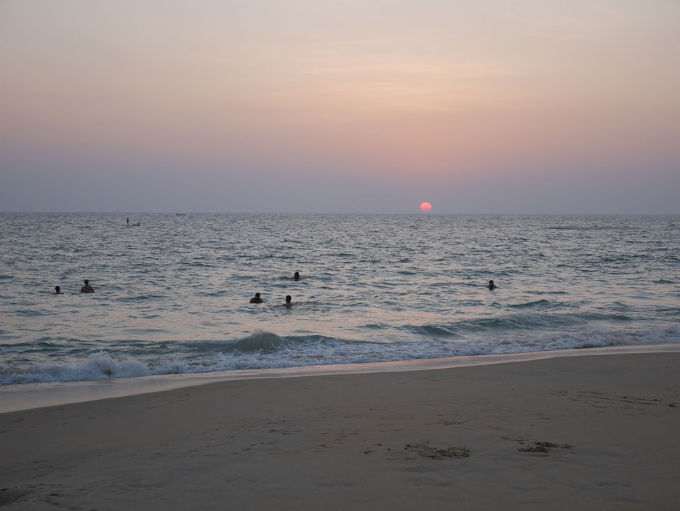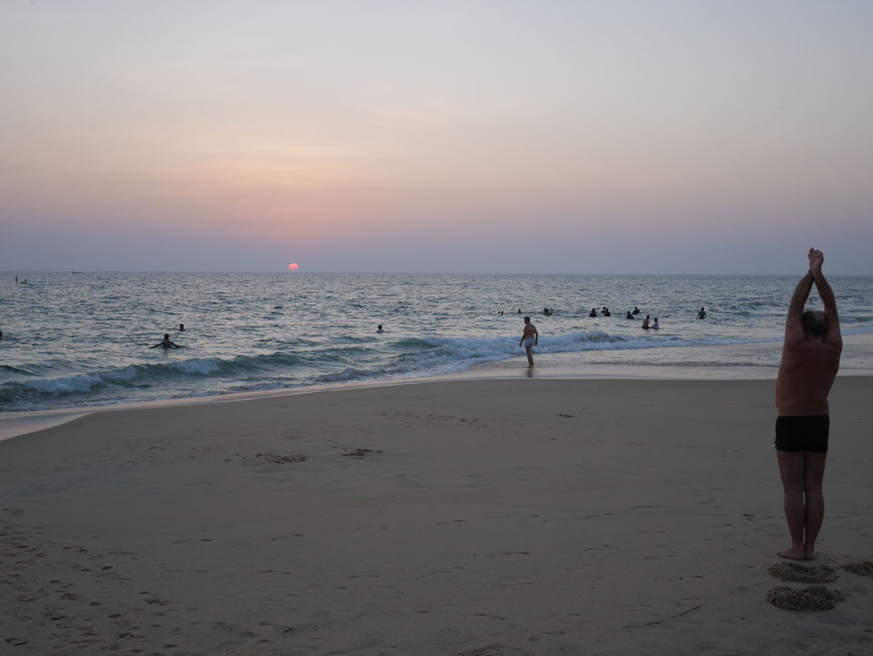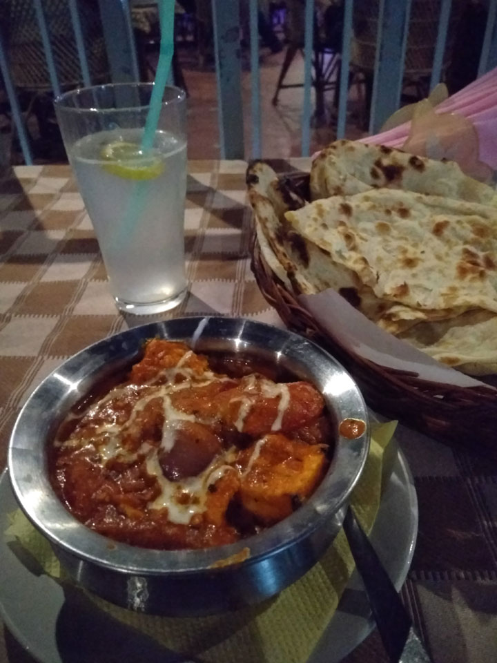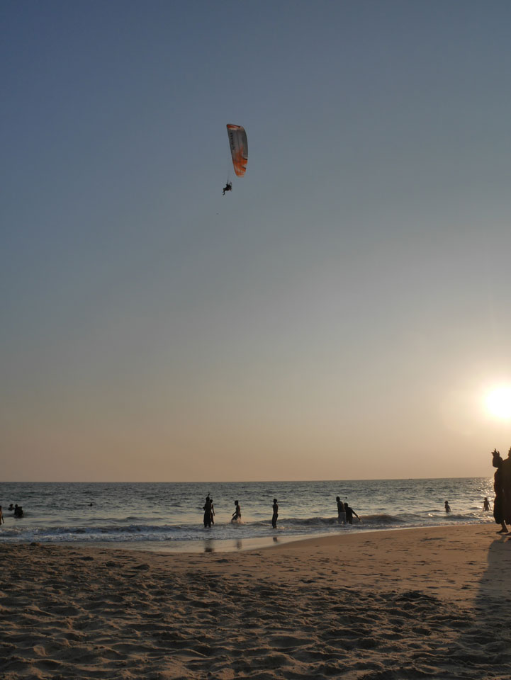 Ein motorisierter Fallschirm flog herum, sicher nett in der Höhe. Nach Sonennuntergang wurden alle aus dem Wasser gepfiffen und ich ging auch wieder auf’s Zimmer. Mehr Internet, was am besten über meinen Handy-AP läuft. Nach 22:00 dann Abendessen. Ich wartete vielleicht ’ne halbe Stunde auf das Paneer Tikka Masala. Das war dann aber gut. Drei Inder rockten zur Musik ab. Wenig los, selbst am Samstag, denn schon kurz nach 23:00 machten die Läden dicht, bis Mitternacht muss alles geschlossen sein.