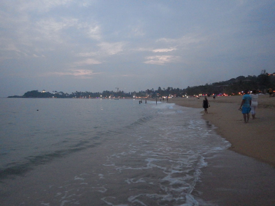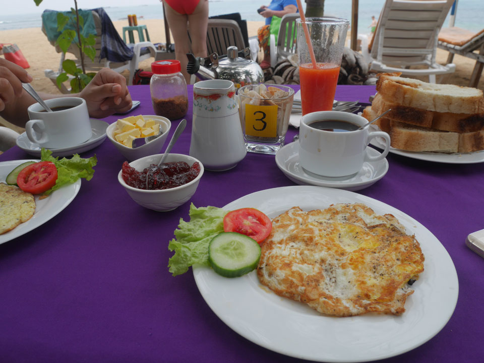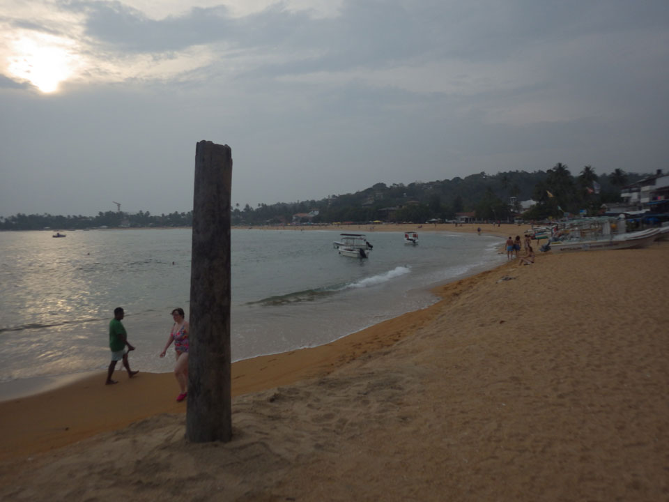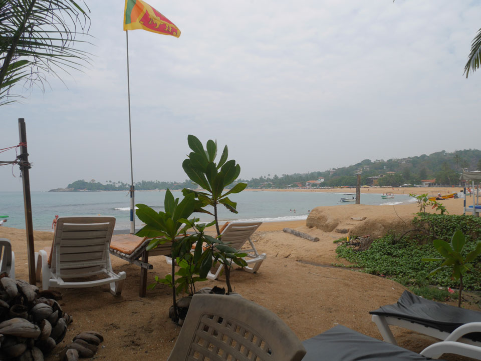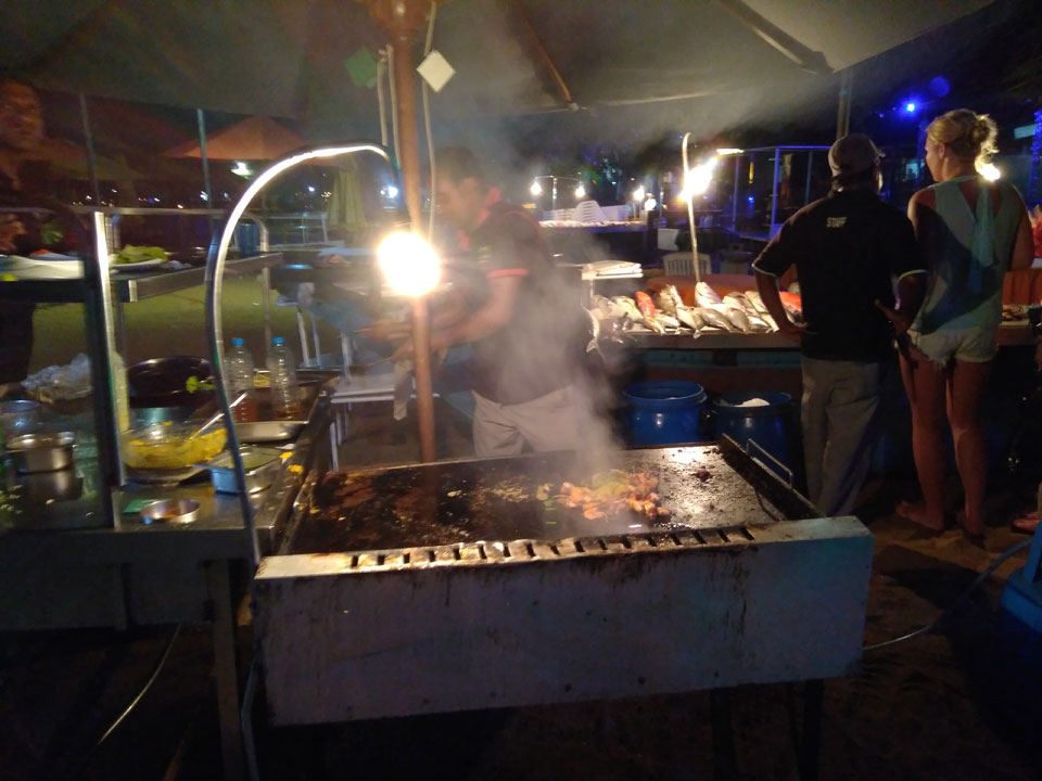 Zum Abendessen probierten wir etwas weiter in der Strandmitte Unawatunas das Lucky Tuny Resort. Die hatten Fisch-BBQ. Ich kannte mich wenig mit den Sachen aus, nahm eine Tunfisch-Gericht einfach aus dem Menü, was aber auch gut schmeckte. Großes Bier zu Zweit, alles bestens. (ca. 2500 LKR = €13)