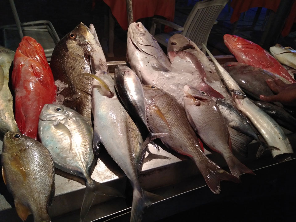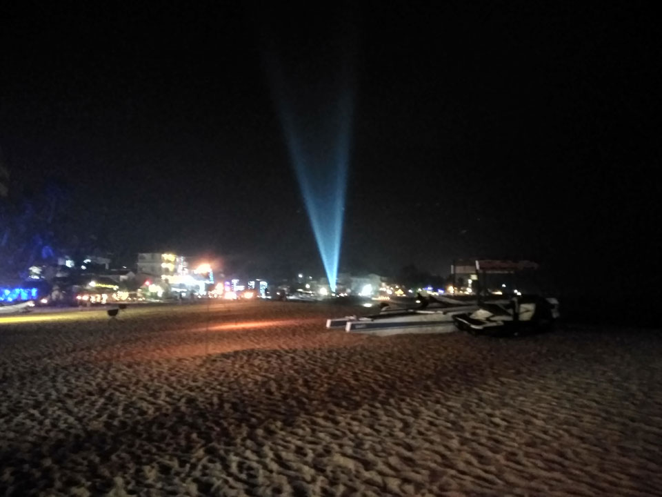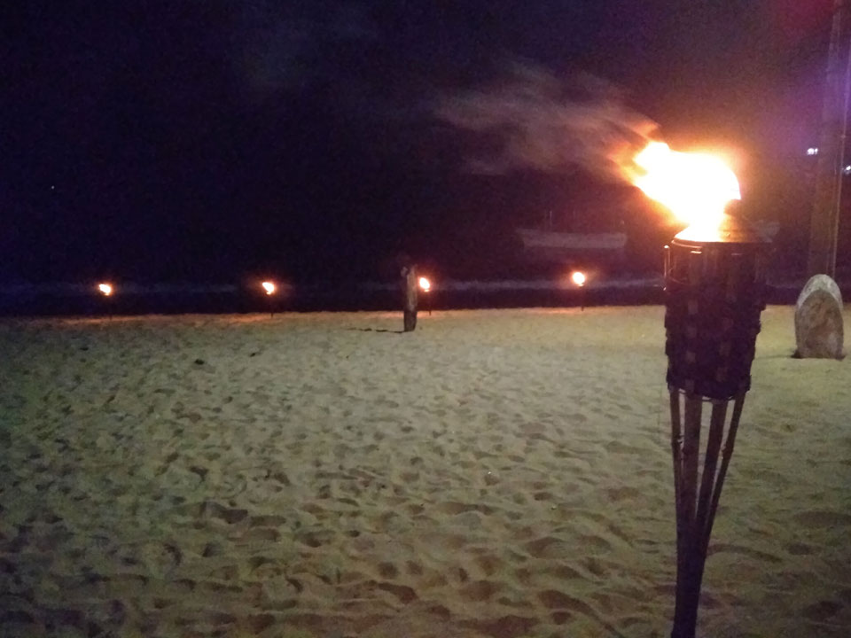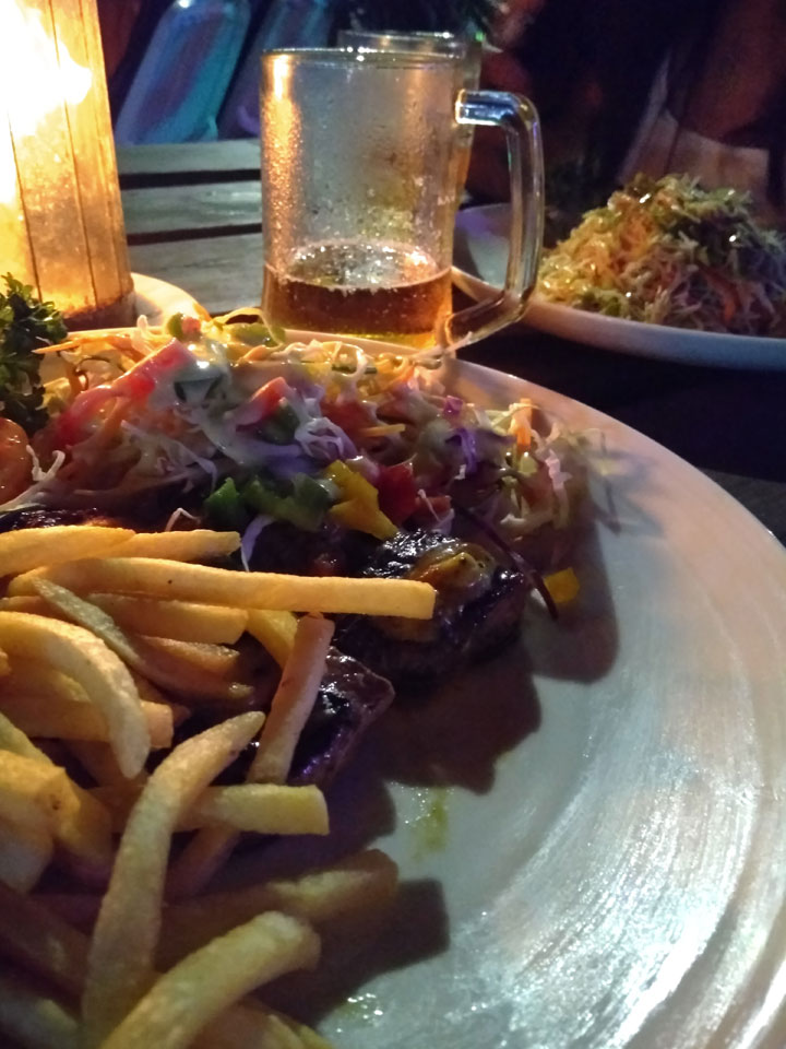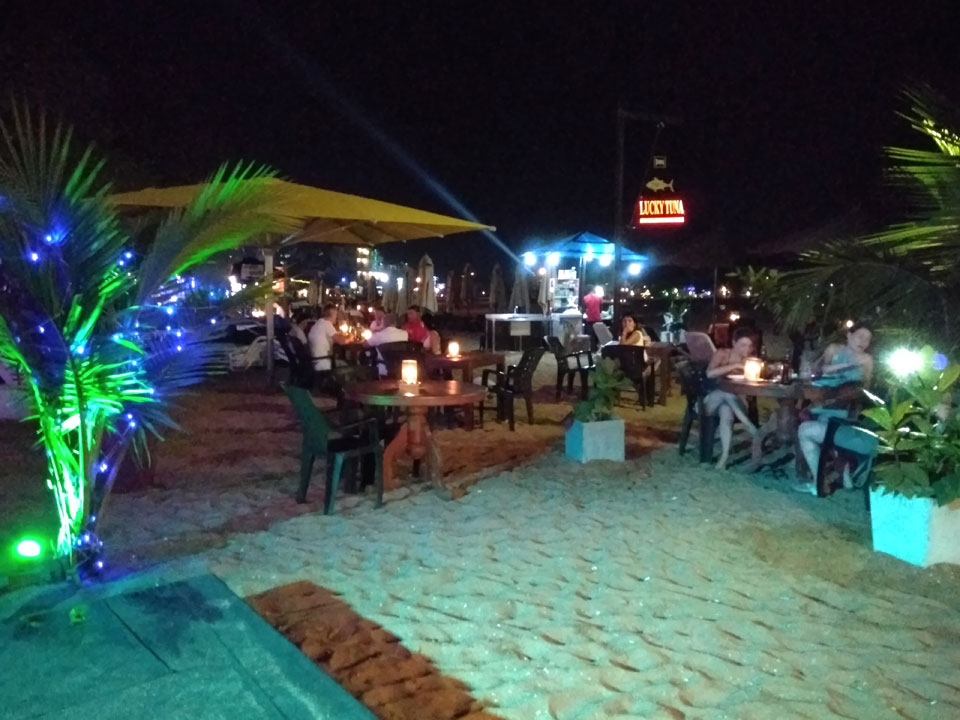 Zum Abendessen probierten wir etwas weiter in der Strandmitte Unawatunas das Lucky Tuny Resort. Die hatten Fisch-BBQ. Ich kannte mich wenig mit den Sachen aus, nahm eine Tunfisch-Gericht einfach aus dem Menü, was aber auch gut schmeckte. Großes Bier zu Zweit, alles bestens. (ca. 2500 LKR = €13)