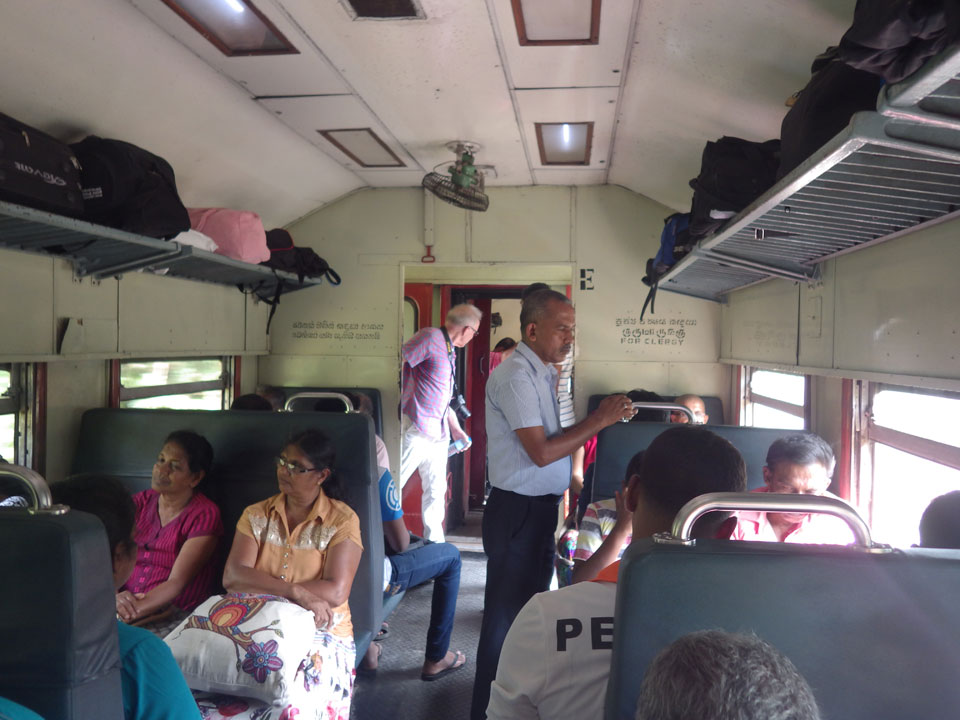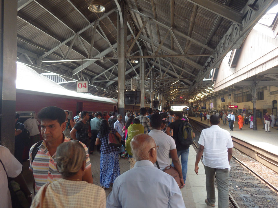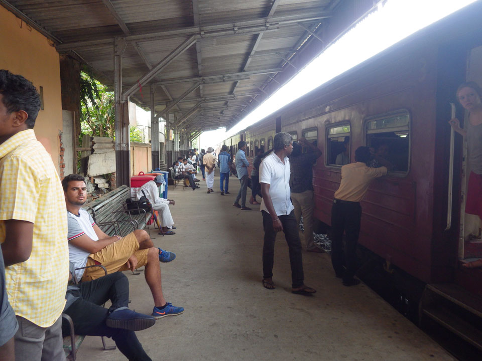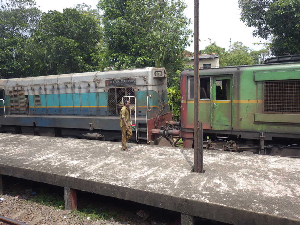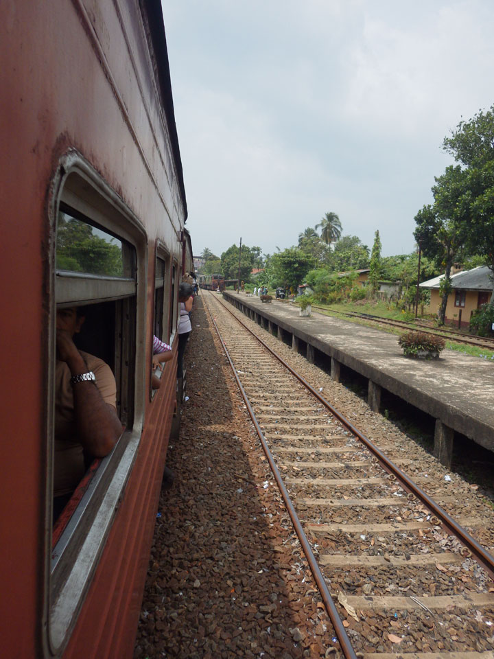 Das Frühstück war wieder OK. Gegen 10:00 erst waren wir draußen, erwischten einen Bus zum Bahnhof. Tickets 3. Klasse (2 x 100) und dann warten. Der Zug kam schon mit etwas Verspätung und danach nicht so richtig aus dem Knick. Bei Ambalangoda kam eine Durchsage und wir warteten. Einige Touristen wurden nach einer halben Stunde ungeduldig, hatten wohl auch Flüge und legten los. Man könnte auch mit dem Bus fahren. Ich bekam nun langsam auch Stress, denn obwohl der Flug erst 18:40 starten sollte, brauchten wir mind. 2h noch nach Colombo und bis zu 1½ h zum Flughafen. Ein junger Deutscher sagte, dass der Triebwagen kaputt sei und man auf den Ersatz wartet. Noch eine halbe Stunde solle es dauert. Es dauerte und dauerte und ich dachte schon, hätte ich nur den Bus genommen doch dann endlich wurde die Bahn abgeschoben und es dauerte nicht lange, bis der neue Triebwagen loslegte.
