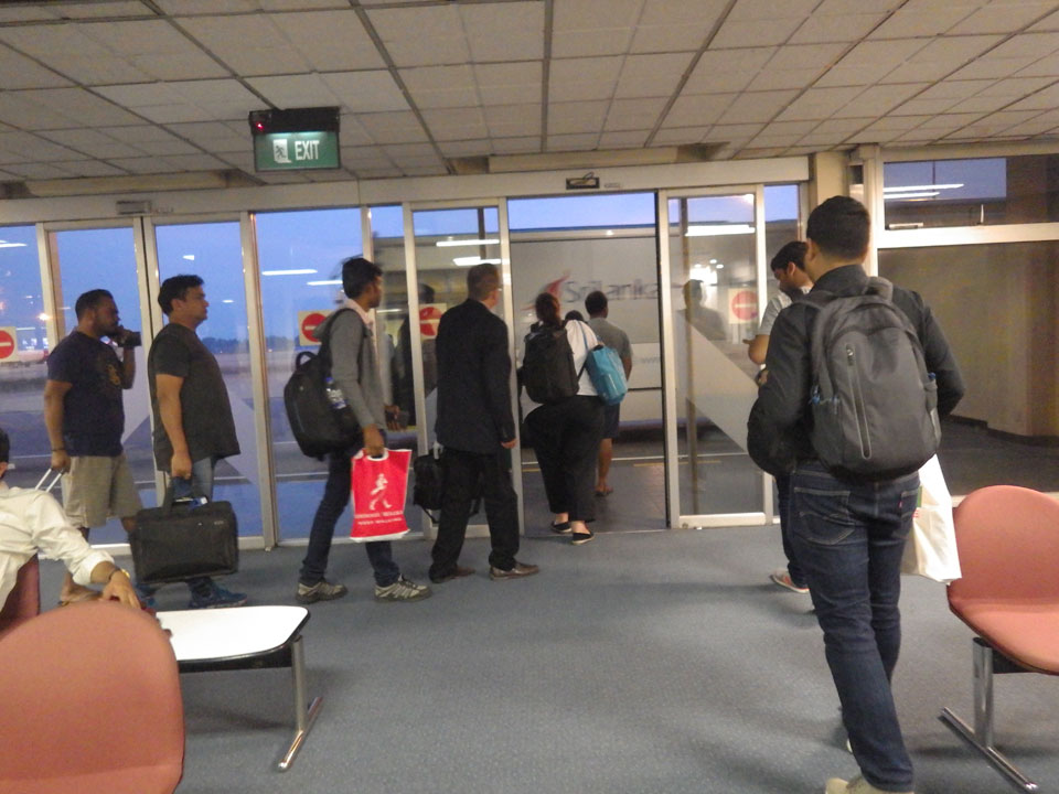 Die Geschwindigkeit war ordentlich für die wackeligen Schienen – um die 70 km/h. Wir kamen nach Colombo mit ca. 2h Verspätung. Ganz schnell fragte ich mich zum Flughafenbus durch, fand ihn, noch zwei Plätze frei auf den Notsitzen und los – 15:25. Wir waren ca. 17:00 auf dem Flughafen (2 x 300) und holten den verstauten großen Koffer ab. Jemand zahlte die 700 für die 7 Tage, packte um.