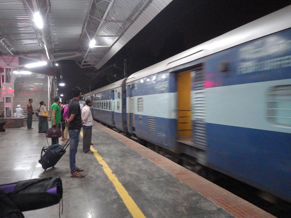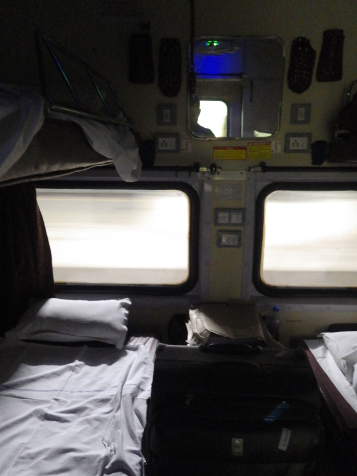 Da waren wir nun auf dem Bahnhof. Im Internet gab’s unterschiedliche Angeben zum Bahnsteig – war dann aber Nr. 5. Das hieß, dass ich den 24,2kg noch weitere Stufen auf- und ab-tragen durfte. Relativ fertig nun auch mit den Nerven machten es die vielen Mücken in der indischen Nacht nicht einfacher. Der Zug kam mit ca. 30′ Verspätung an. Unser AC1 Wagon war am vorderen Zugteil und wir hasteten um die 100m mit den ganzen Sachen dahin. Der Schaffner hatte uns auf der Liste, die Betten waren frei – am Ende also klappte doch alles.