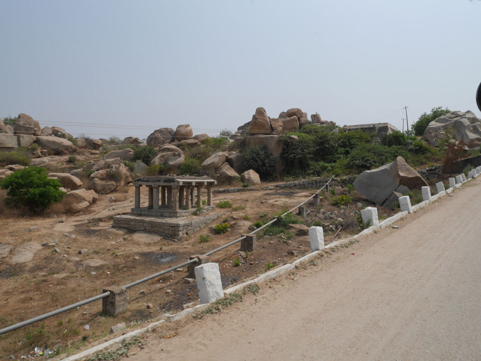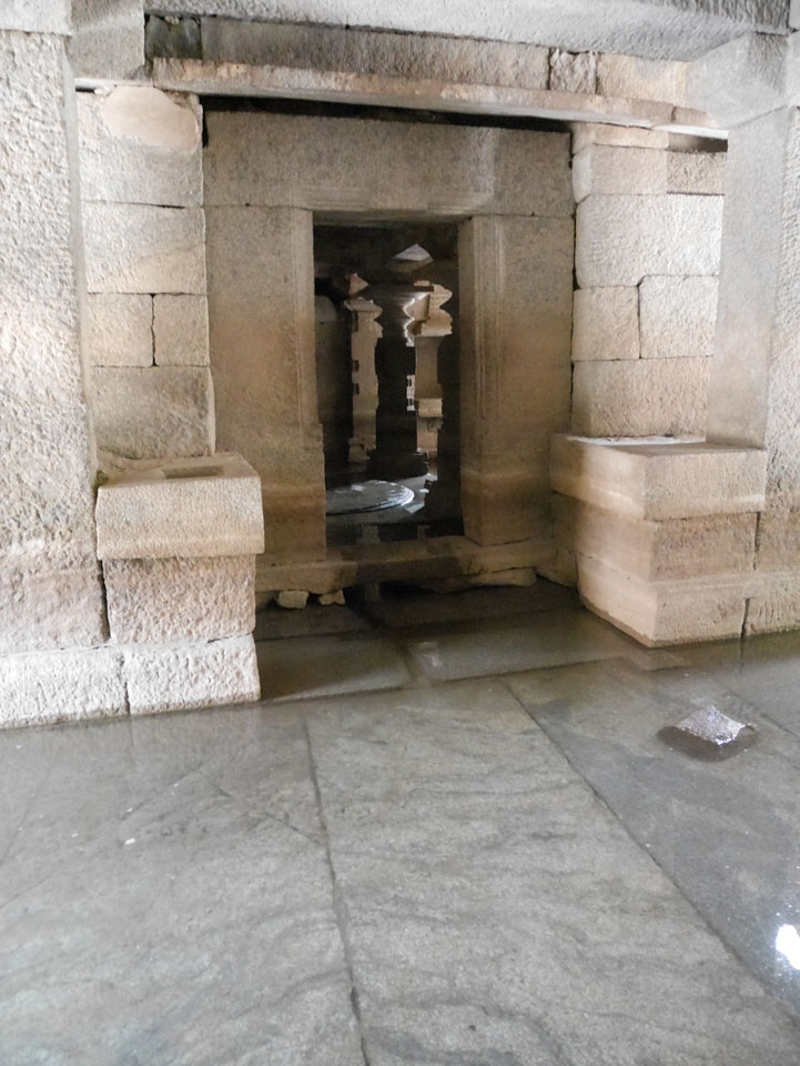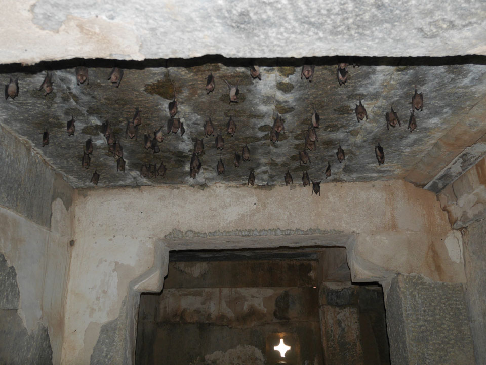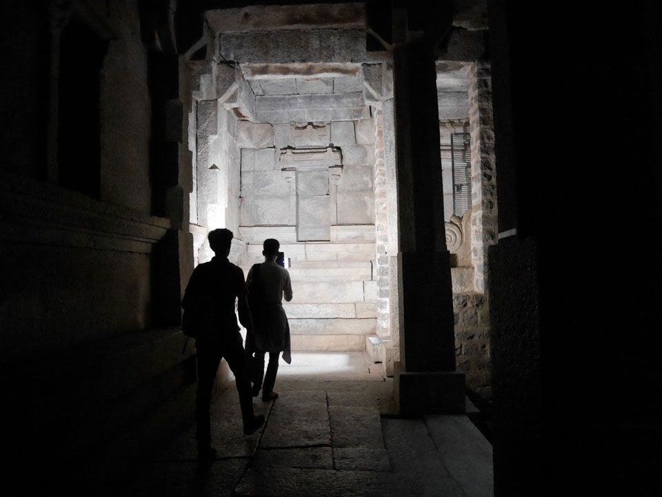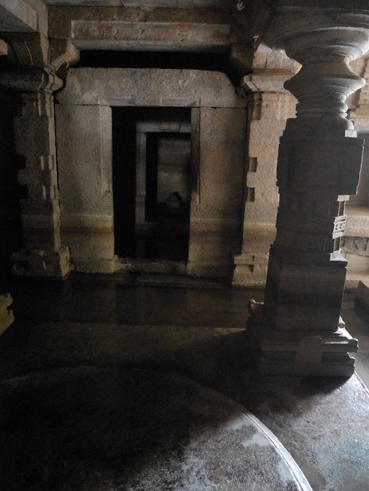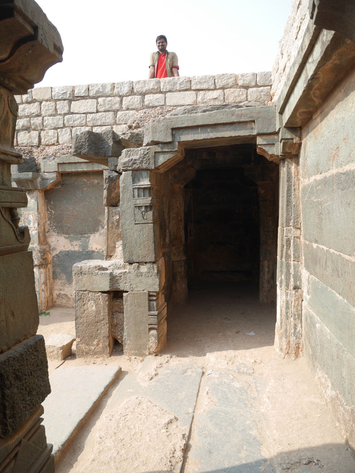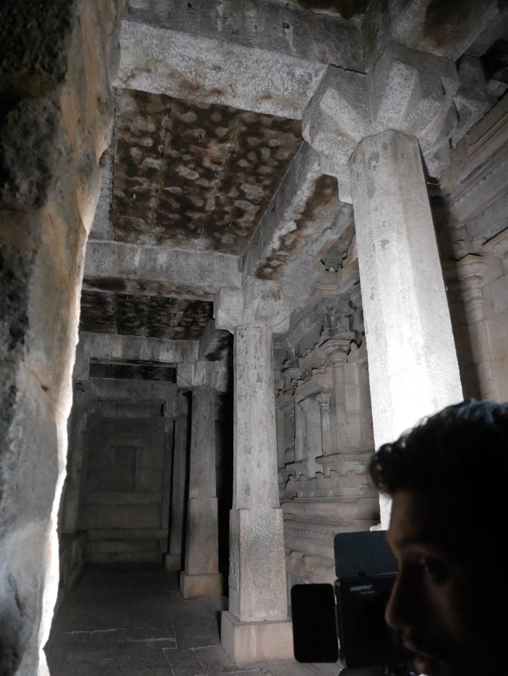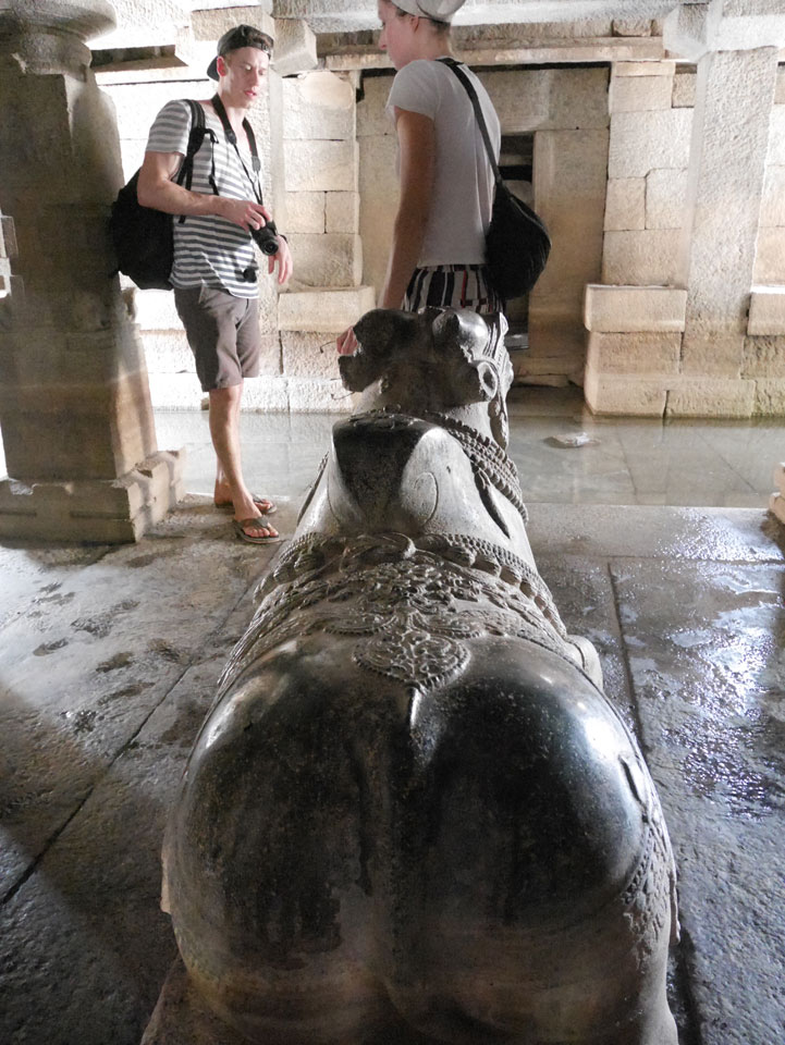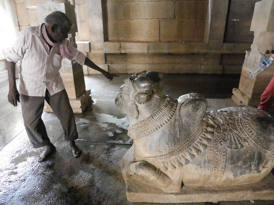 Ich sagte nur 600 zu + 100 Trinkgeld, wenn alles gut ist. Damit war der Fahrer zufrieden und wir fuhren los. Gleich am Ortsausgang Hampis war schon der erste Tempel, den ich nicht kannte. Gleich weiter ging’s zu einem mit Wasser zur Kühlung der Räume. Eine alte Frau führte durch und zeigte auf Fledermäuse an der Decke. Die 20 INR Trinkgeld waren OK für die Hobby-Führung in paar Minuten.