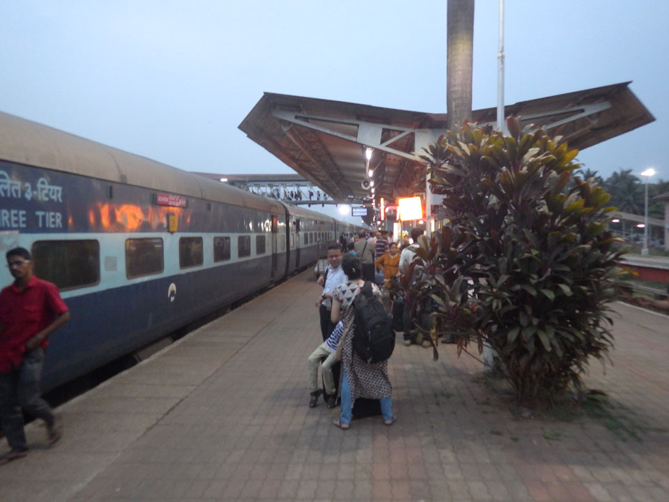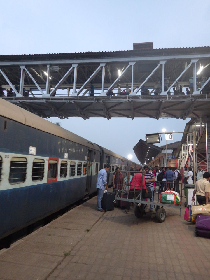 Die Fahrt zog sich. Der Zug zuckelte durch die Pampa. Internet gab’s nur ab und zu, gegen 18:30 kamen wir an in Madgaon. Erst mal Cash, dann ein Tuktuk (200 INR) nach vielen Abweisungen gefunden. Der Koffer lag auf dem Dach und blieb glücklicherweise auch da.