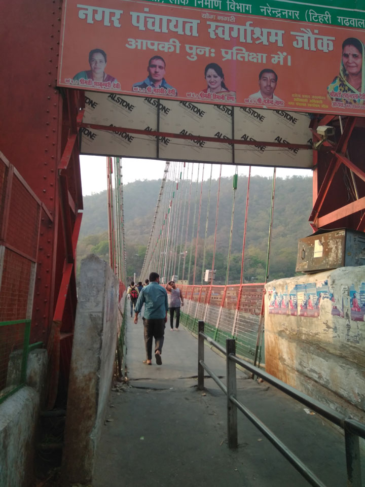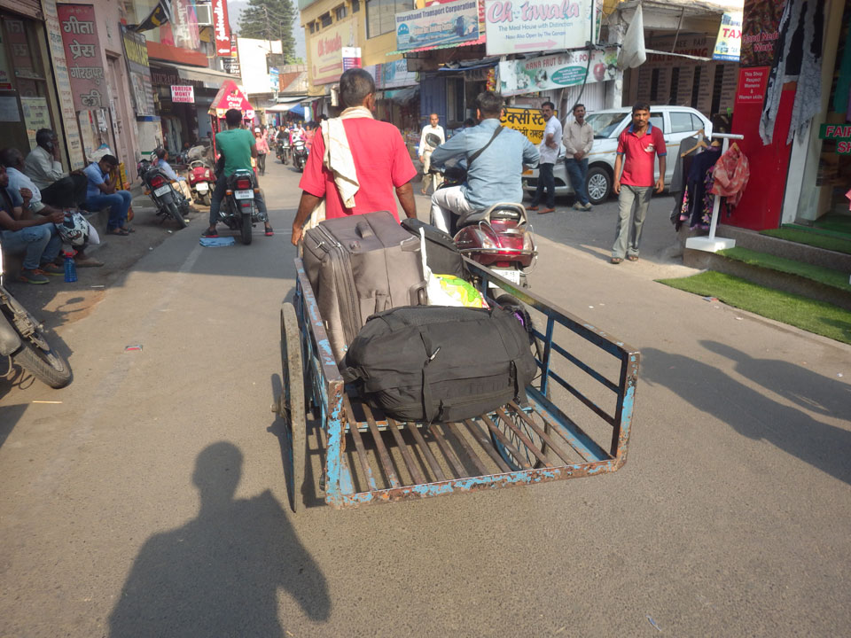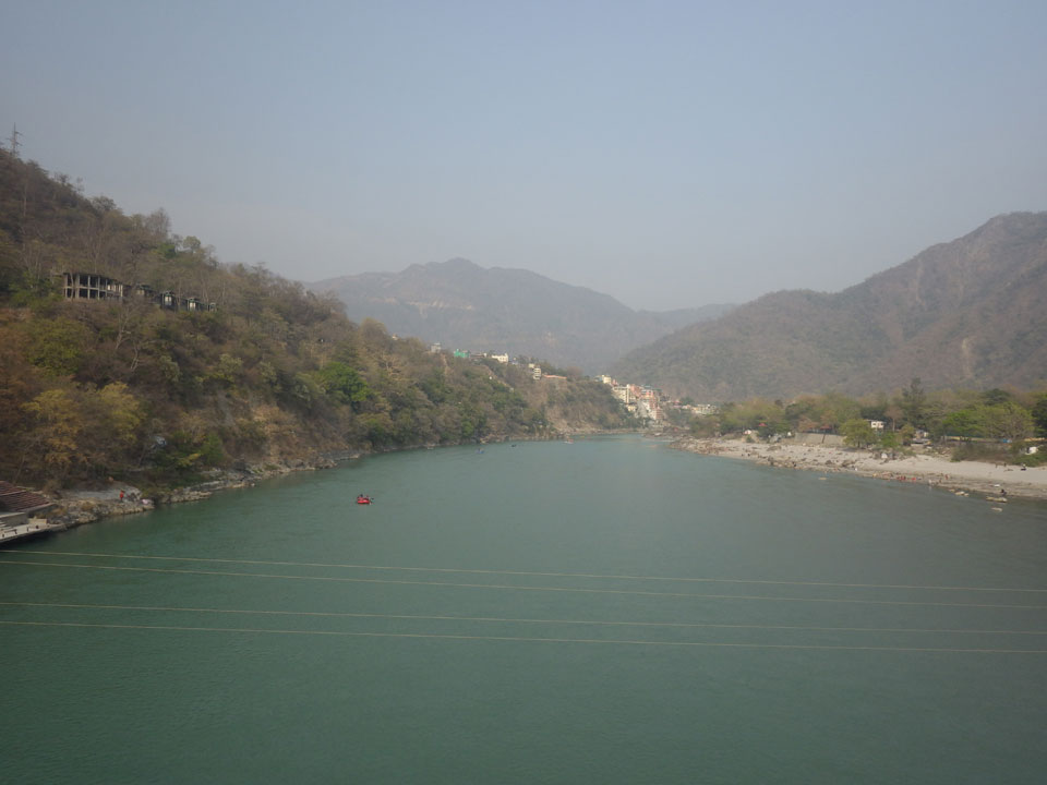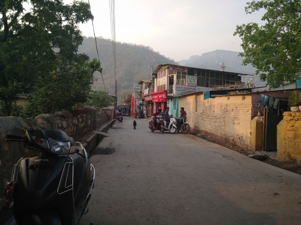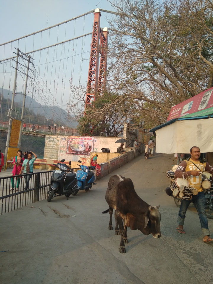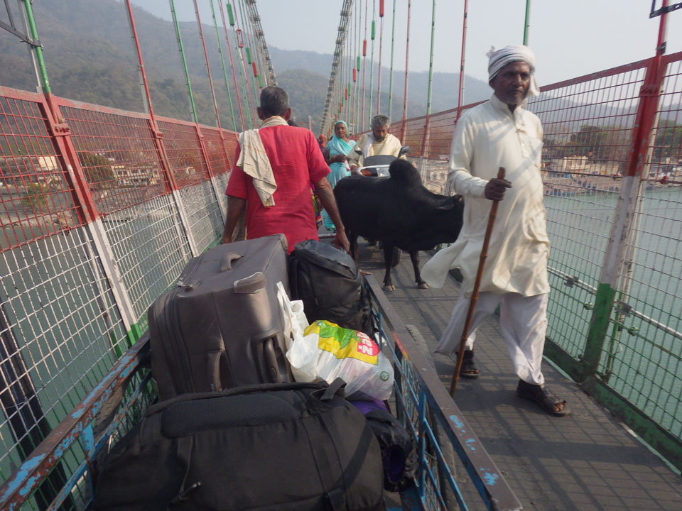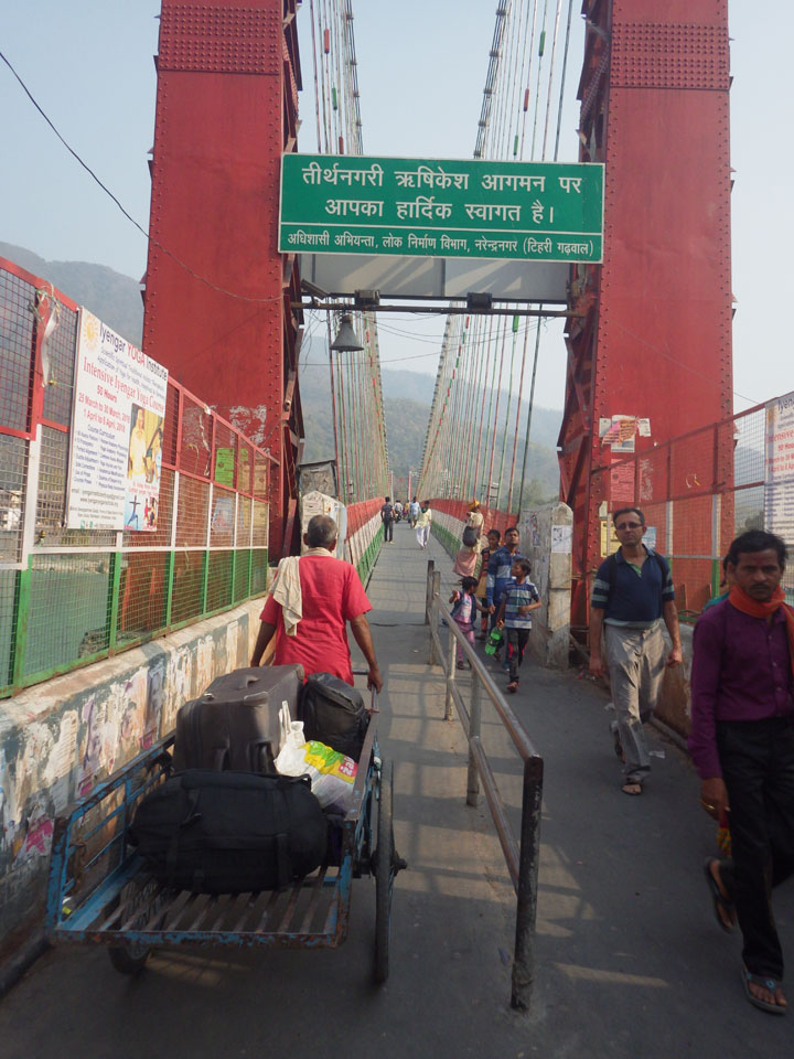 Eine Pause gab’s auch, wo ich nur Getränke kaufte. Zuckersäfte und Wasser waren am wichtigsten. Wir kamen schließlich nach Haridwar und auf einer Buckelpiste nach Rishikesh. Erst mal geschafft. Mit einem Tuktuk (150 INR) ging’s nach Ram Jhula, dem Ort, an dem jemand ihren Yoga Kurs gebucht hatte. Ich war kaum in der Lage den Koffer herumzutragen. Der Tuktuk-Fahrer sagte, dass es da Kulis gäbe und ja, in der Tat kam gerade einer mit seinem Wagen vorbei. Wir machten den Preis aus, er wollte heftige 300 INR für die Sachen.