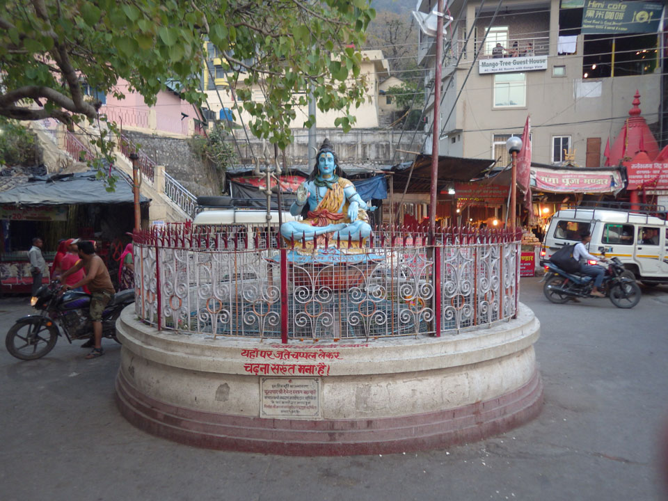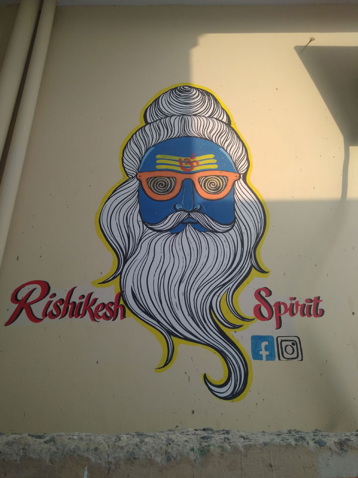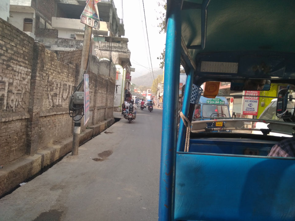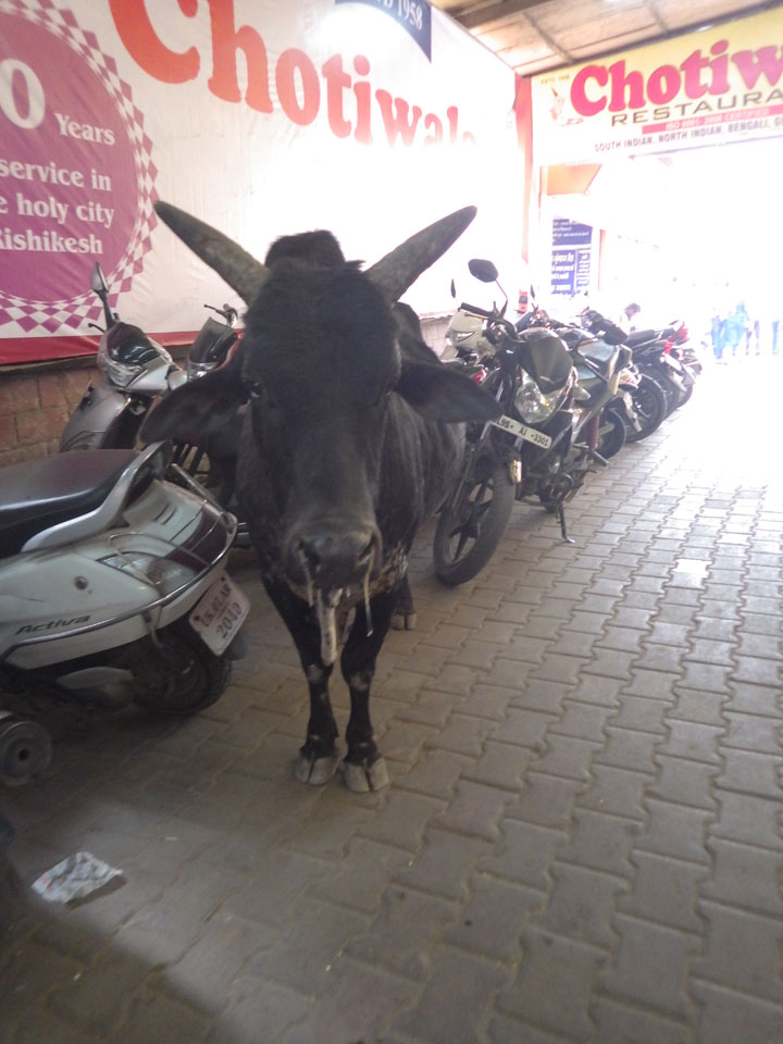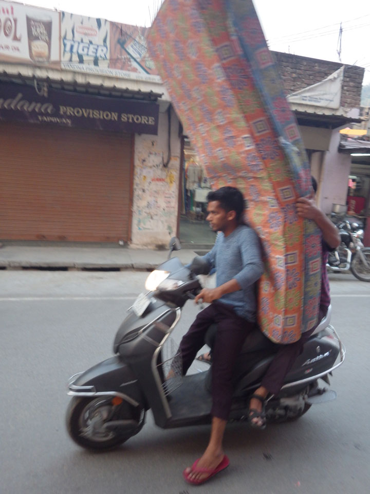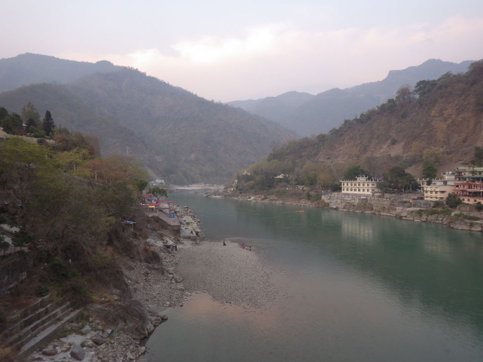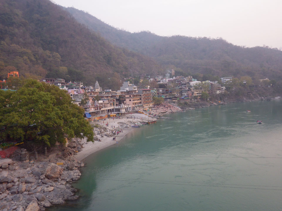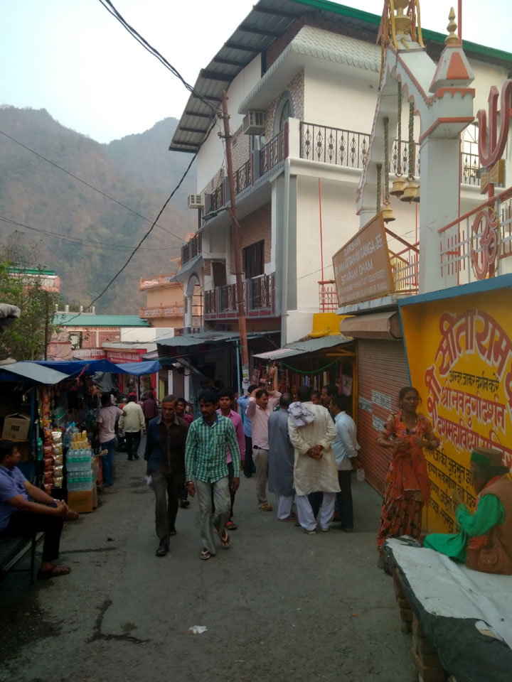 Eine Pause gab’s auch, wo ich nur Getränke kaufte. Zuckersäfte und Wasser waren am wichtigsten. Wir kamen schließlich nach Haridwar und auf einer Buckelpiste nach Rishikesh. Erst mal geschafft. Mit einem Tuktuk (150 INR) ging’s nach Ram Jhula, dem Ort, an dem jemand ihren Yoga Kurs gebucht hatte. Ich war kaum in der Lage den Koffer herumzutragen. Der Tuktuk-Fahrer sagte, dass es da Kulis gäbe und ja, in der Tat kam gerade einer mit seinem Wagen vorbei. Wir machten den Preis aus, er wollte heftige 300 INR für die Sachen.